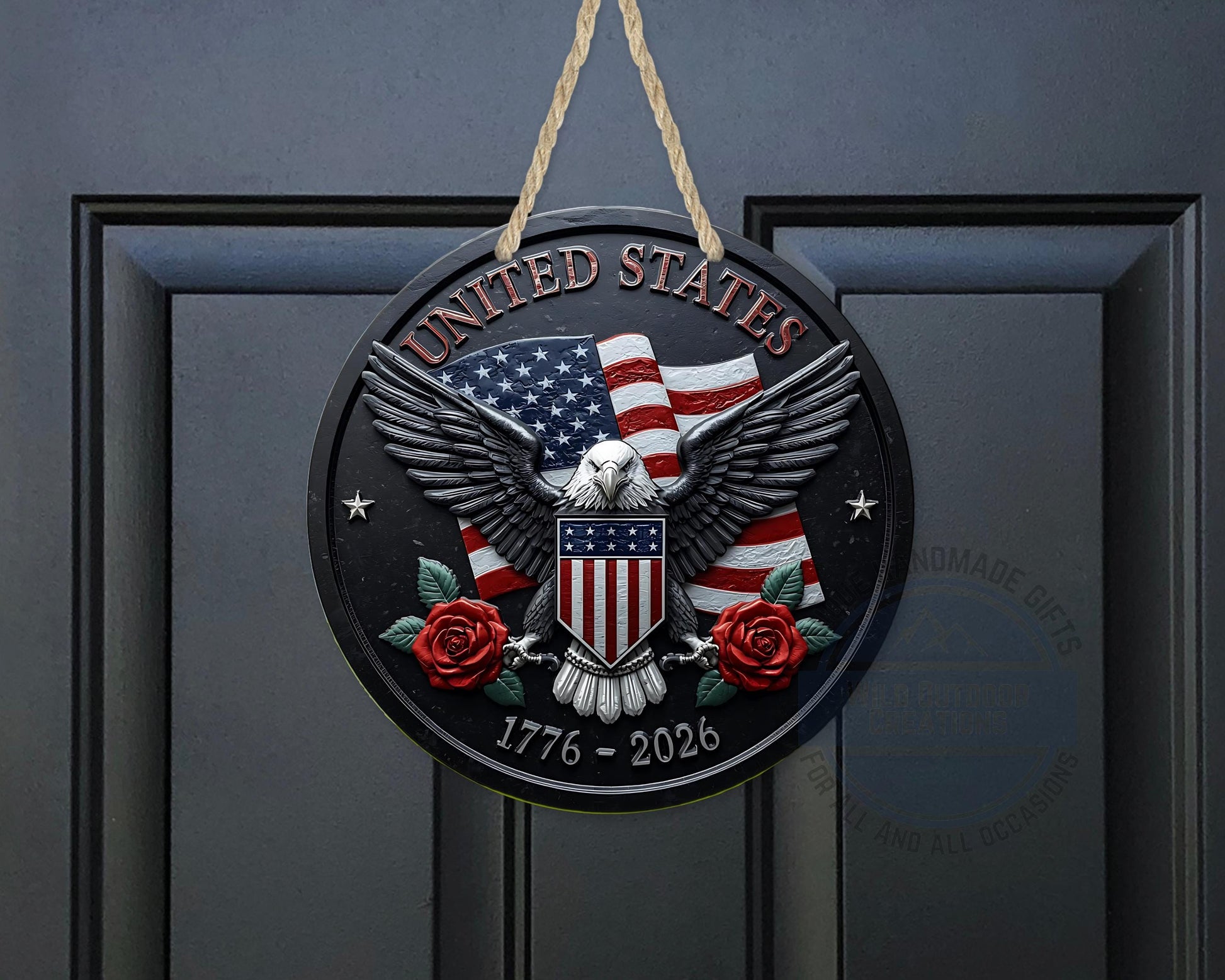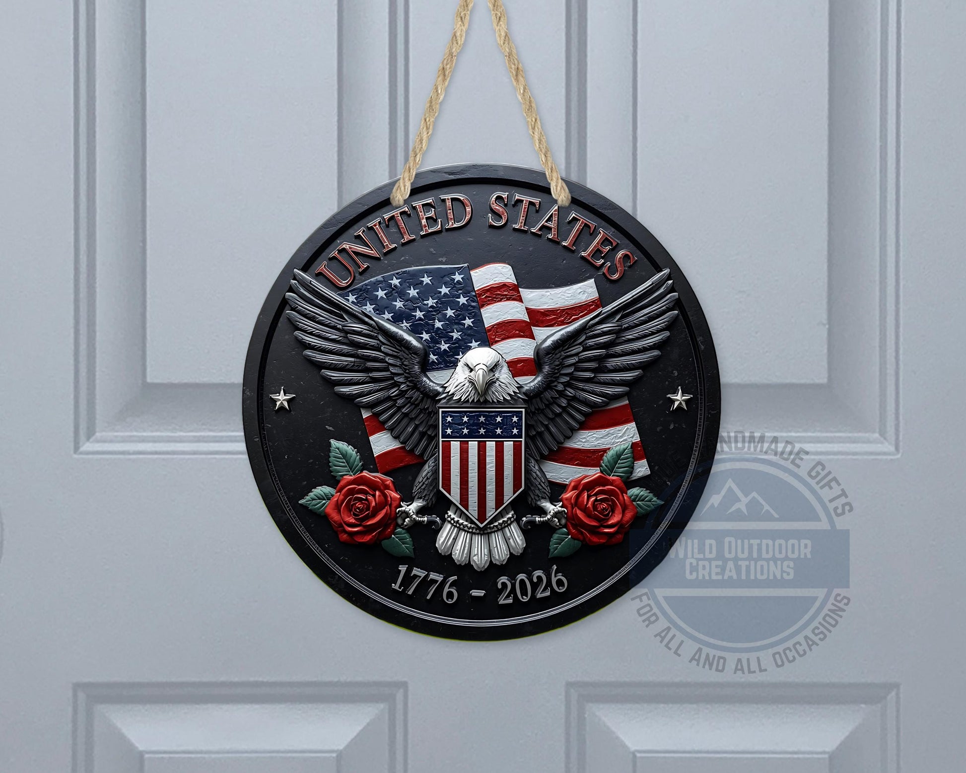 Crafted for both indoor and outdoor use, this round metal door sign includes a sturdy hanging string for easy display on any front door or wall. The detailed bald eagle decoration is complemented by patriotic elements such as roses and historic dates from 1776 to 2026, enhancing its appeal as patriotic home decor that celebrates heritage.