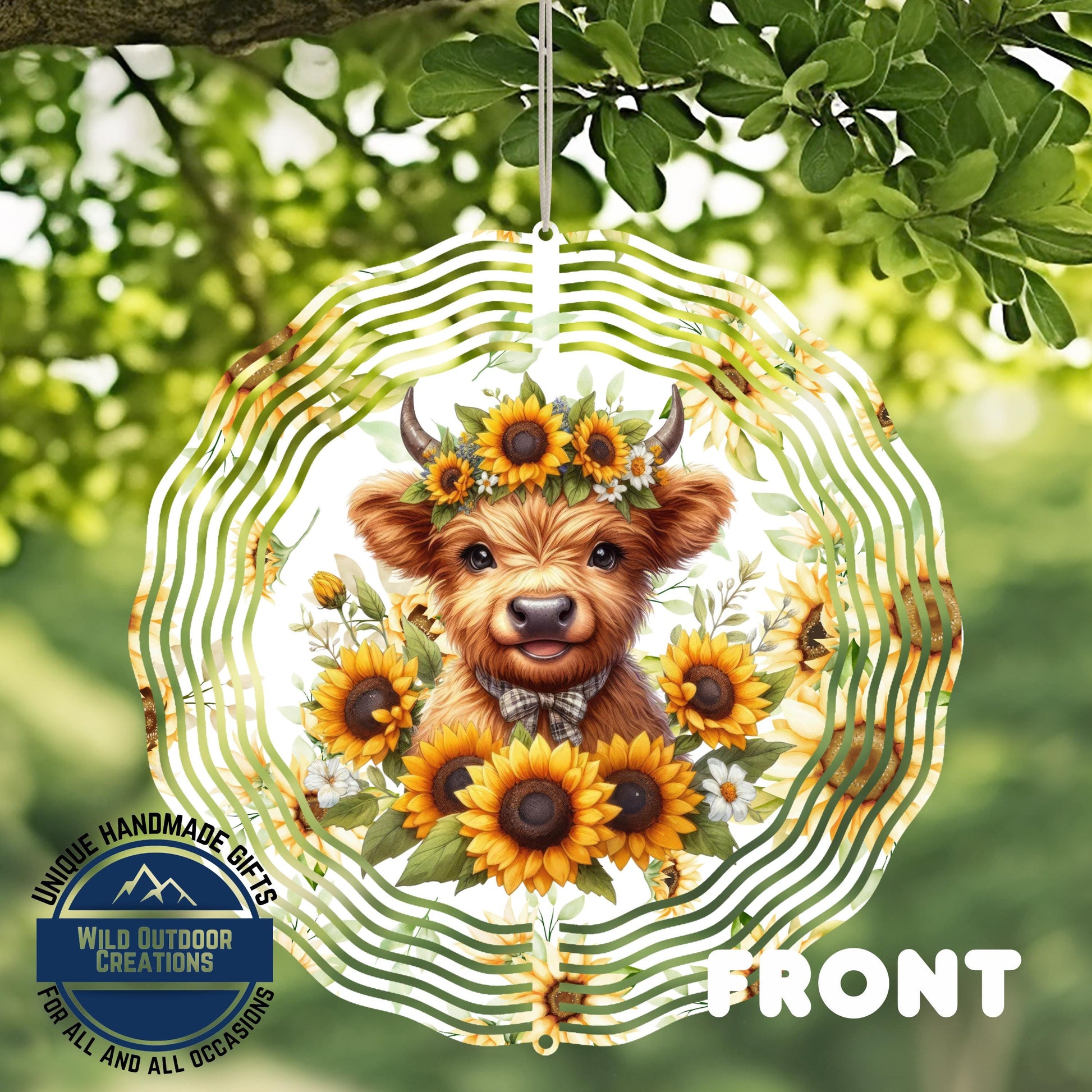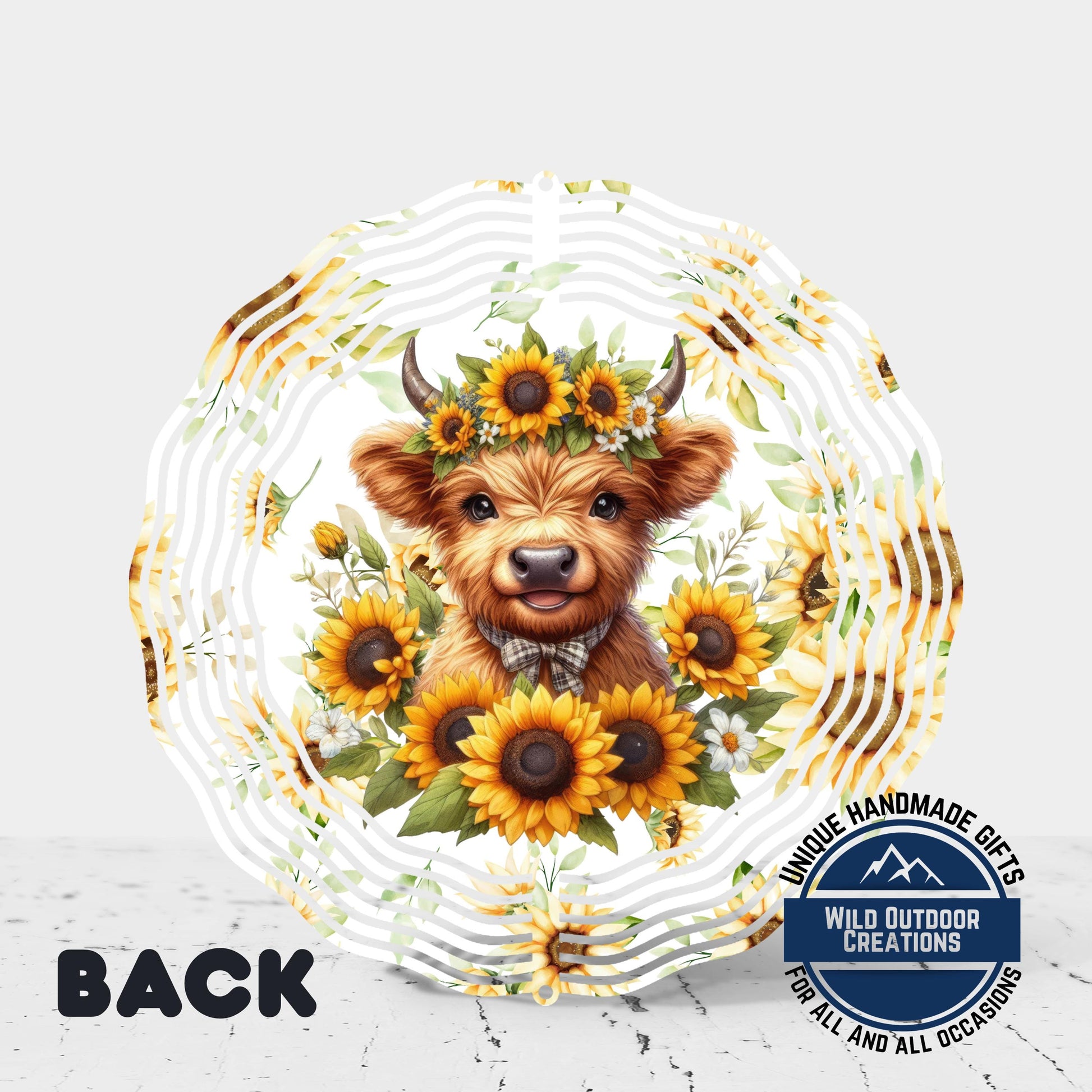 Baby Highland Cow Spinner - Rustic Garden Decor | Sunflower Crown Wind Spinner
