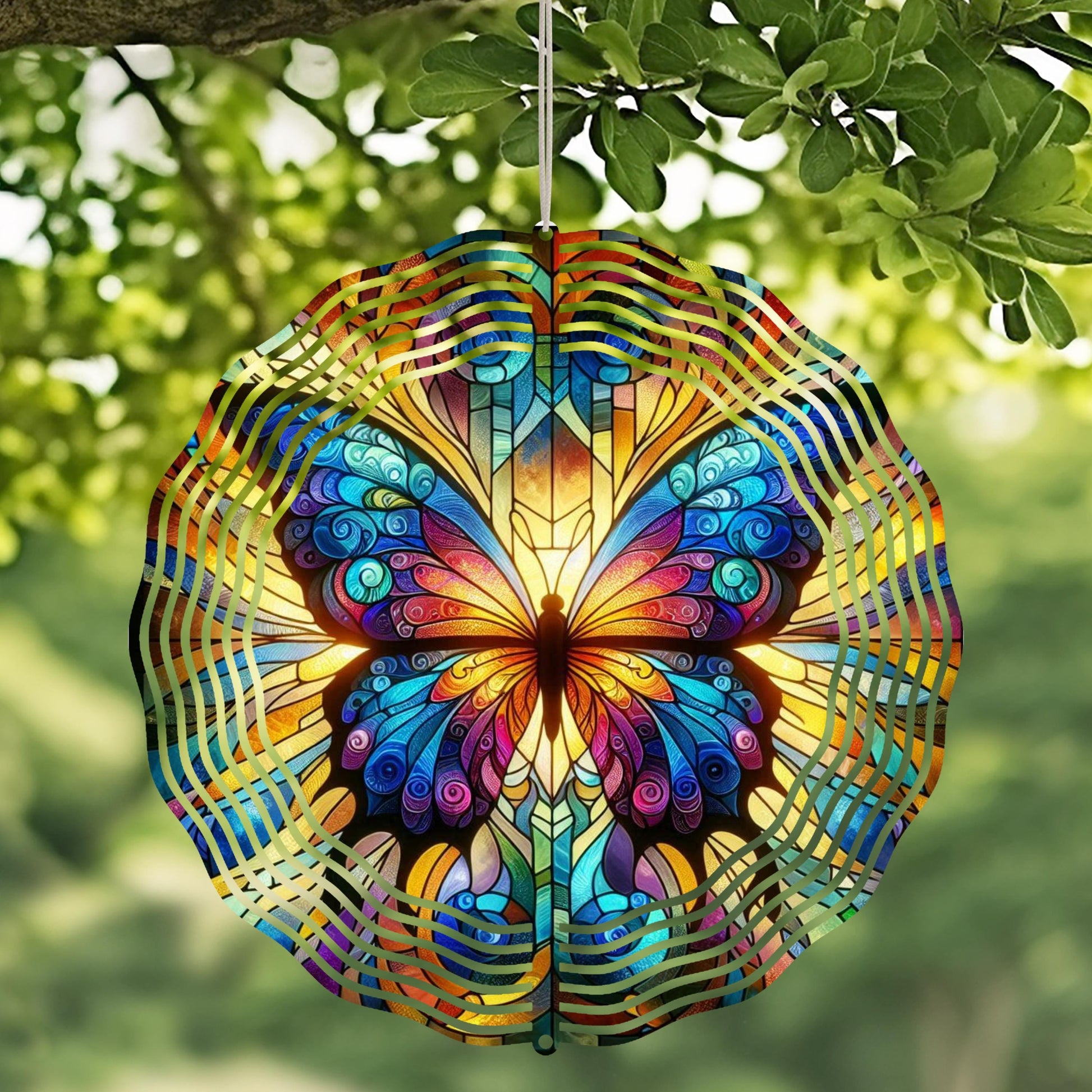 Bring a splash of color and movement to your outdoor space with this stunning *vibrant butterfly wind spinner*. Crafted from durable metal, this 10x10 inch double-sided piece features a beautifully detailed faux stained glass design in shades of blue, green, orange, and yellow. The rich, vibrant colors create a luminous effect when the wind catches it, making it a captivating centerpiece in your garden or patio.