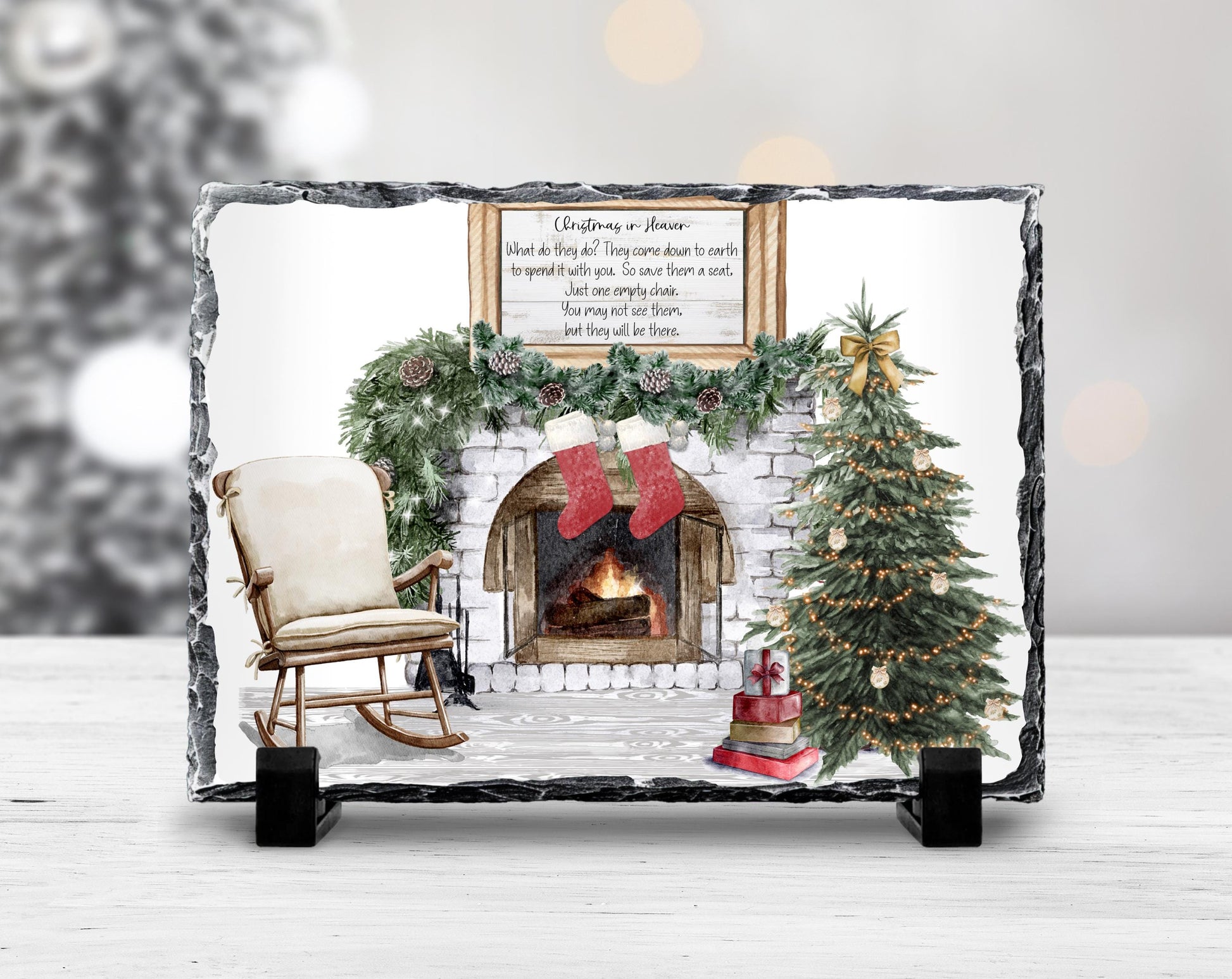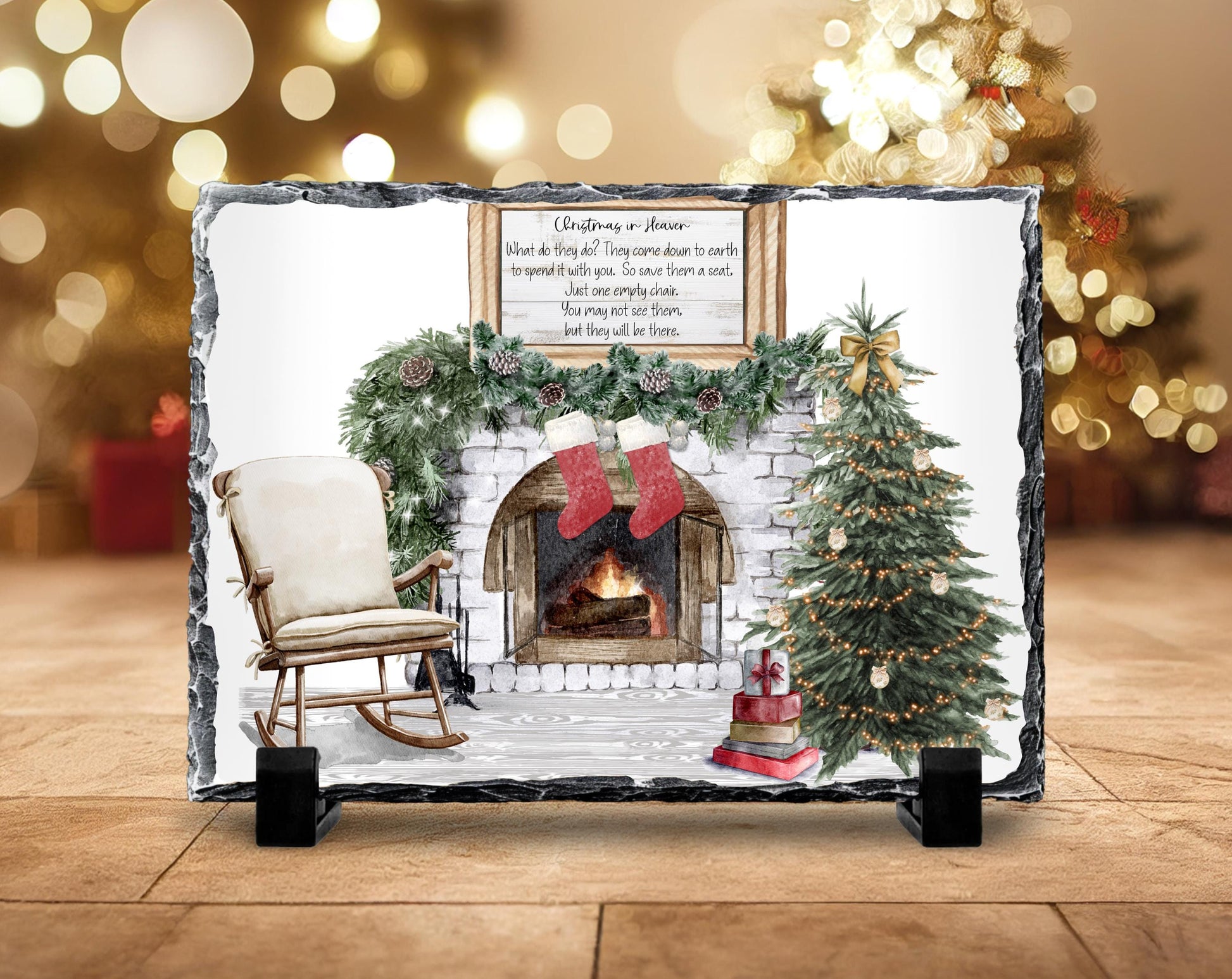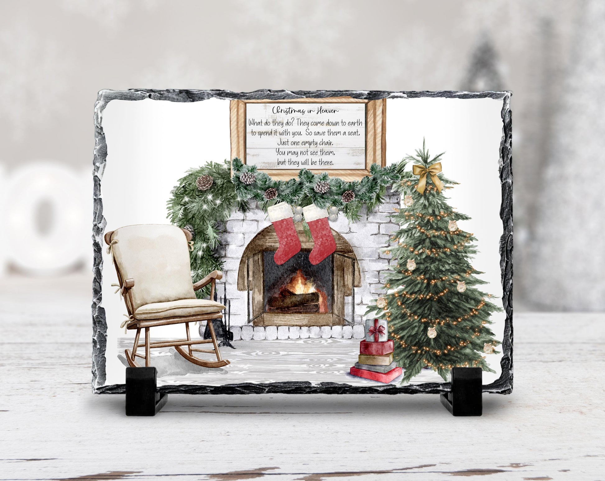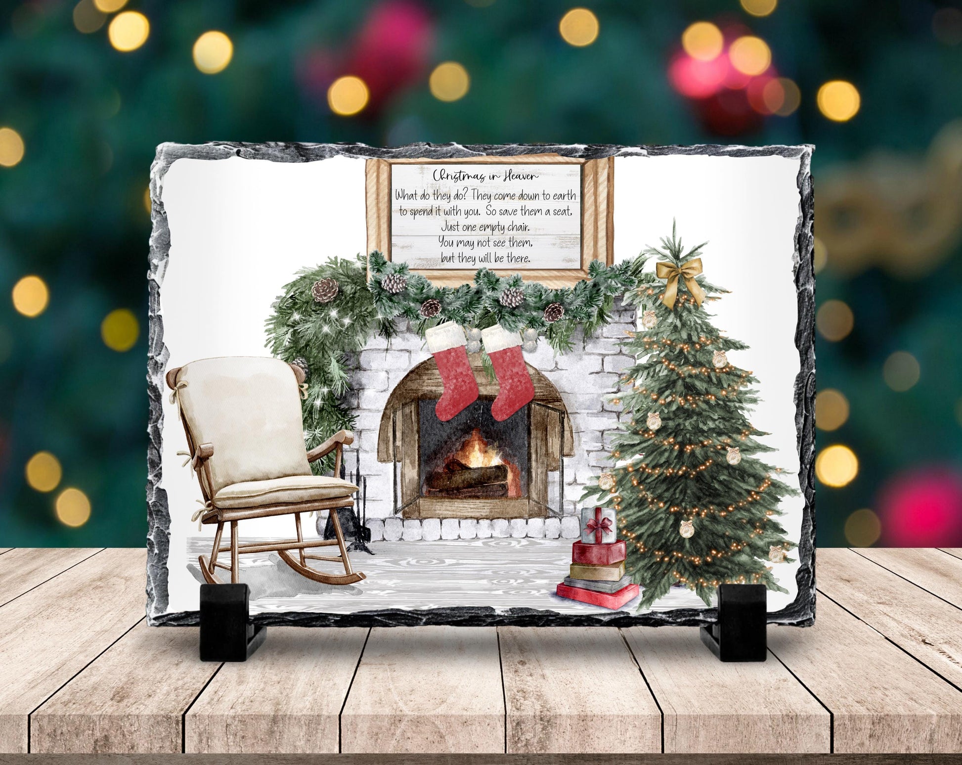 Celebrate the spirit of remembrance this holiday season with our handcrafted natural slate sign, featuring beautifully fractured edges that enhance its rustic charm. Measuring 5.85 x 7.8 inches (with slight variations of up to -0.4"), this decorative piece showcases a cozy fireplace scene adorned with stockings, garland, and a Christmas tree, along with the heartfelt quote: "Christmas in Heaven. What do they do? They come down to earth to spend it with you. So save them a seat. Just one empty chair."