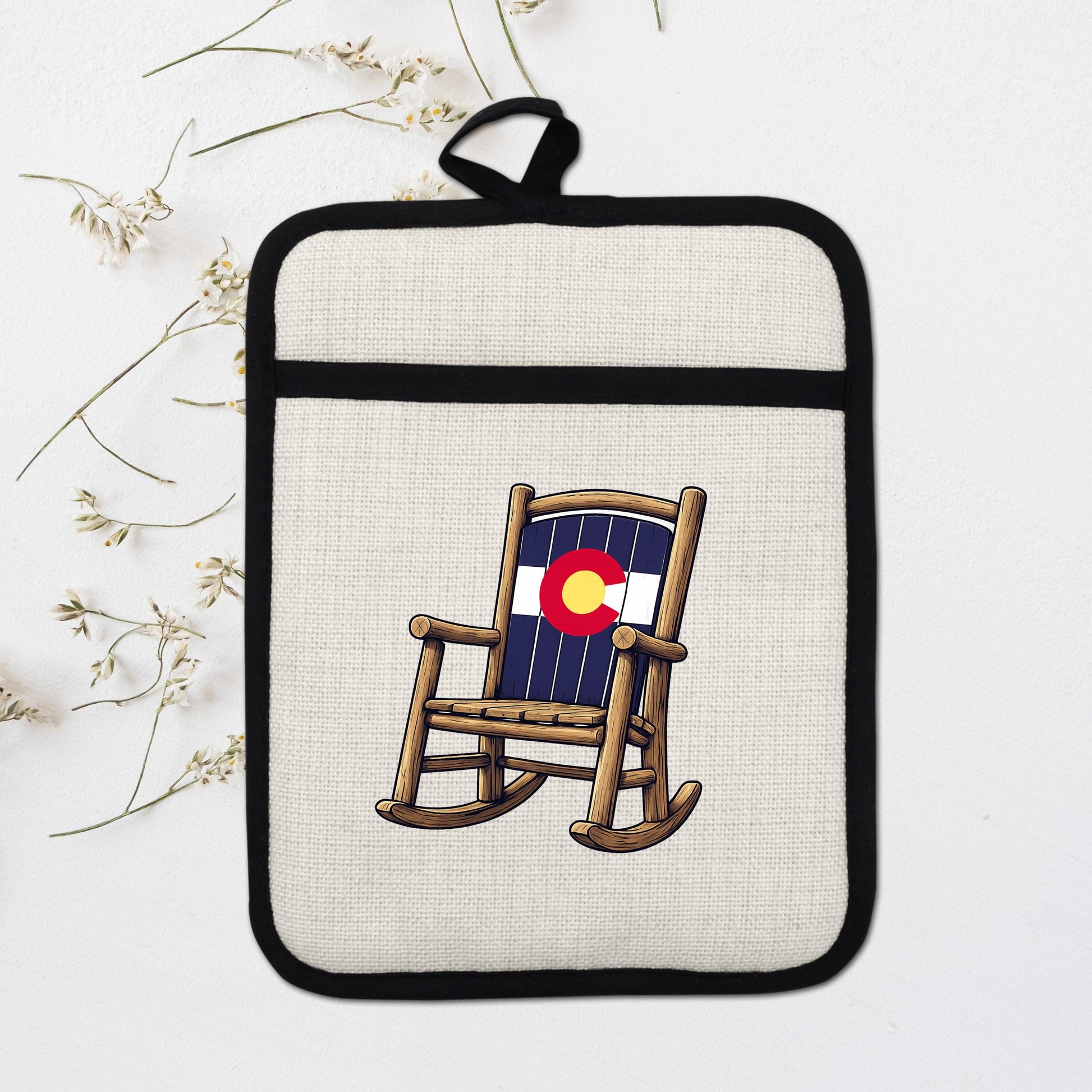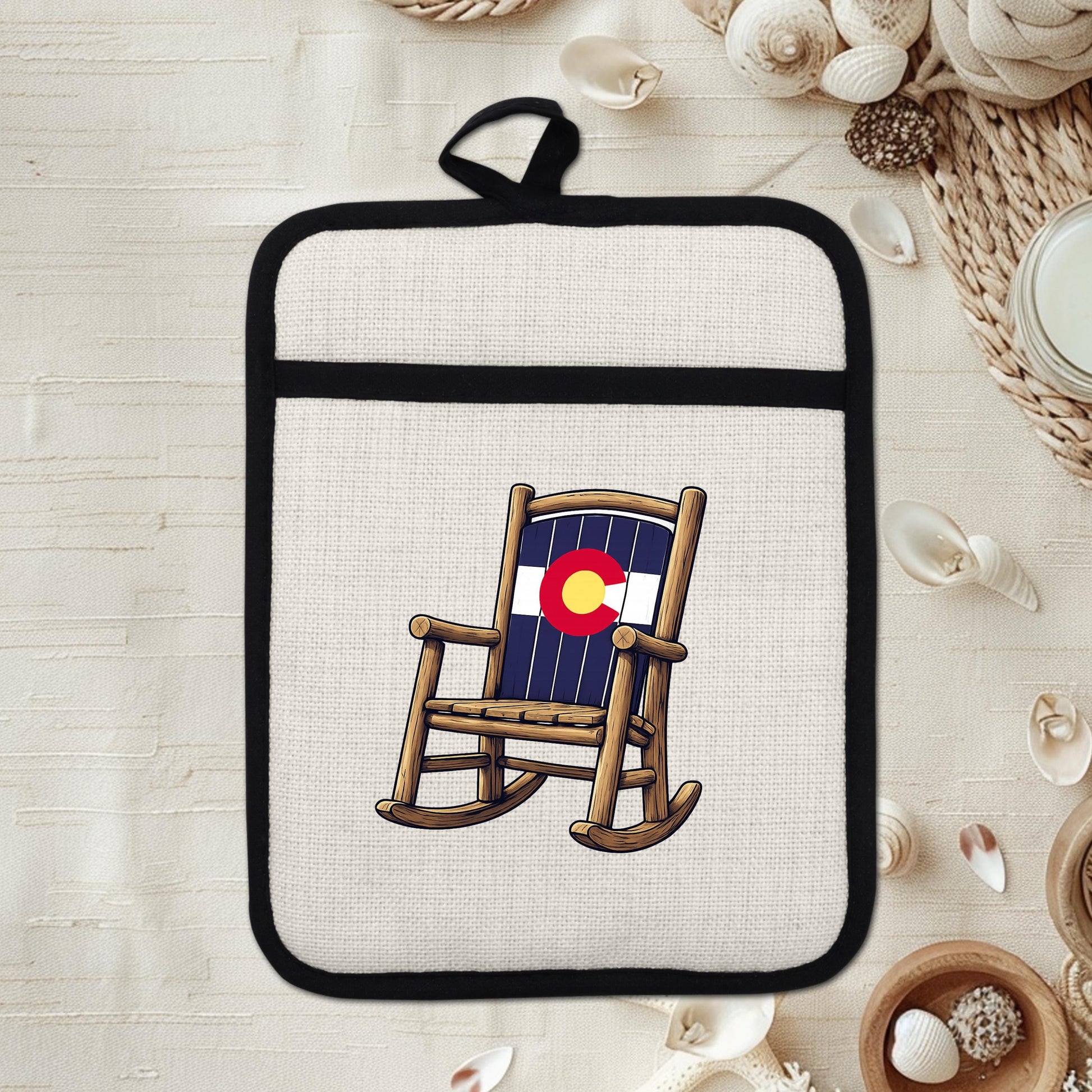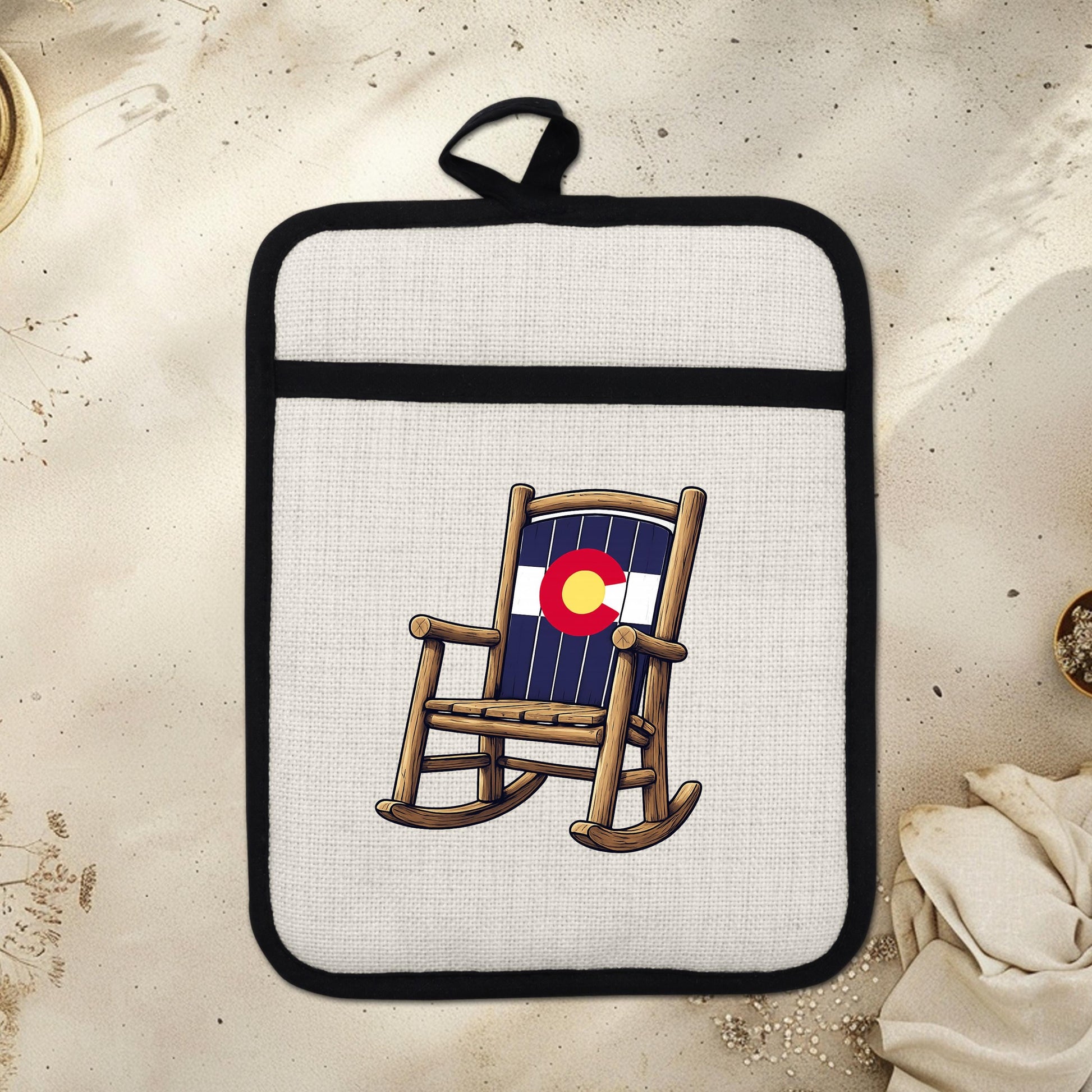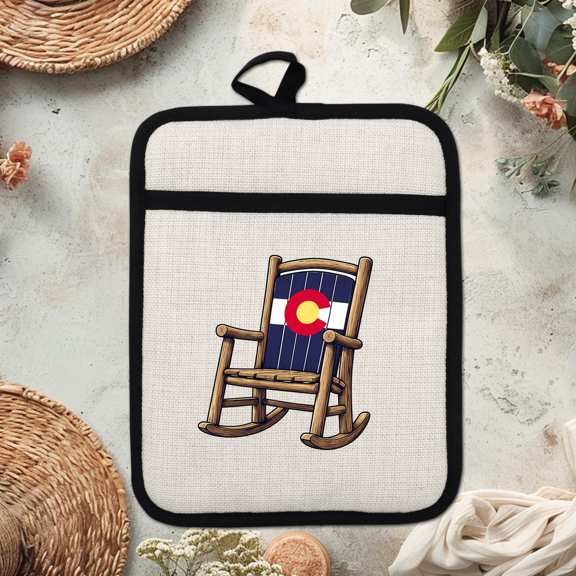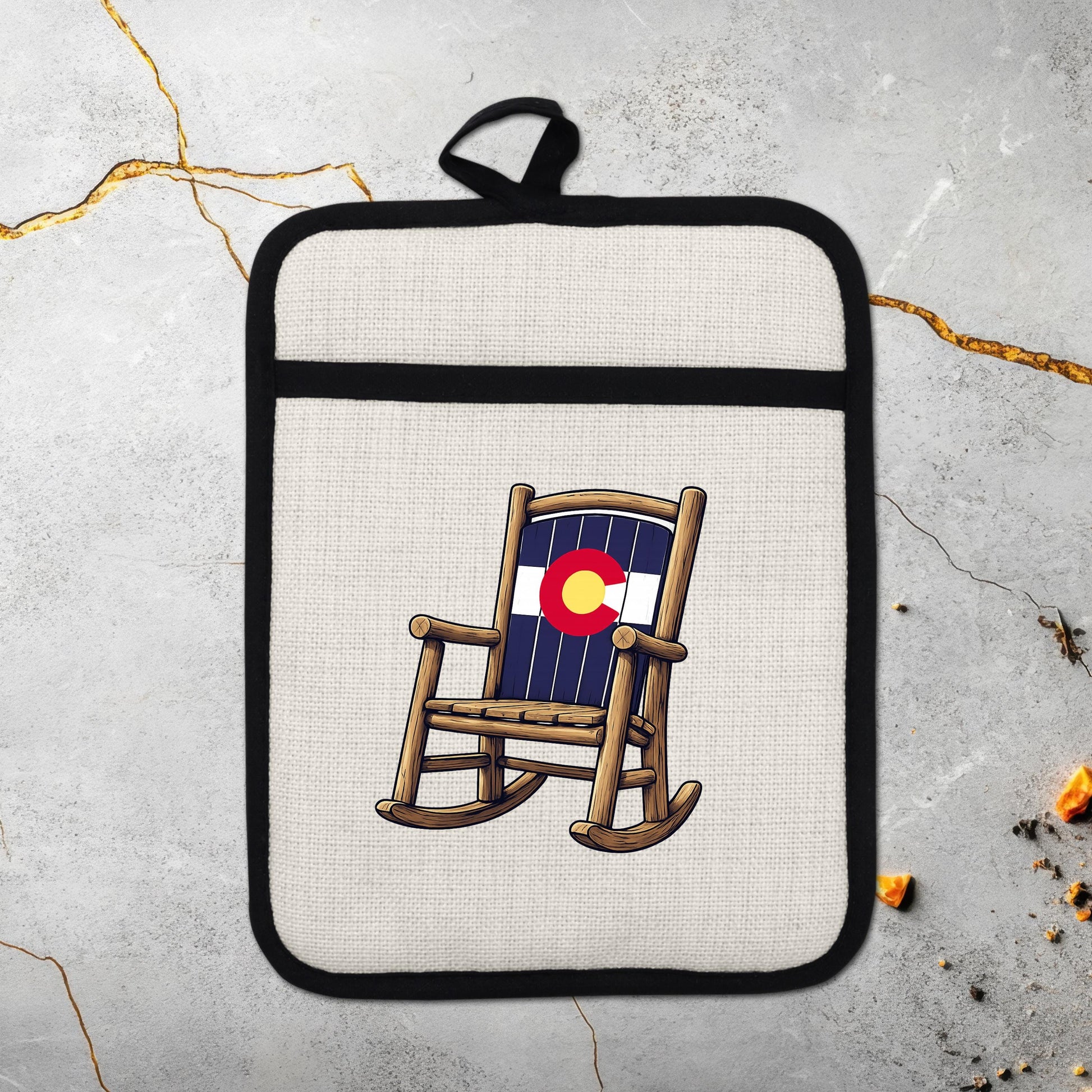 The Colorado kitchen pot holder combines rustic farmhouse style with practical heat resistance to protect your hands and surfaces while cooking. Measuring 9 × 7 inches, this silicone trivet and pot holder offers a secure grip on hot pots and pans, making it an essential cabin kitchen accessory for anyone who values both style and function. Designed with a unique pocket-style oven mitt, it ensures safe handling of cookware while showcasing a vibrant Colorado flag gift design inspired by the cozy feel of a wooden rocker chair.