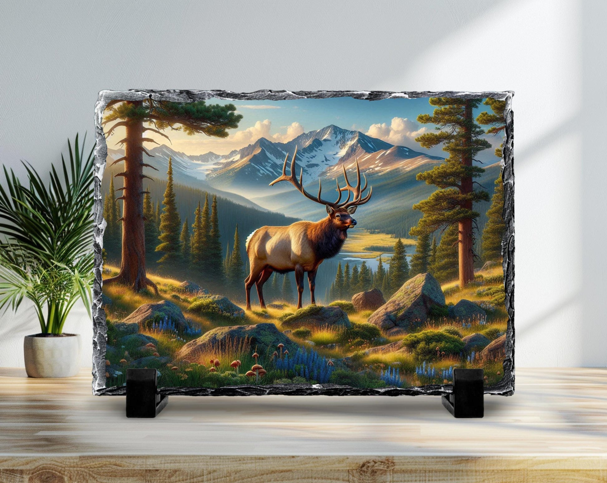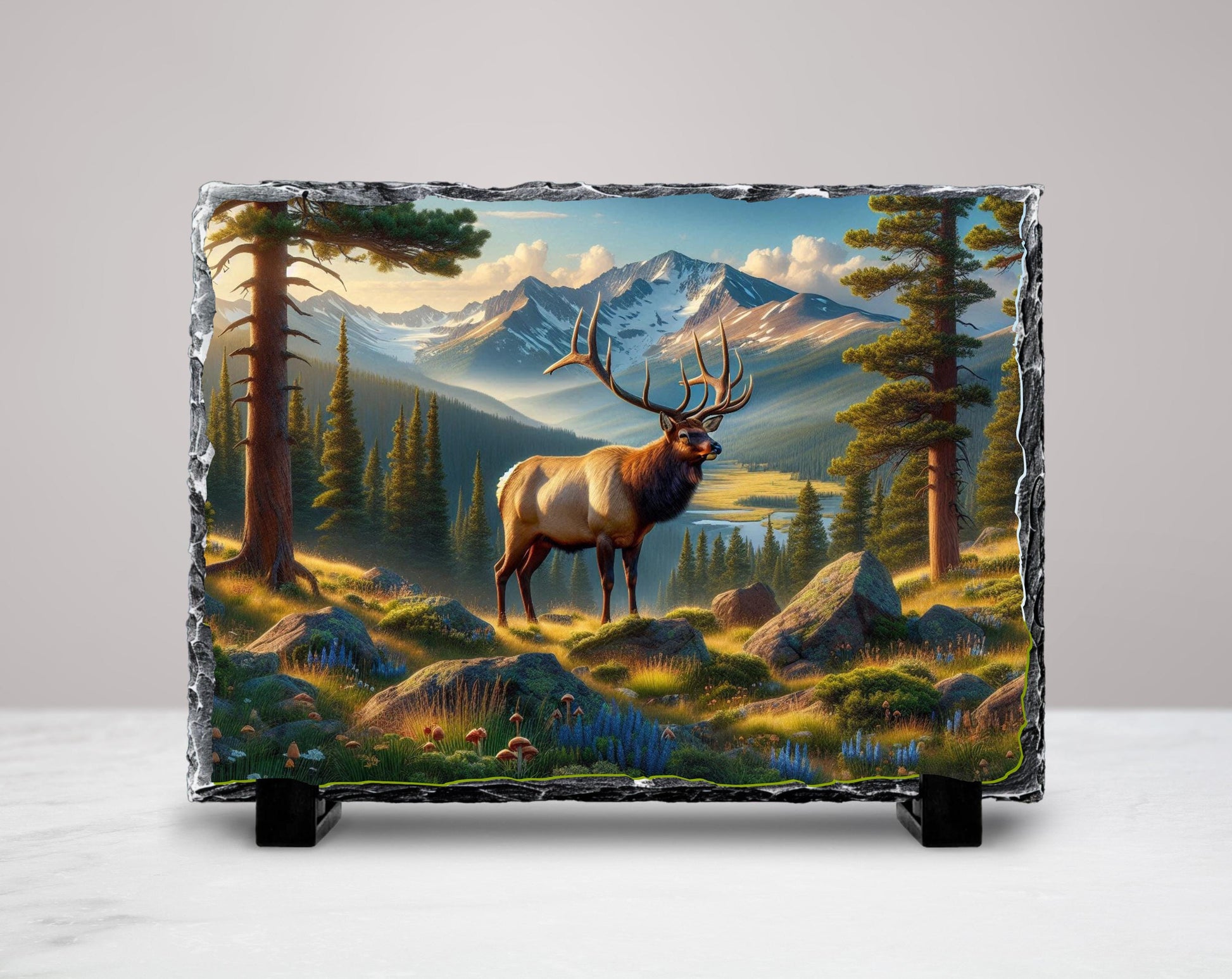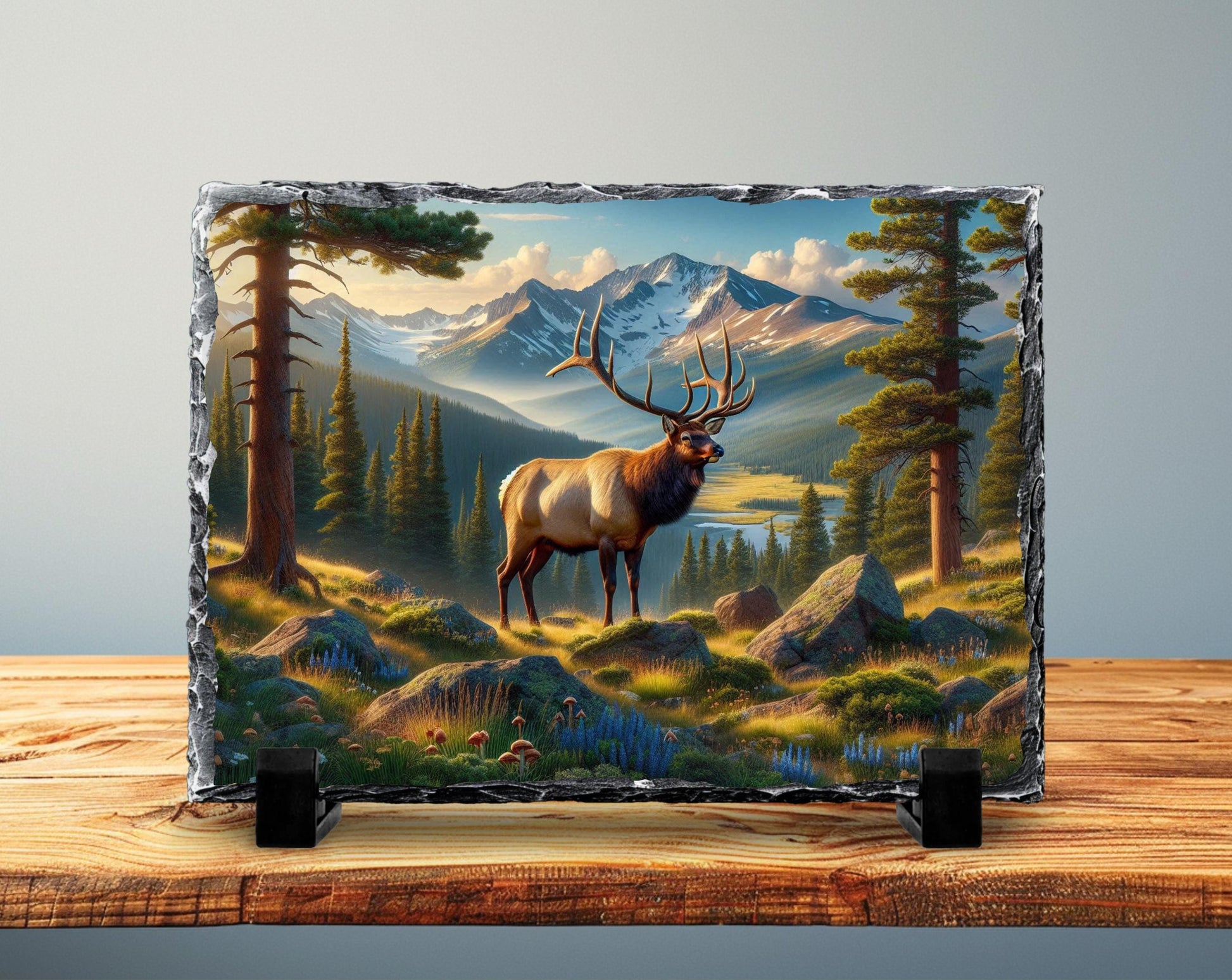Experience the beauty of outdoor nature art with this wildlife inspired plaque designed for easy tabletop slate display. Each piece is unique, showcasing variations in color and texture that enhance its rustic stone decor appeal. Whether placed on a shelf or desk, this elk wall art adds a peaceful mountain valley vibe to any space.