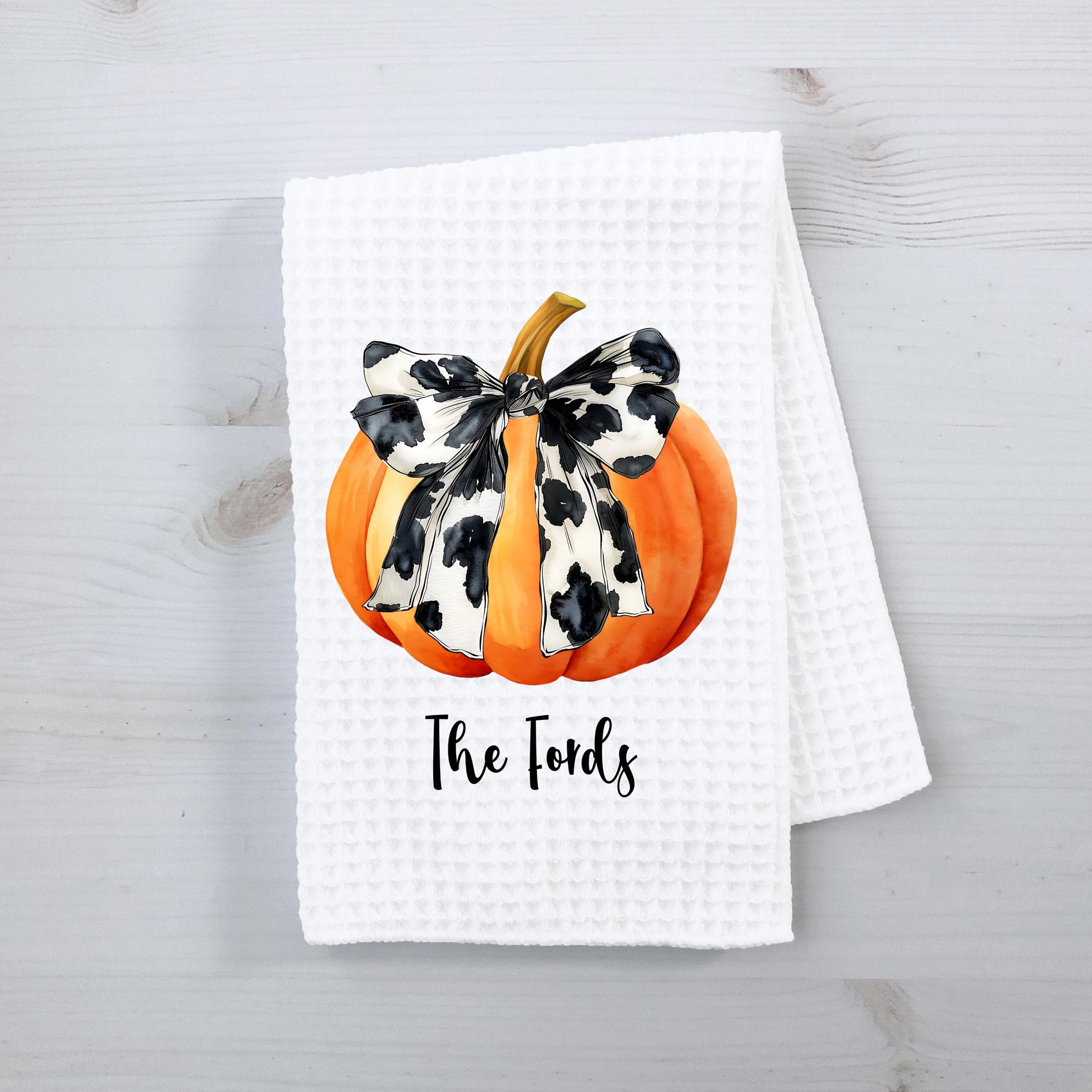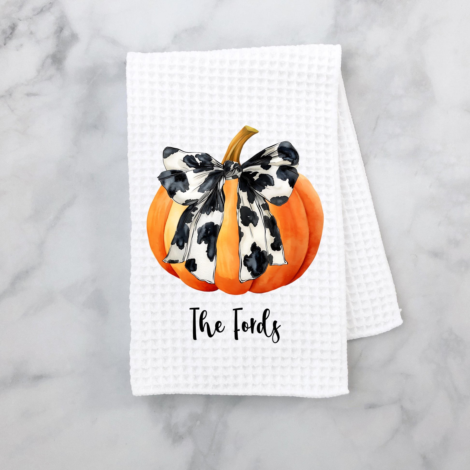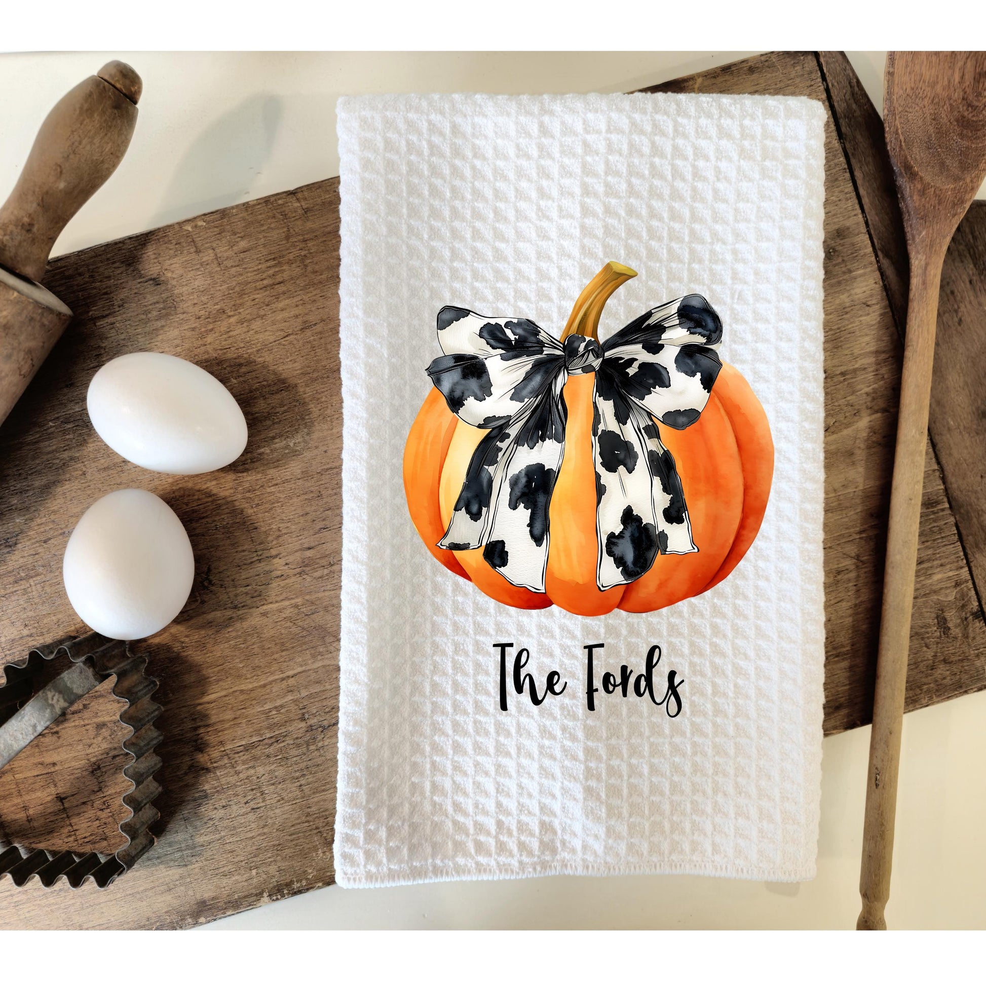 Add a touch of autumn charm to your kitchen with our delightful waffle weave towel! Measuring 16x24 inches, this towel is ideal for drying dishes or hands. It features a charming pumpkin design adorned with a cute cow print bow, and you can personalize it with a name for that special touch. This unique and practical towel makes a thoughtful gift for yourself or a loved one.