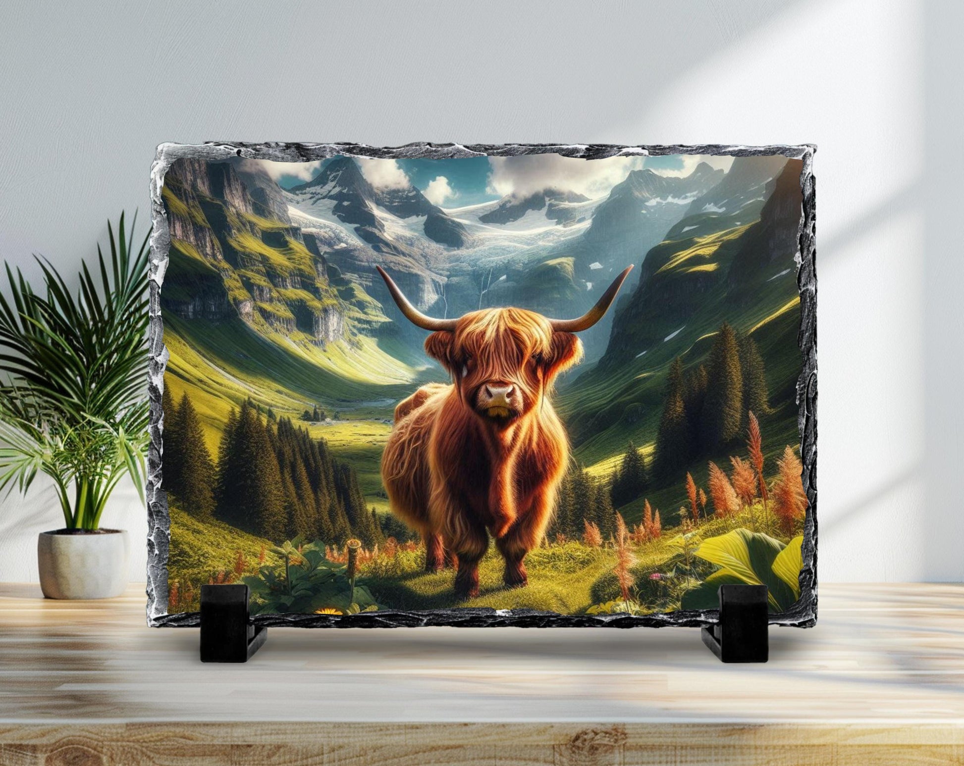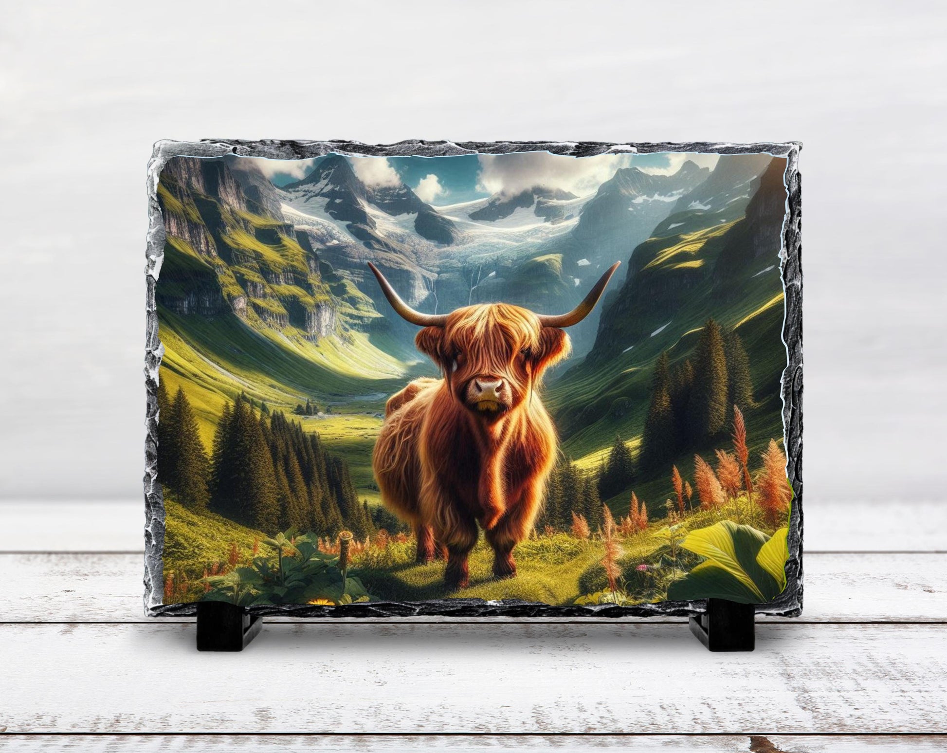 This Highland cow plaque brings rustic farmhouse decor into your home, serving as a stunning natural slate art piece that captures the serene beauty of countryside wall art. Measuring approximately 5.8 × 7.8 inches, this durable slate plaque features unique fractured edges that add authentic texture and charm to any mountain home gift collection. The high-definition sublimation printing ensures a fade resistant print that maintains vivid colors over time, making it an ideal choice for nature inspired art lovers.