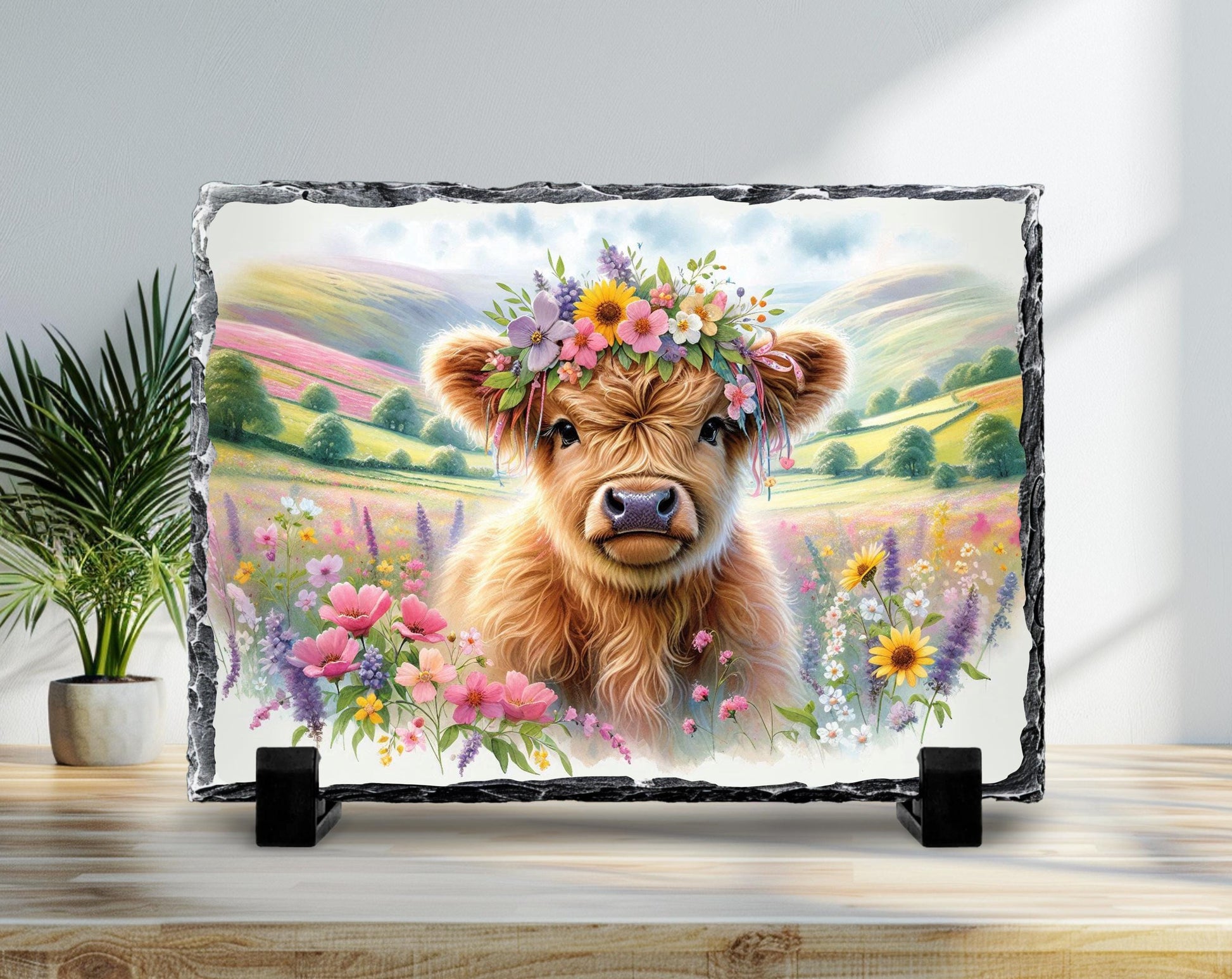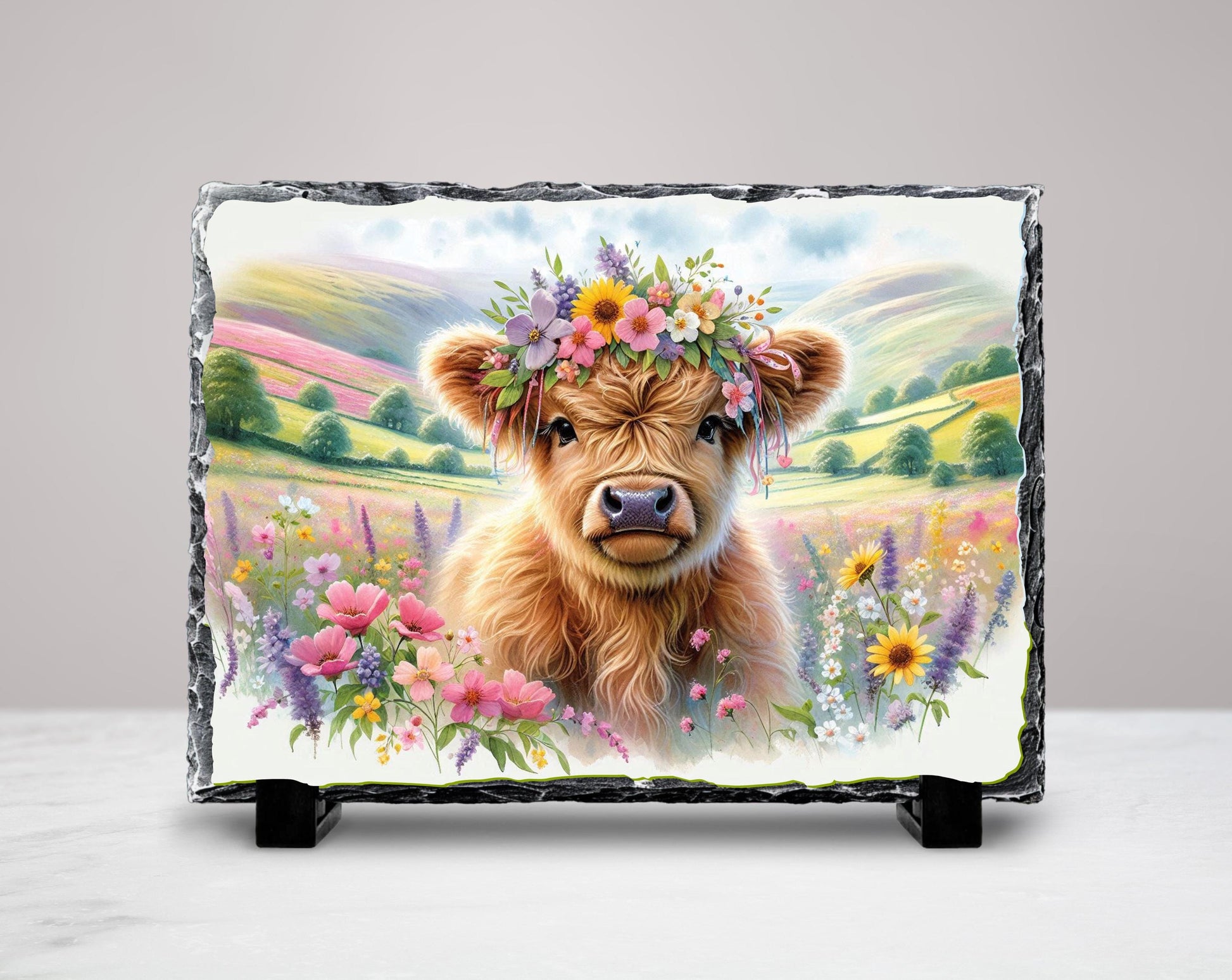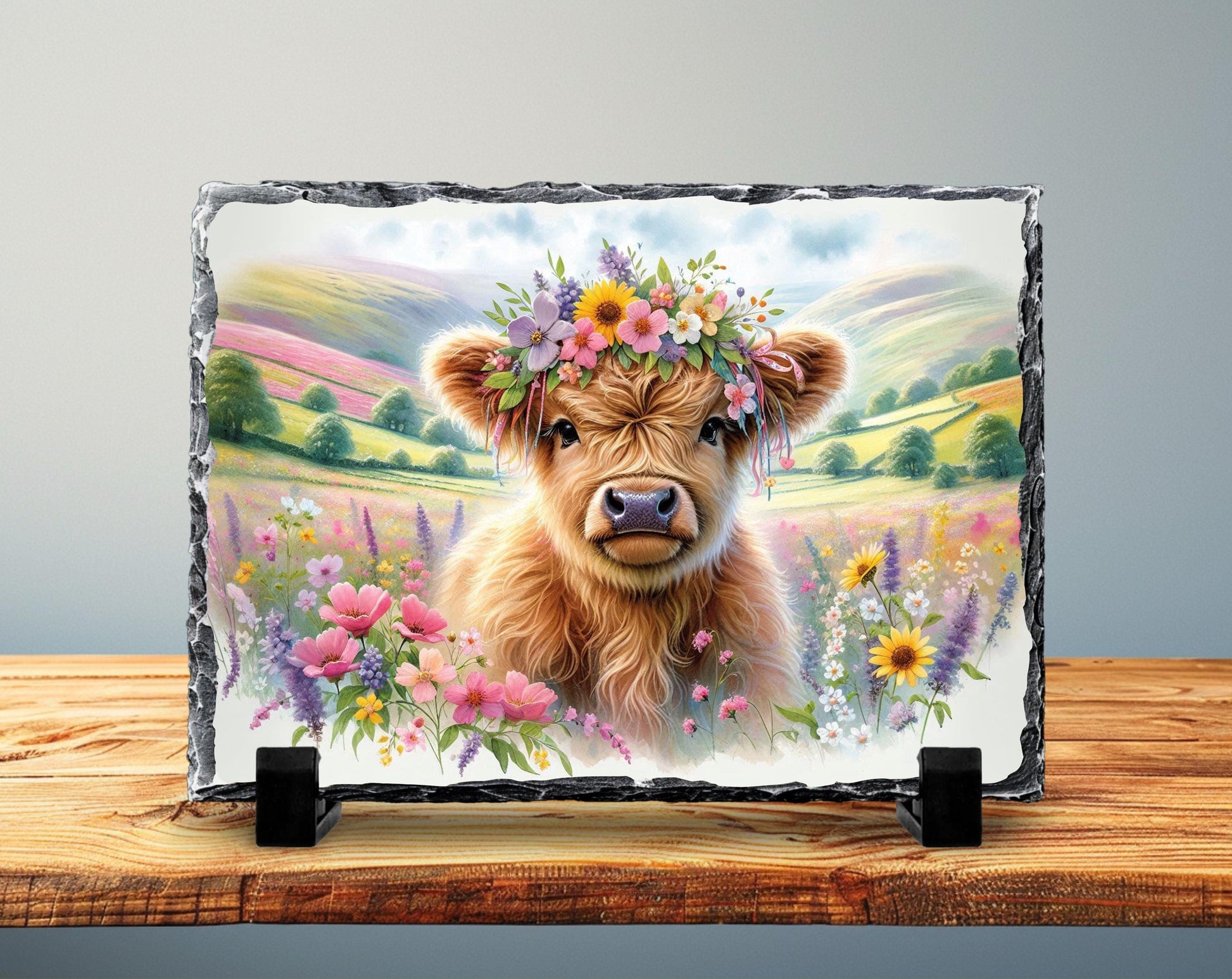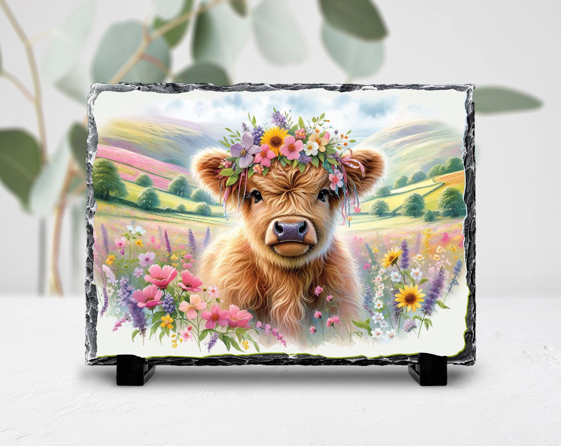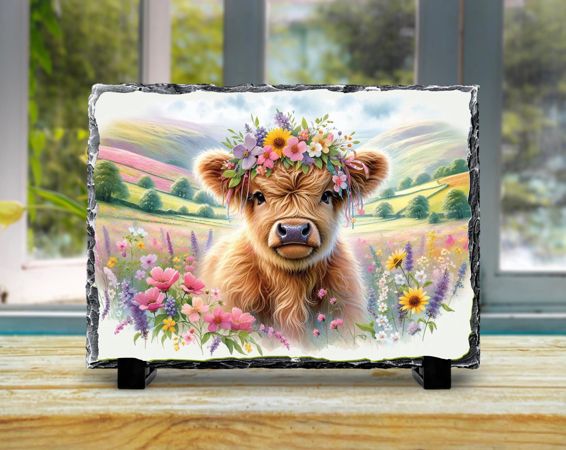 Highland Cow Slate Sign – Rustic Slate Plaque with Baby Calf Floral Headband