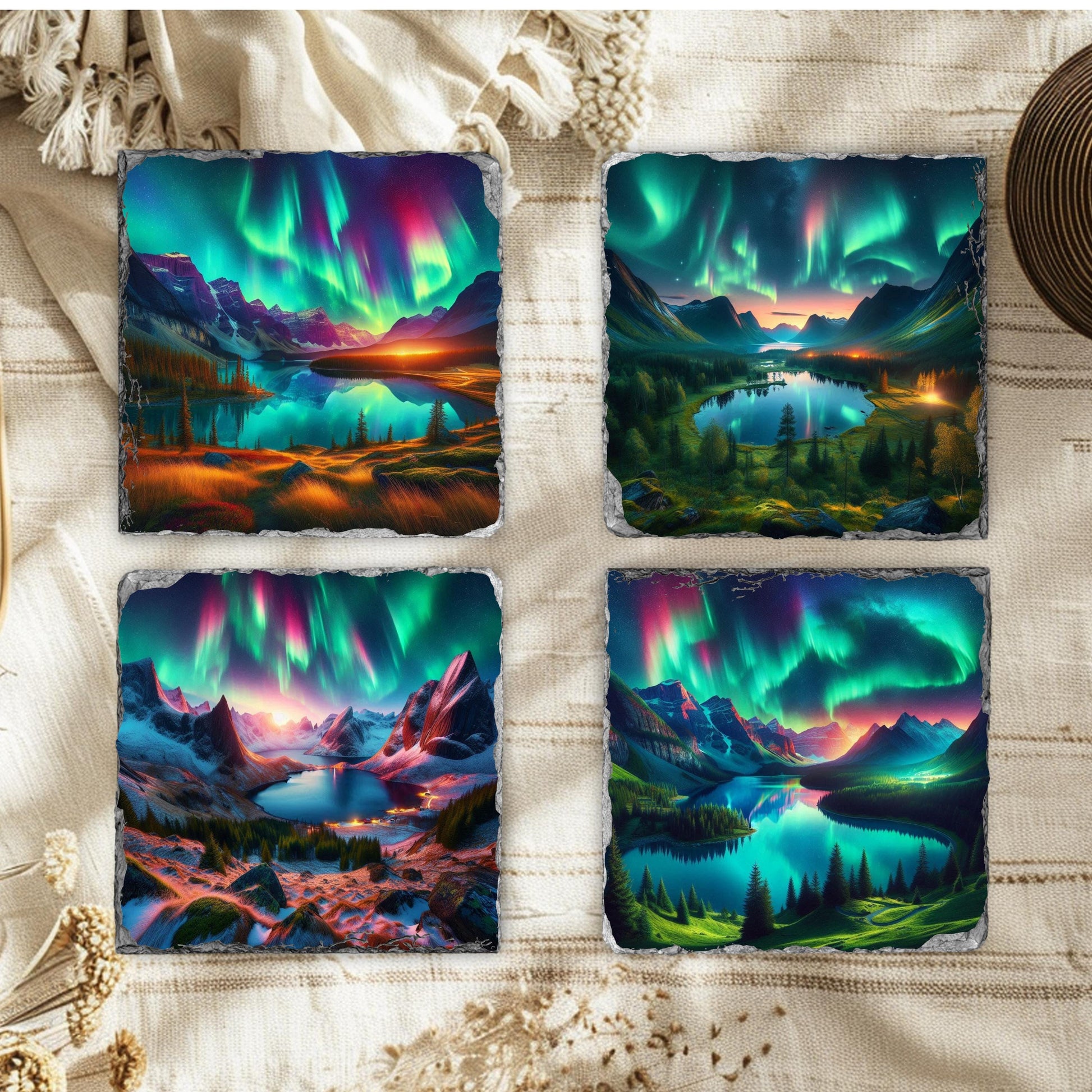 Discover the natural beauty captured on this handcrafted slate coaster set. Each coaster measures 3.5x3.5 inches with stunning fractured edges, making each piece uniquely charming. Featuring four different sublimation-printed images of a serene mountain lake under the northern lights, these coasters bring an alpine landscape to your home or cabin setup. Crafted from durable slate, they are perfect for protecting surfaces while showcasing breathtaking scenery, making them ideal decor and functional pieces for outdoor lovers and nature enthusiasts alike.