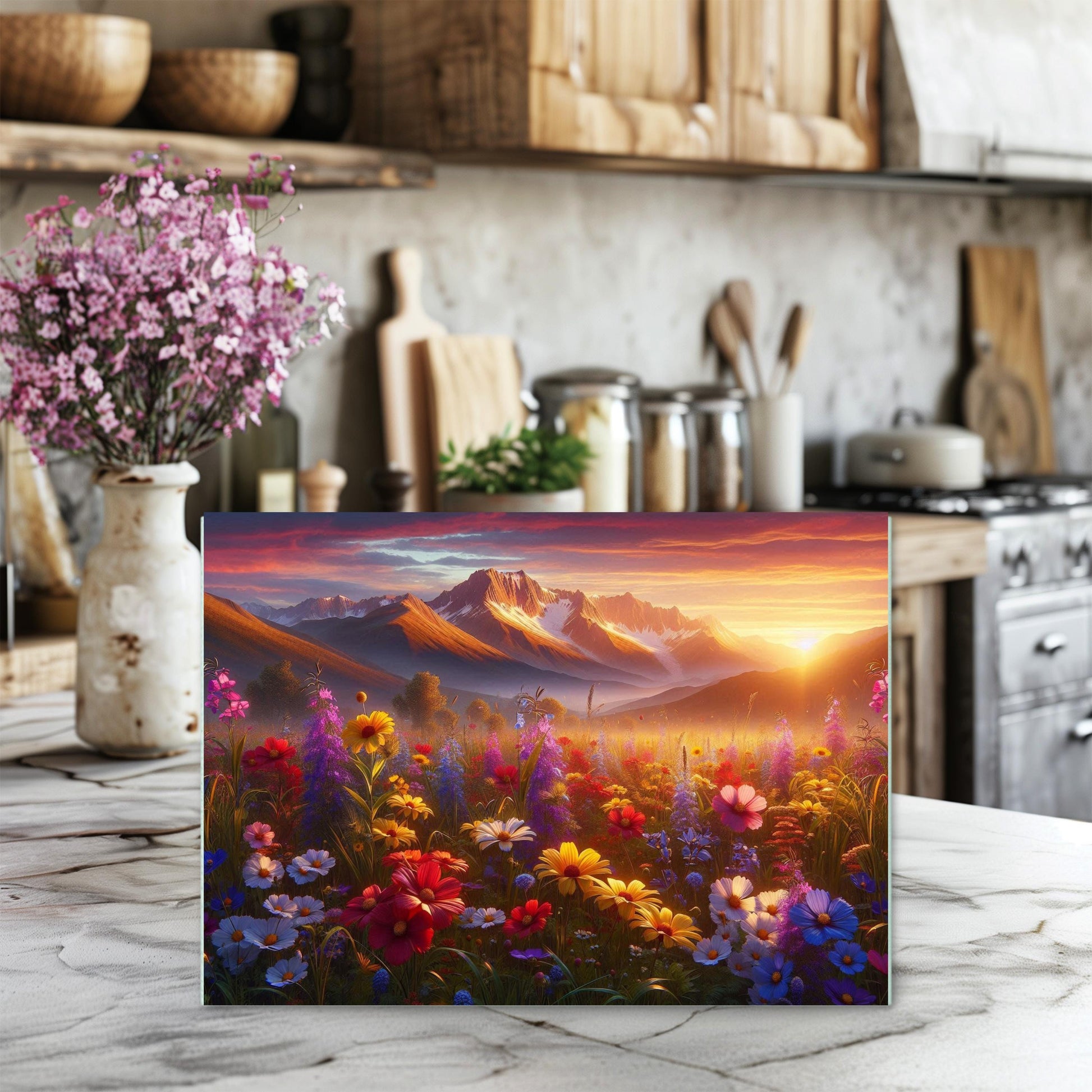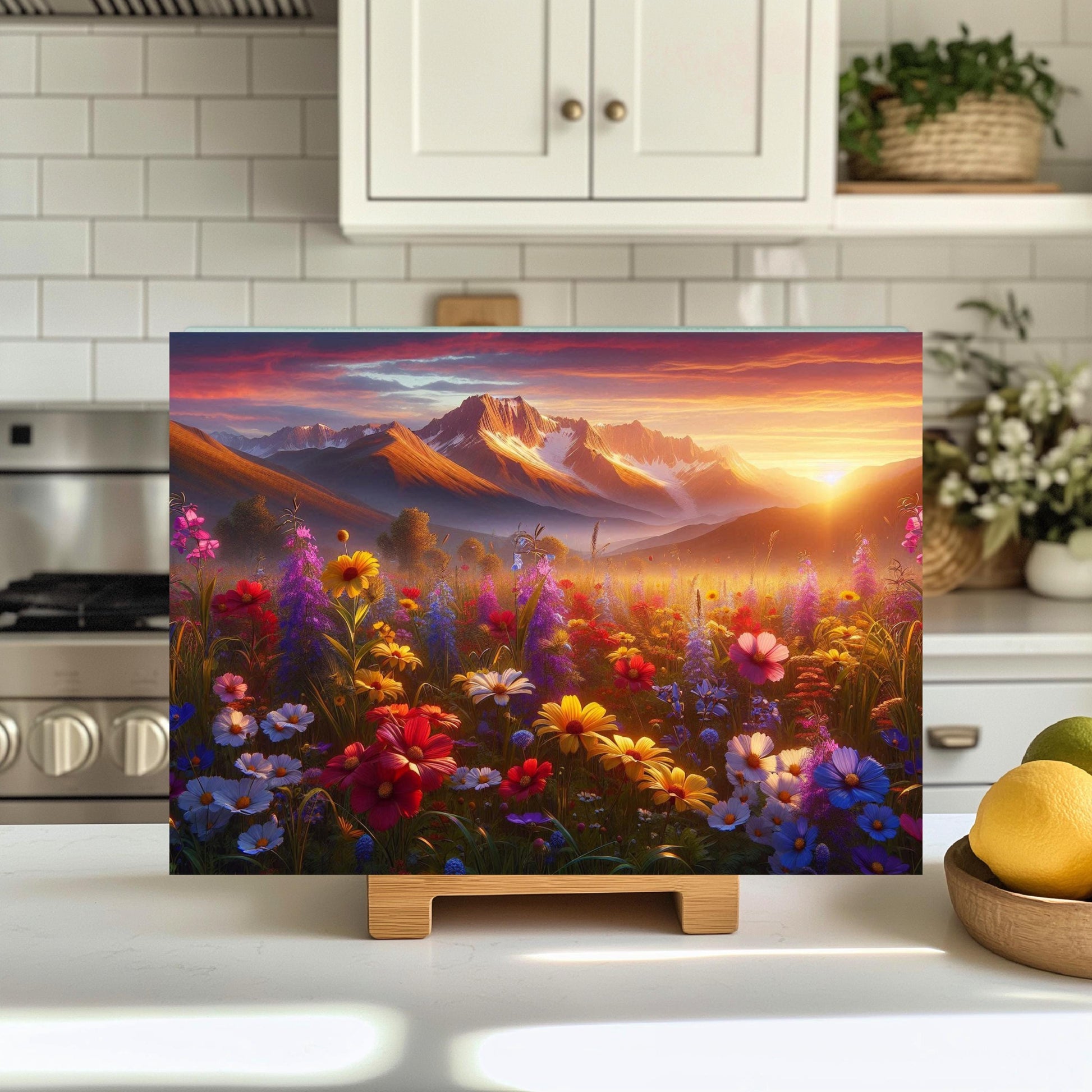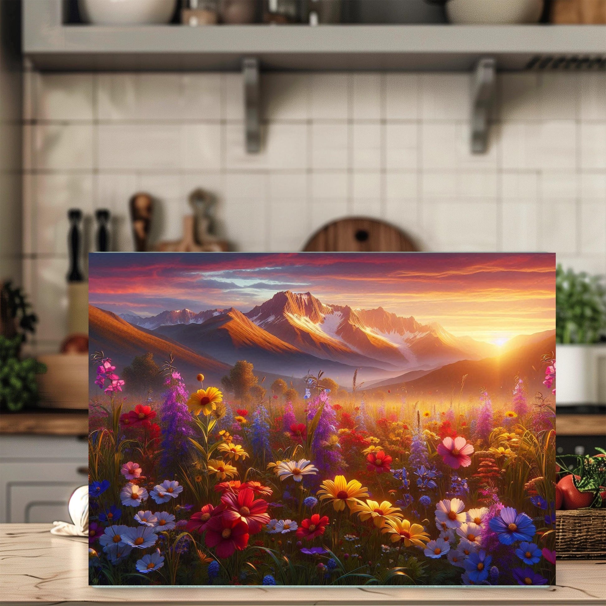 Bring the beauty of nature into your kitchen with this stunning tempered glass cutting board, featuring a picturesque mountain valley scene. A majestic snow-capped peak looms in the background, while vibrant wildflowers flourish in the foreground, all illuminated by the warm hues of a sunset sky. Measuring 11x15 inches, this board serves as a practical prep surface, a charming serving board, or a decorative accent for your countertop.