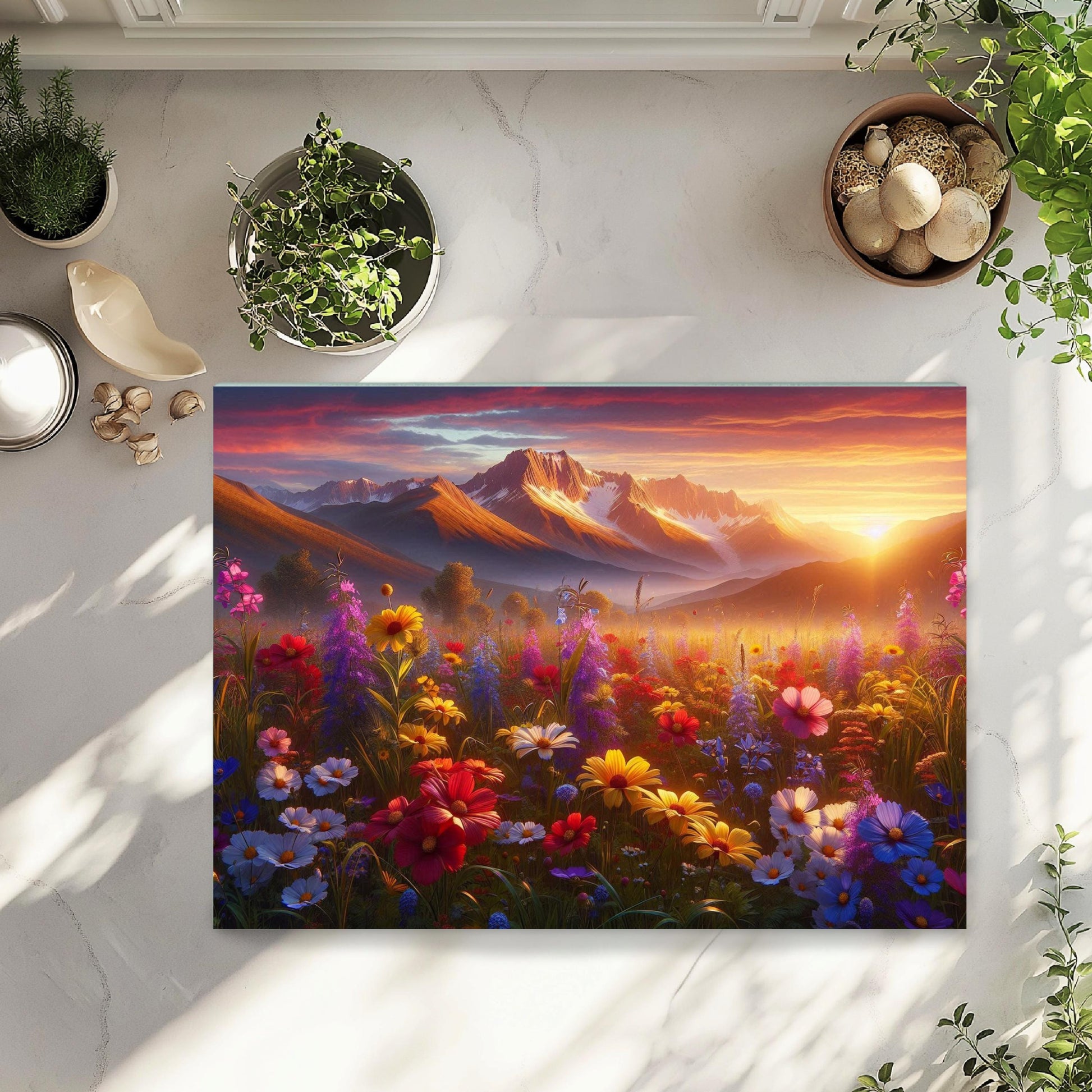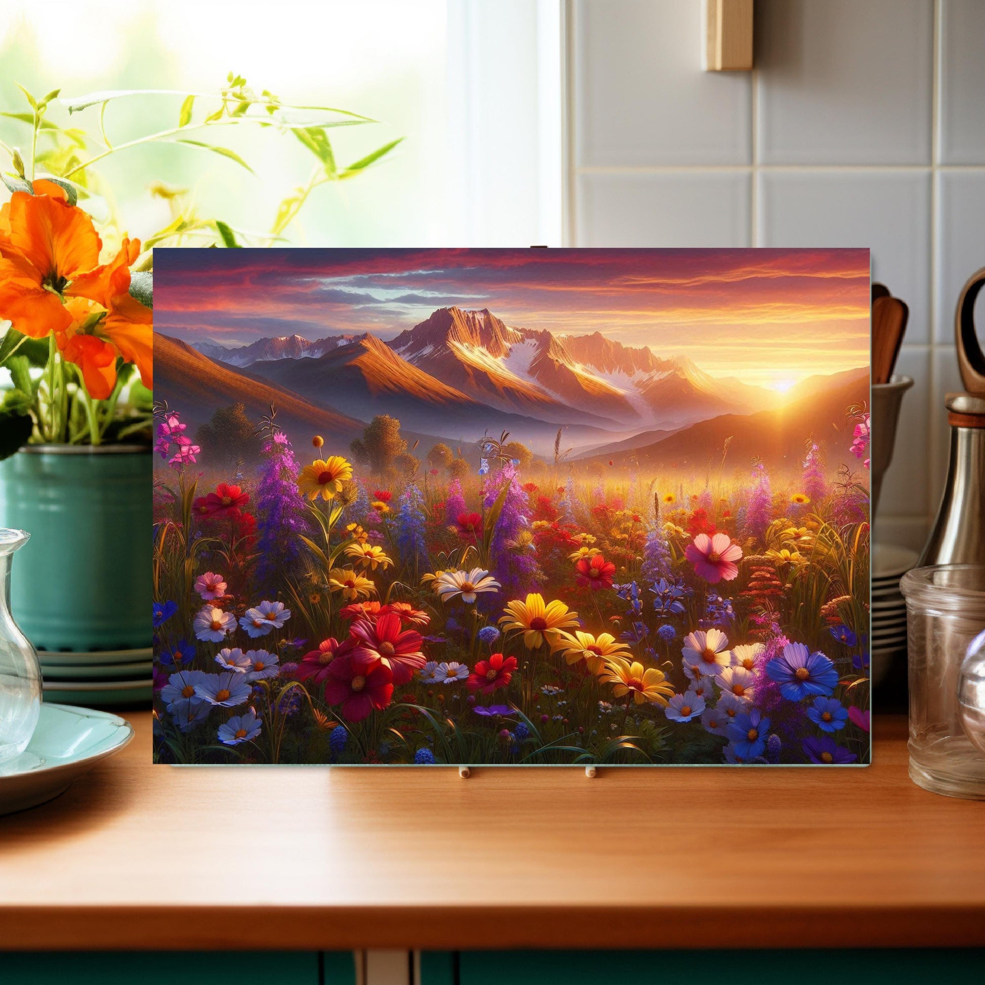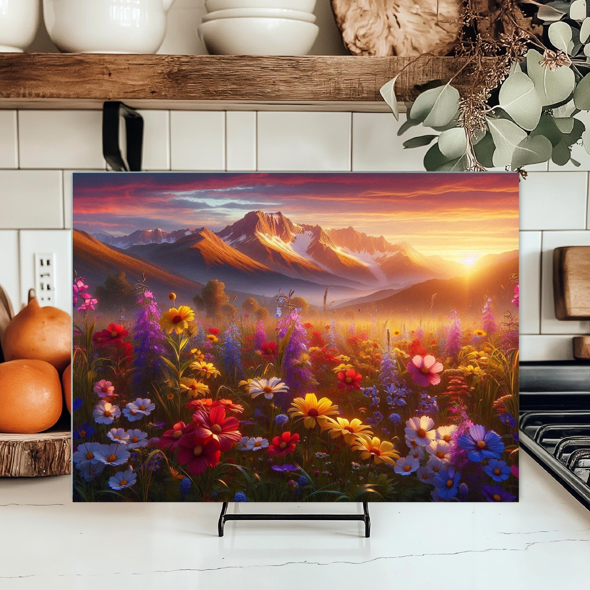 Bring the beauty of nature into your kitchen with this stunning tempered glass cutting board, featuring a picturesque mountain valley scene. A majestic snow-capped peak looms in the background, while vibrant wildflowers flourish in the foreground, all illuminated by the warm hues of a sunset sky. Measuring 11x15 inches, this board serves as a practical prep surface, a charming serving board, or a decorative accent for your countertop.