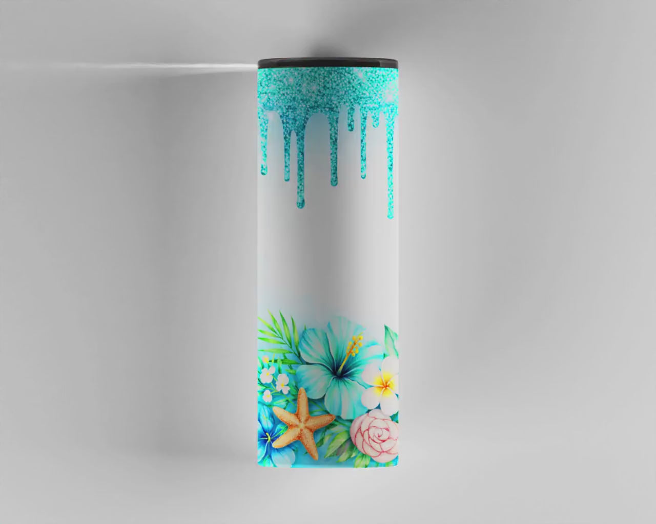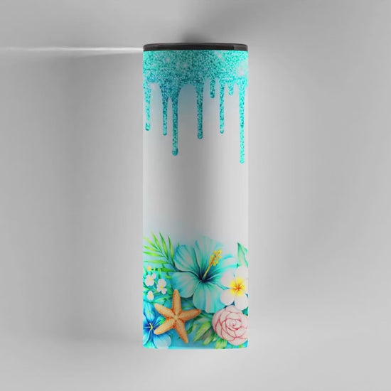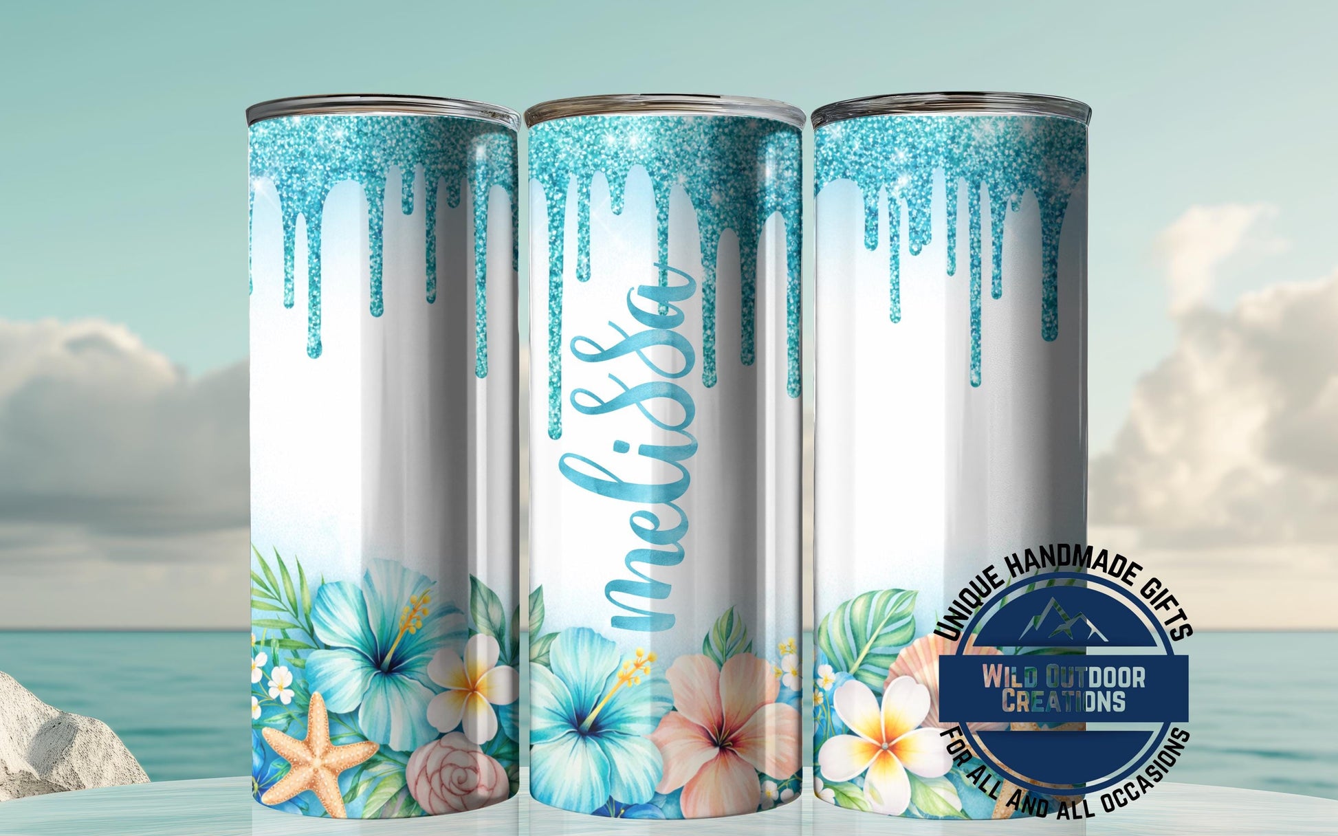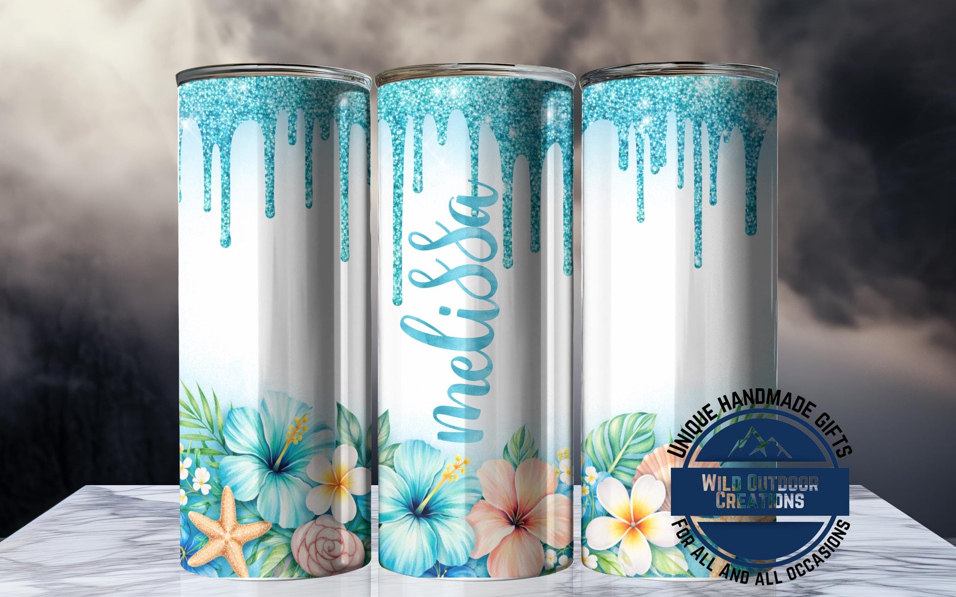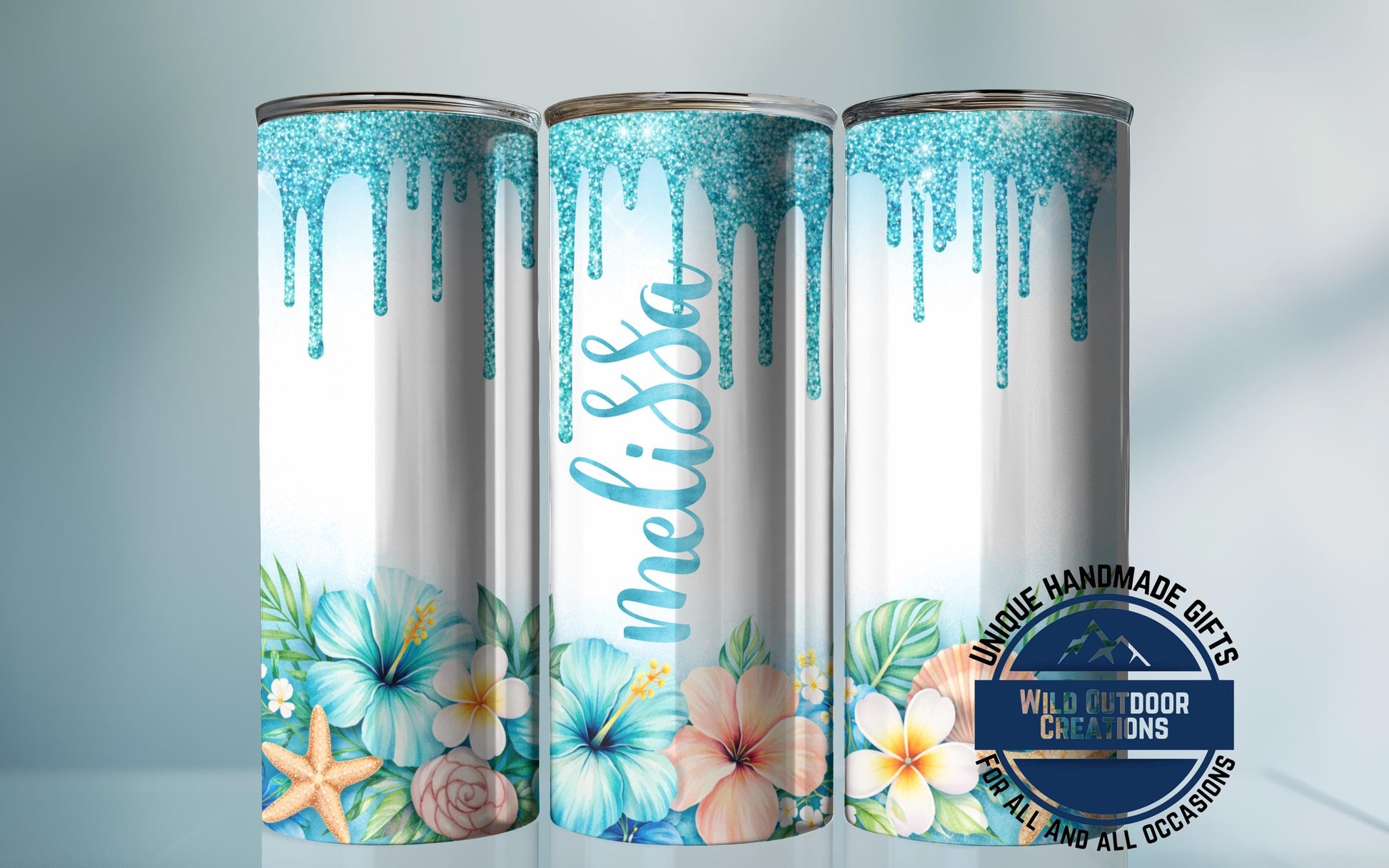 Choose from skinny tumbler 20oz or 30oz sizes, each designed with a glossy premium finish showcasing shimmering aqua drips, tropical flowers, seashells, and starfish. The custom name tumbler option allows you to add a personal touch with high-resolution permanent print, making it an excellent beach drinkware gift.