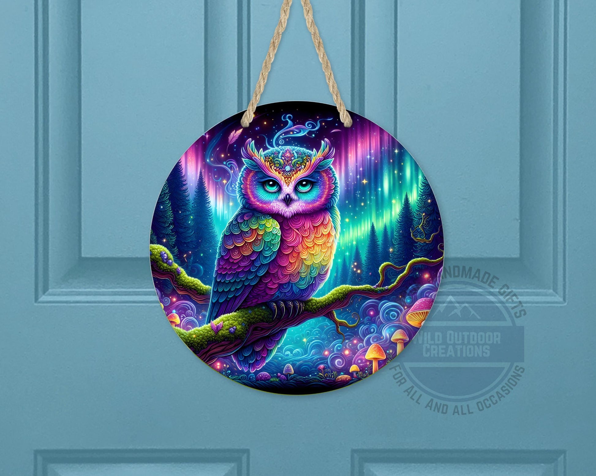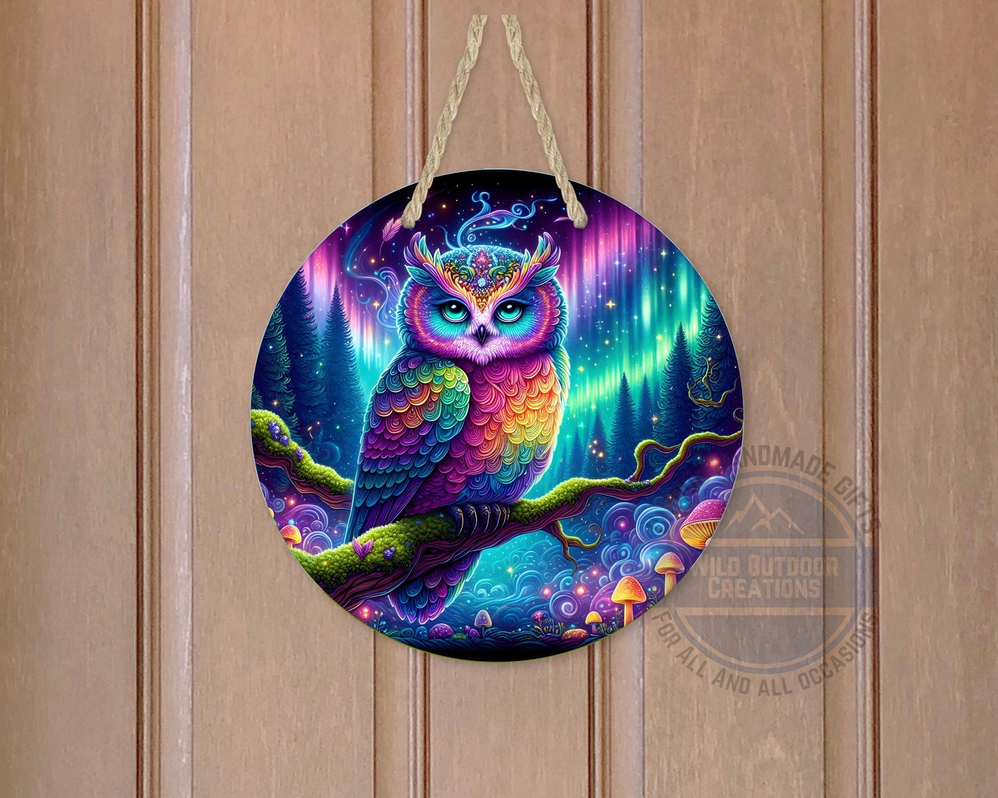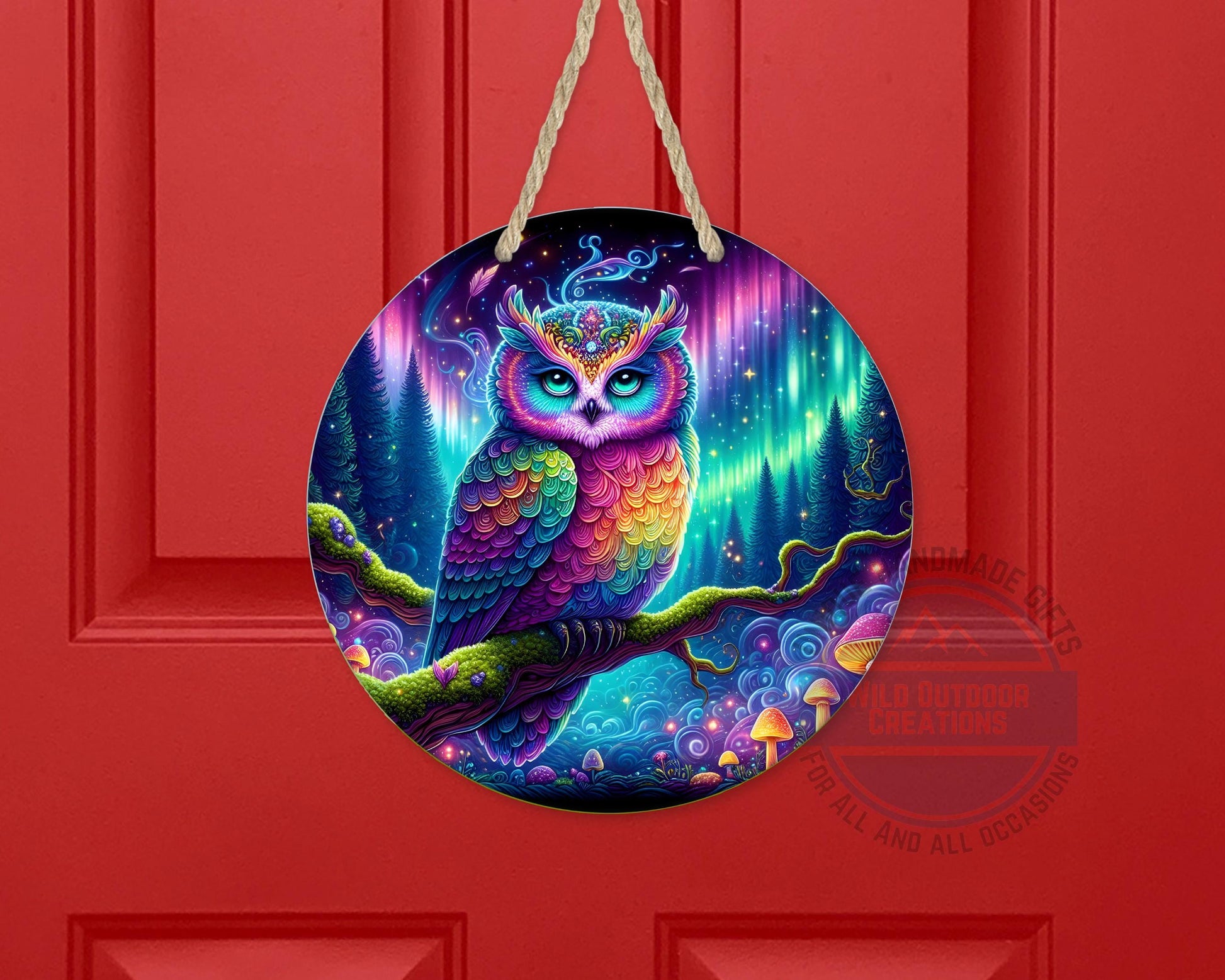 This Rainbow Owl Wall Art brings a psychedelic forest scene to life with vivid colors and intricate details, transforming any space with vibrant owl decor that captures the magic of nature inspired art. Crafted as a round aluminum sign measuring 10 inches by 10 inches with a slim 0.025-inch thickness, this owl door hanger features a fade resistant print that maintains its brilliance over time. Its weather resistant finish ensures durability for both indoor and outdoor use, making it an ideal outdoor welcome sign or boho style decor piece. Perfect for fans of eclectic wall art and collectors of animal art collectibles, this magical woodland decor adds a unique charm to your home or garden.