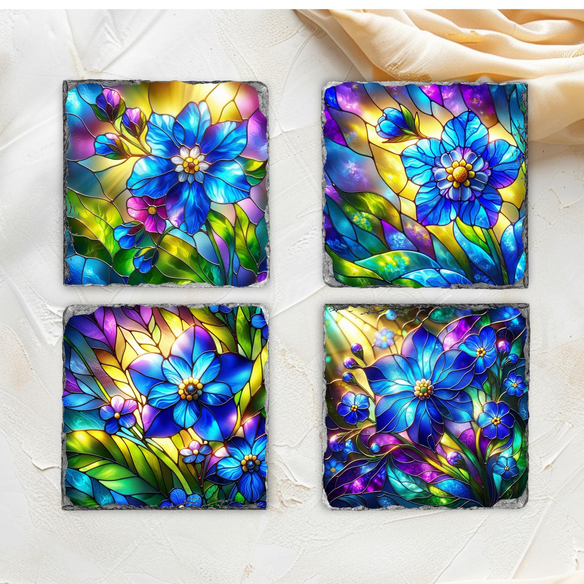 Enhance your home decor with this handcrafted slate coaster set, featuring a charming faux stained glass design of Alaska's state flower, the Forget Me Not. Each coaster measures approximately 3.5 x 3.5 inches and showcases four unique floral images that celebrate vibrant artistry and the beauty of nature. The naturally fractured edges of the slate add a rustic charm, making these coasters not only practical but also a striking decorative accent.