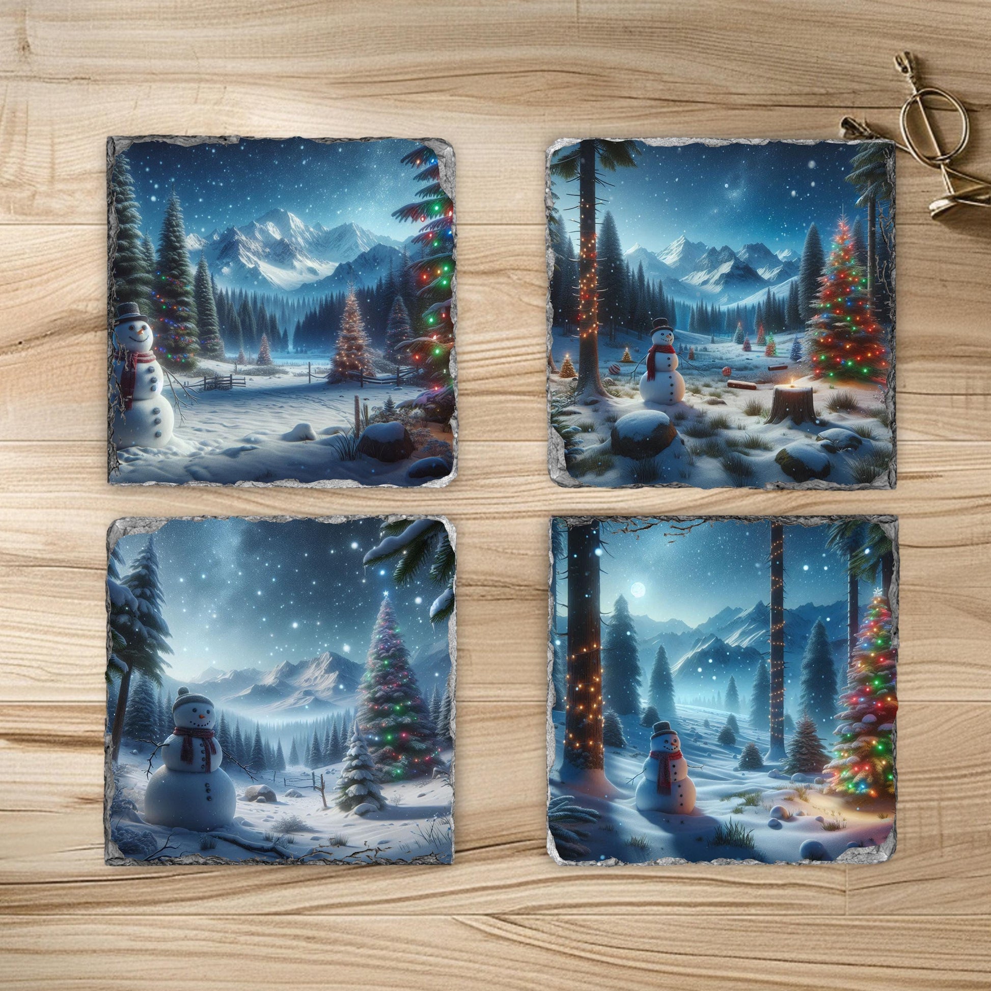 Embrace the warmth and joy of winter with our handcrafted slate coaster set, featuring four delightful sublimation-printed images of a cheerful snowman amidst a stunning winter mountain scene adorned with twinkling Christmas lights around pine trees. Each coaster measures approximately 3.5 x 3.5 inches and showcases unique fractured edges, giving them a natural and rustic charm that enhances your holiday decor or winter gatherings.