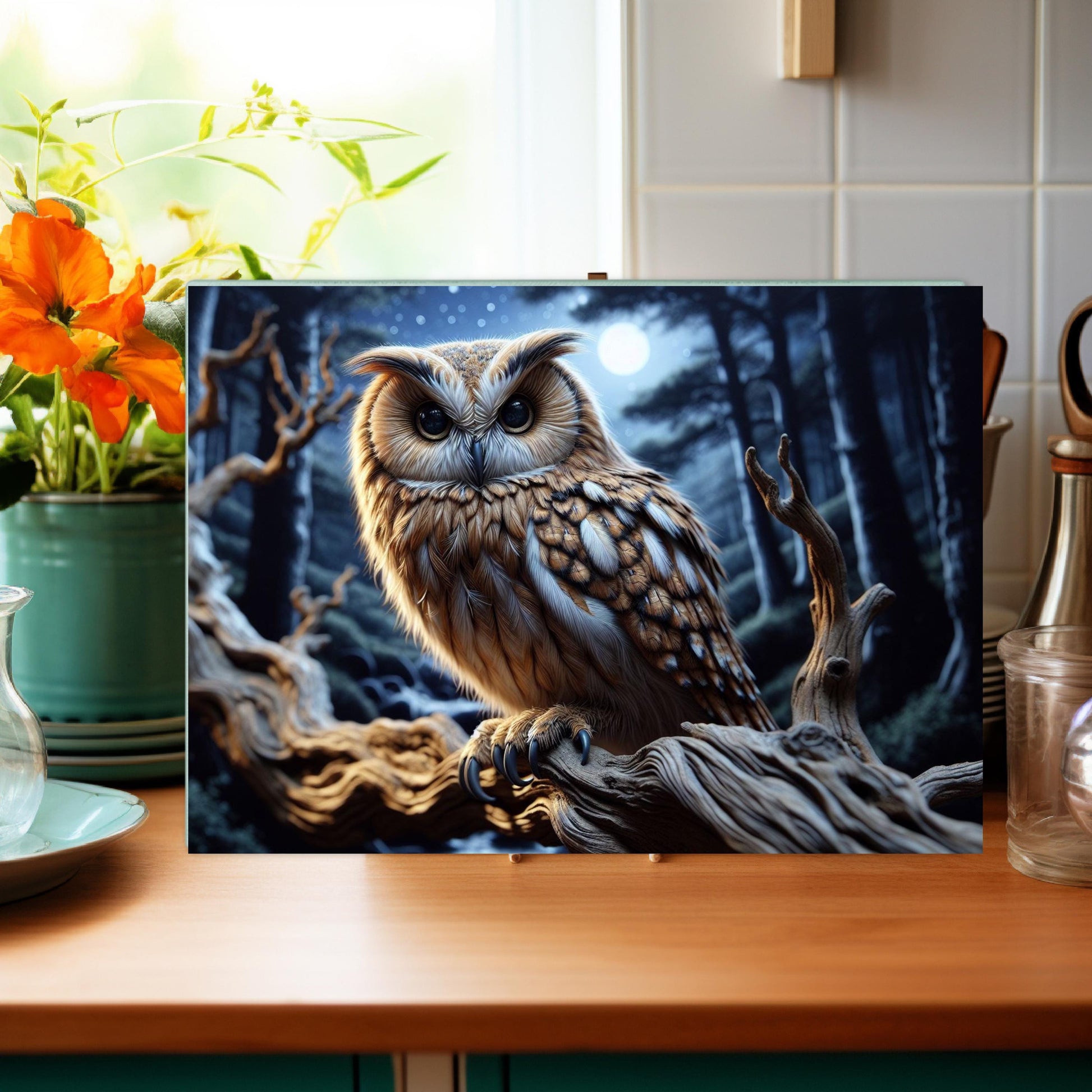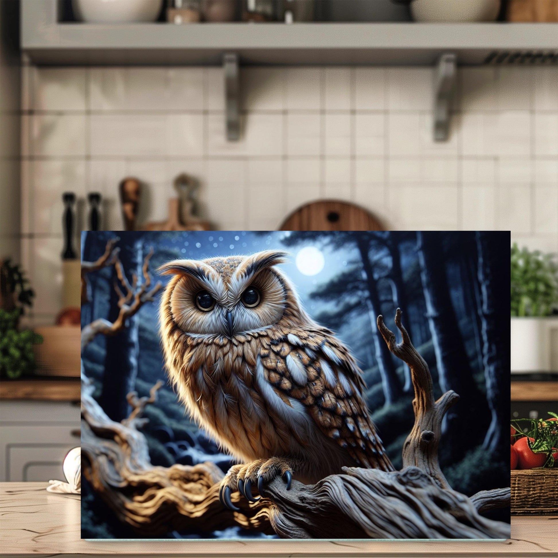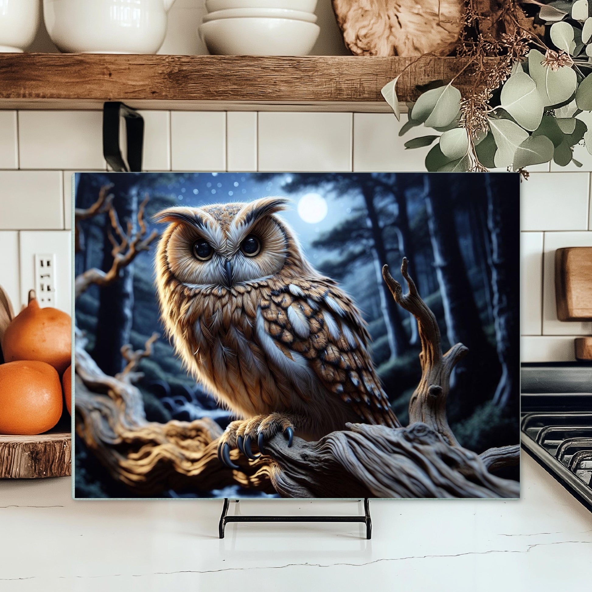 Add a touch of nature to your kitchen with this beautifully designed 11x15-inch tempered glass cutting board, showcasing a vibrant image of an owl perched on a branch at night. This versatile kitchen accessory is perfect for both food preparation and displaying your culinary creations, making it a delightful addition to any kitchen decor.