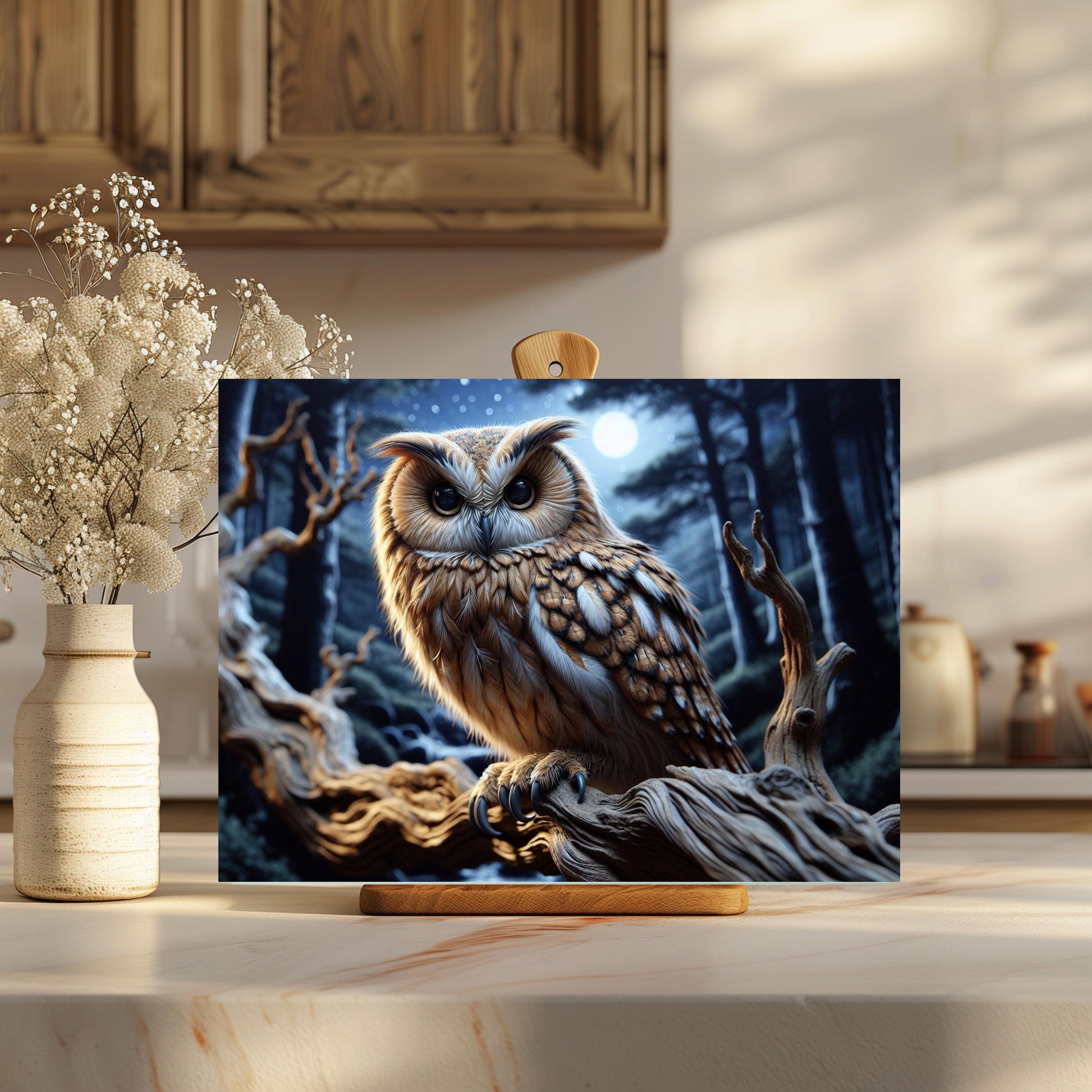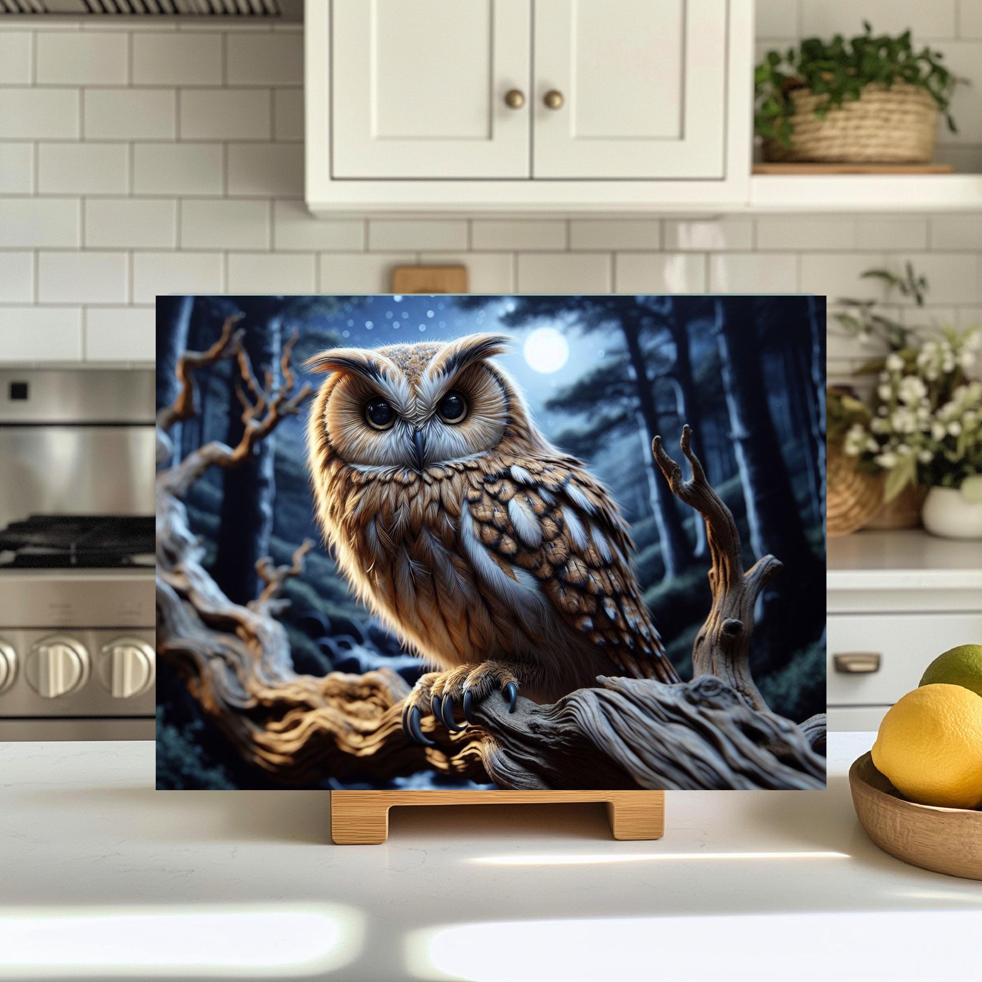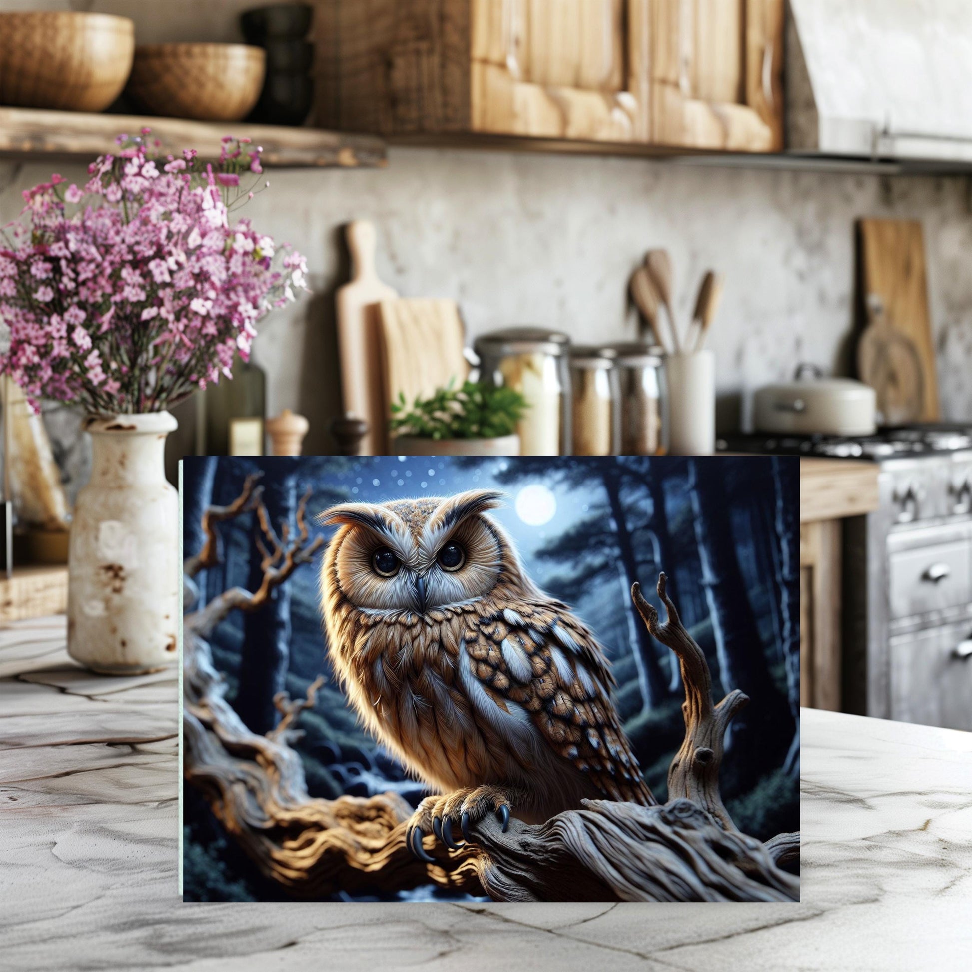 Add a touch of nature to your kitchen with this beautifully designed 11x15-inch tempered glass cutting board, showcasing a vibrant image of an owl perched on a branch at night. This versatile kitchen accessory is perfect for both food preparation and displaying your culinary creations, making it a delightful addition to any kitchen decor.
