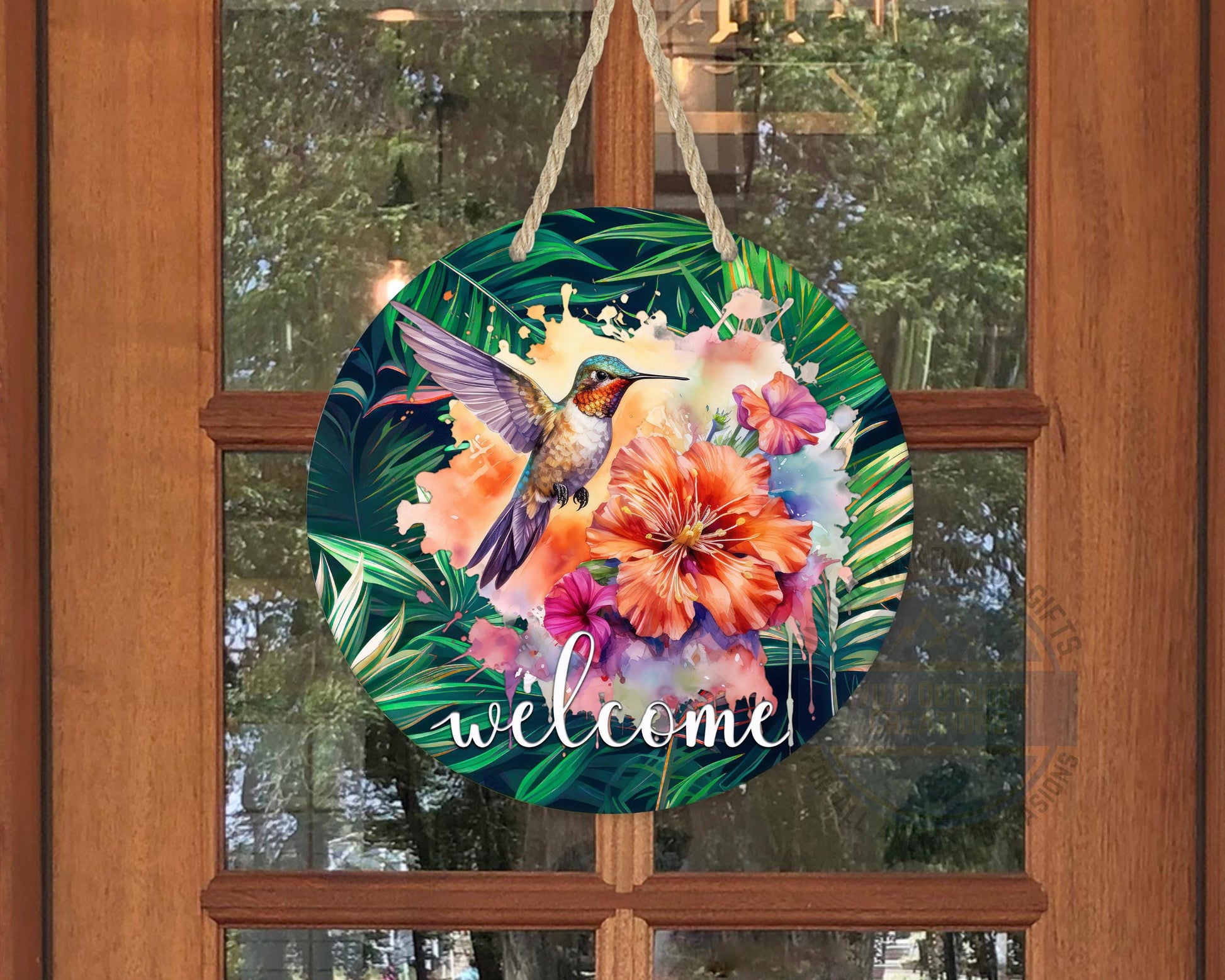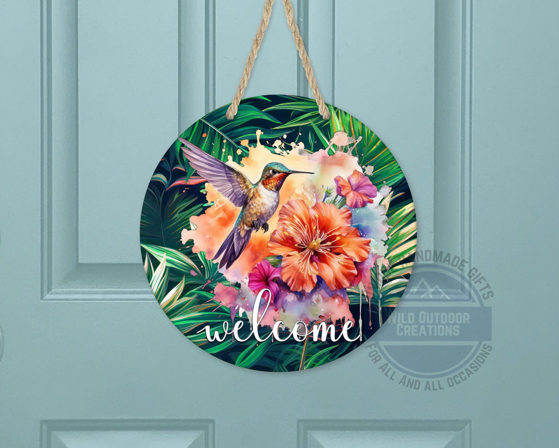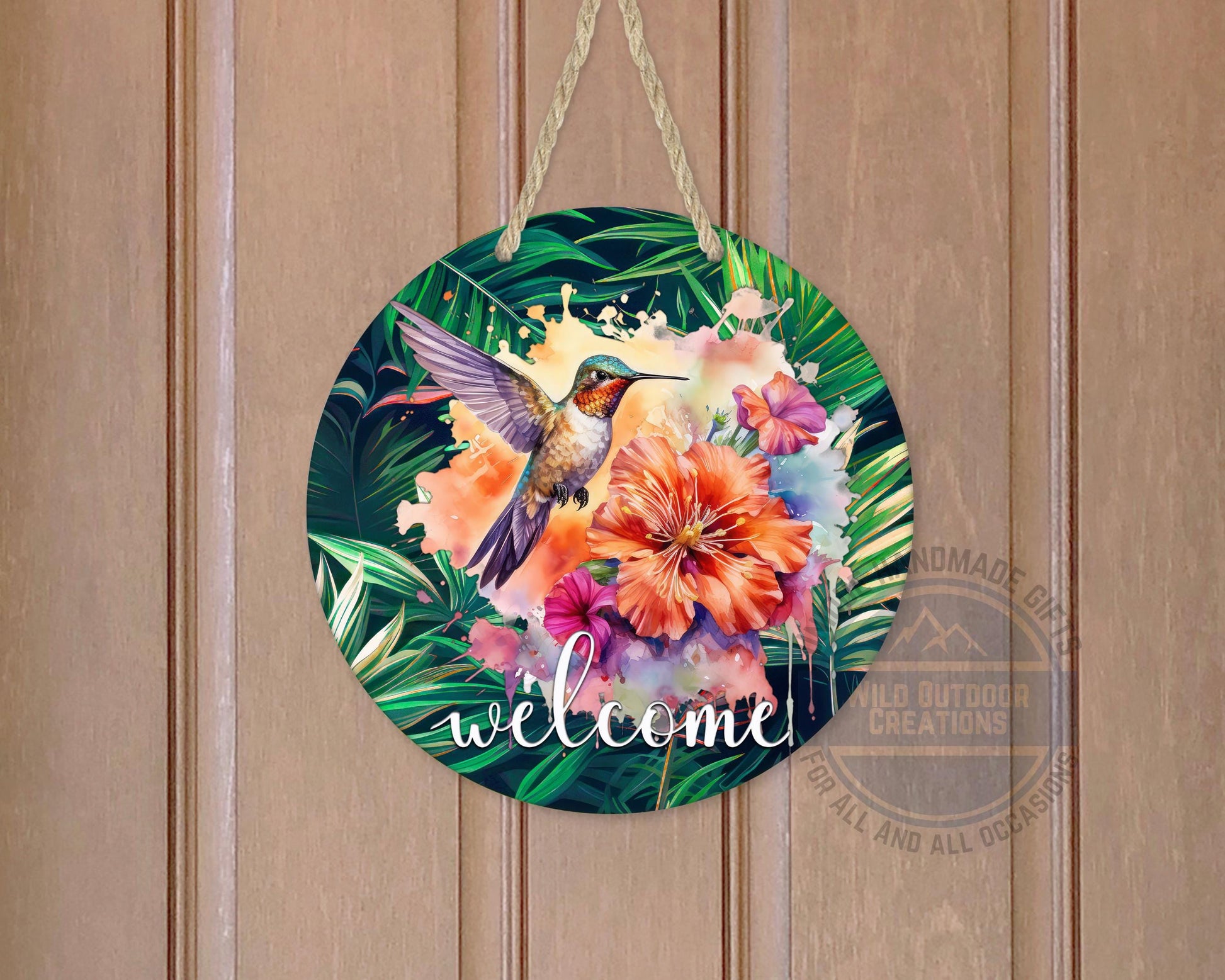 Tropical Hummingbird Door Hanger - Colorful Floral Welcome Sign with Fade Resistant Print