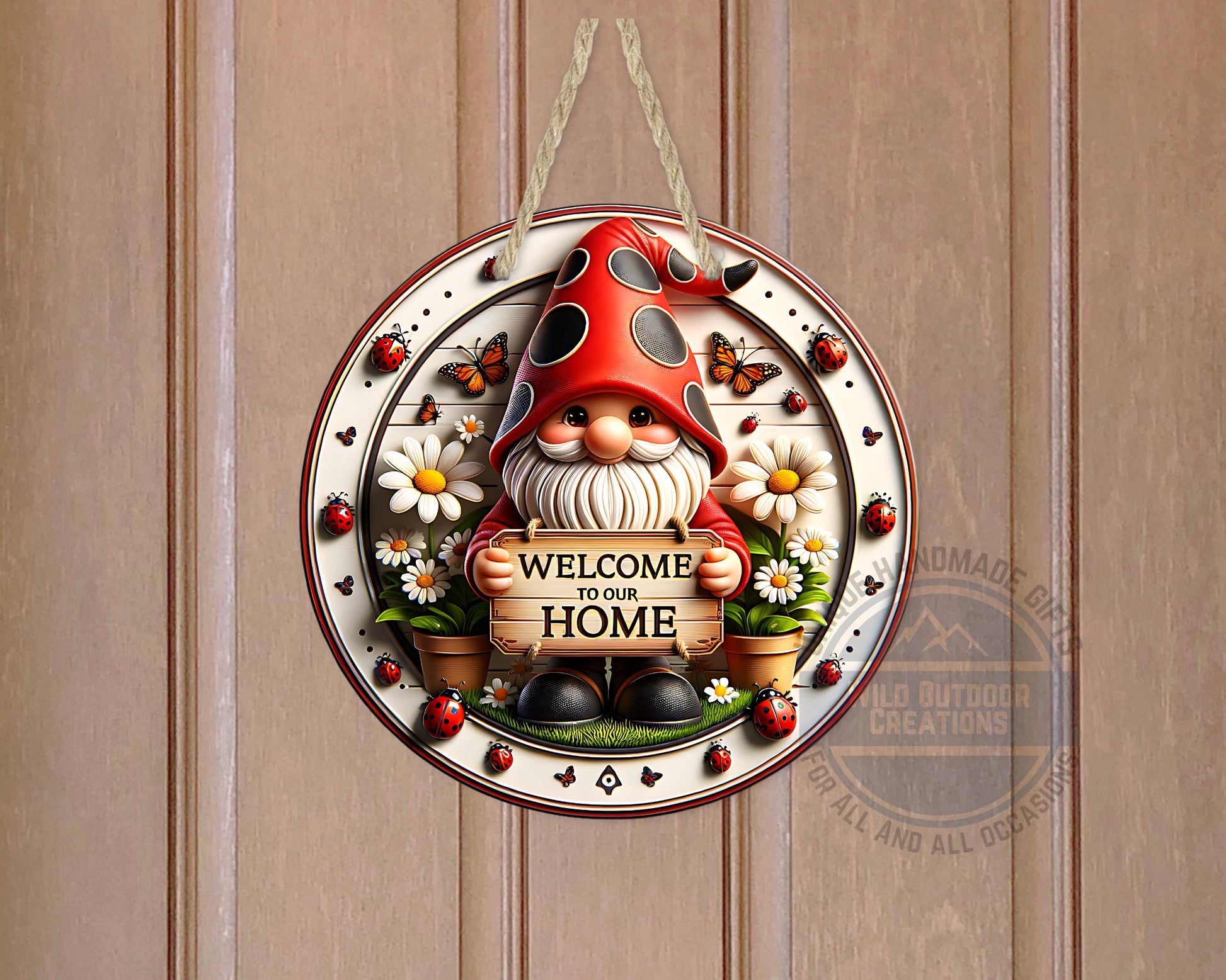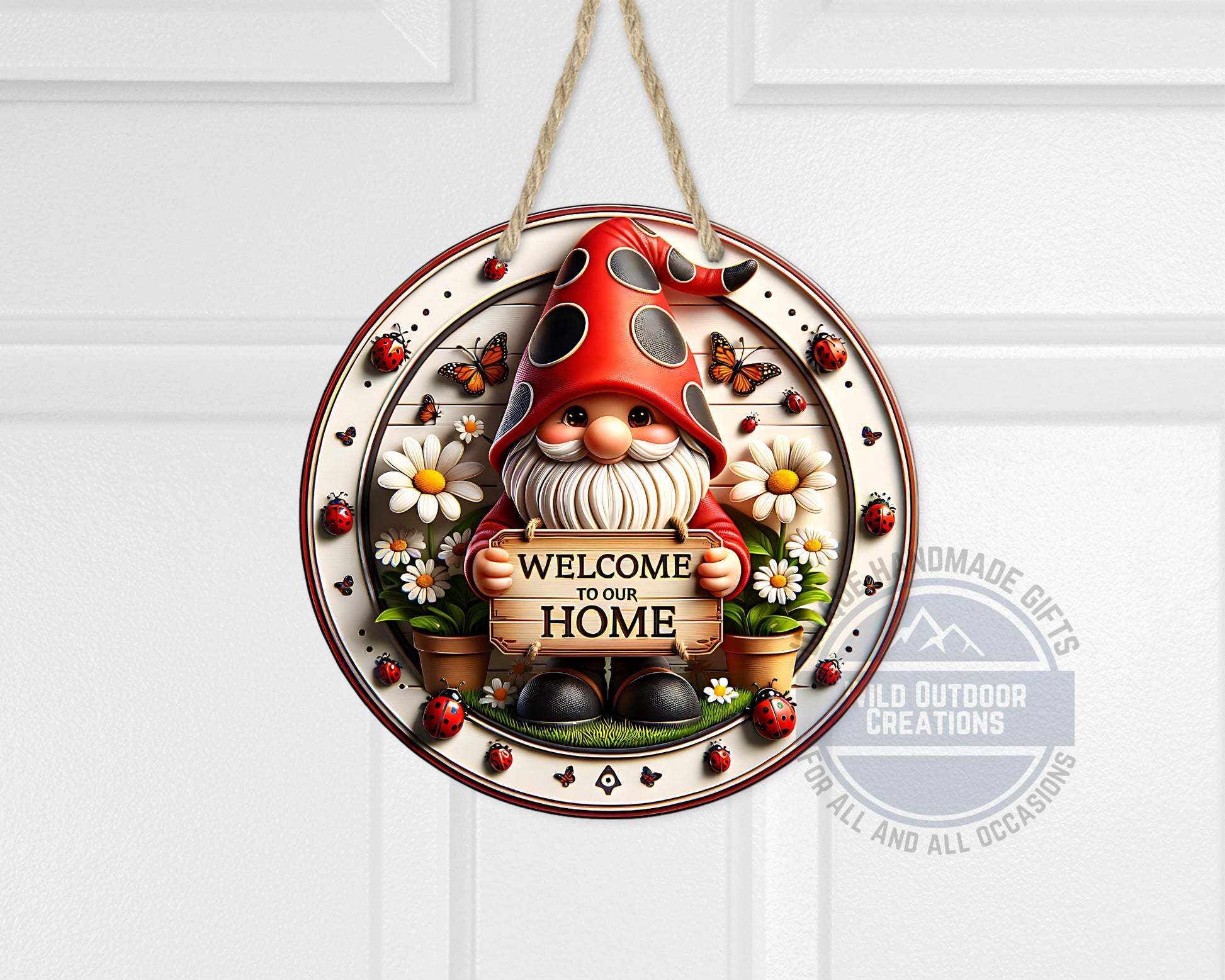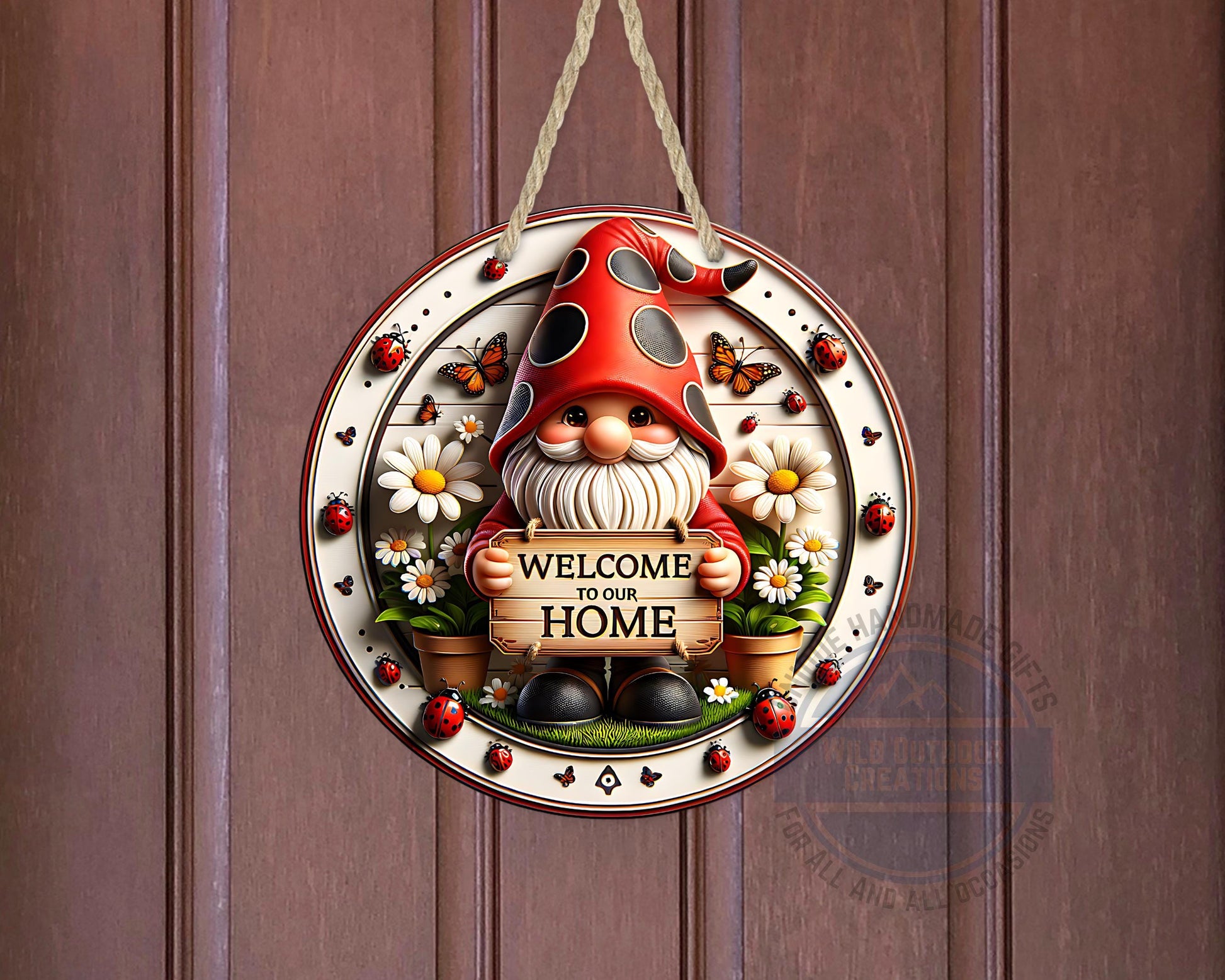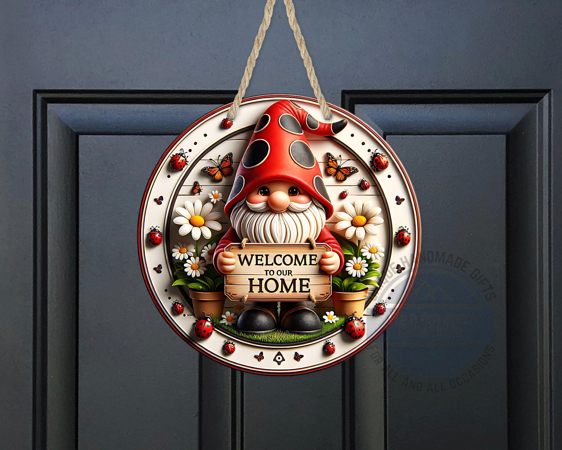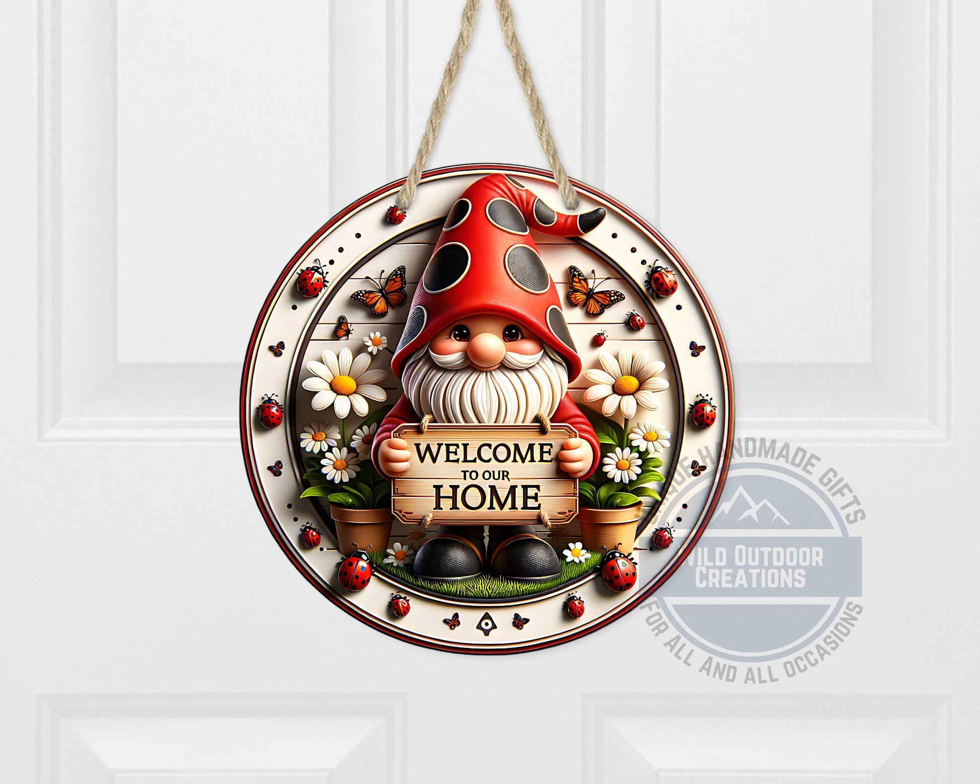 Welcome Gnome Door Hanger - Red Hat Gnome with Daisy & Ladybug Accents