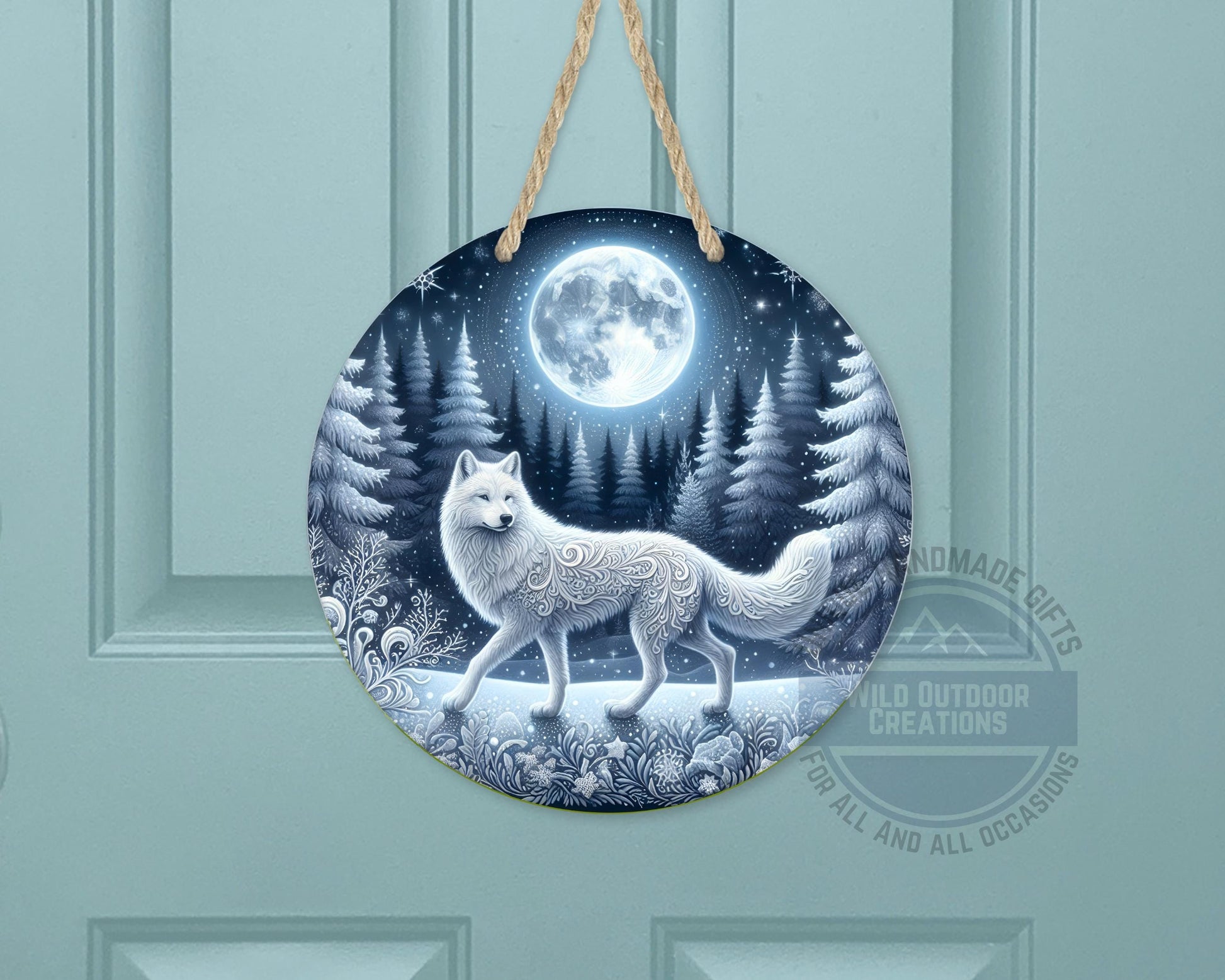 The wolf door sign is a stunning piece of rustic outdoor decor designed to bring serene nature into your home. Featuring a majestic white wolf framed by snowy pine trees under a full moon night, this wolf moon decor creates a peaceful winter forest scene that wildlife lovers will cherish. Measuring 10" x 10" x 0.025", this durable aluminum sign offers both beauty and resilience, perfect as a woodland door decor or winter cabin decor.