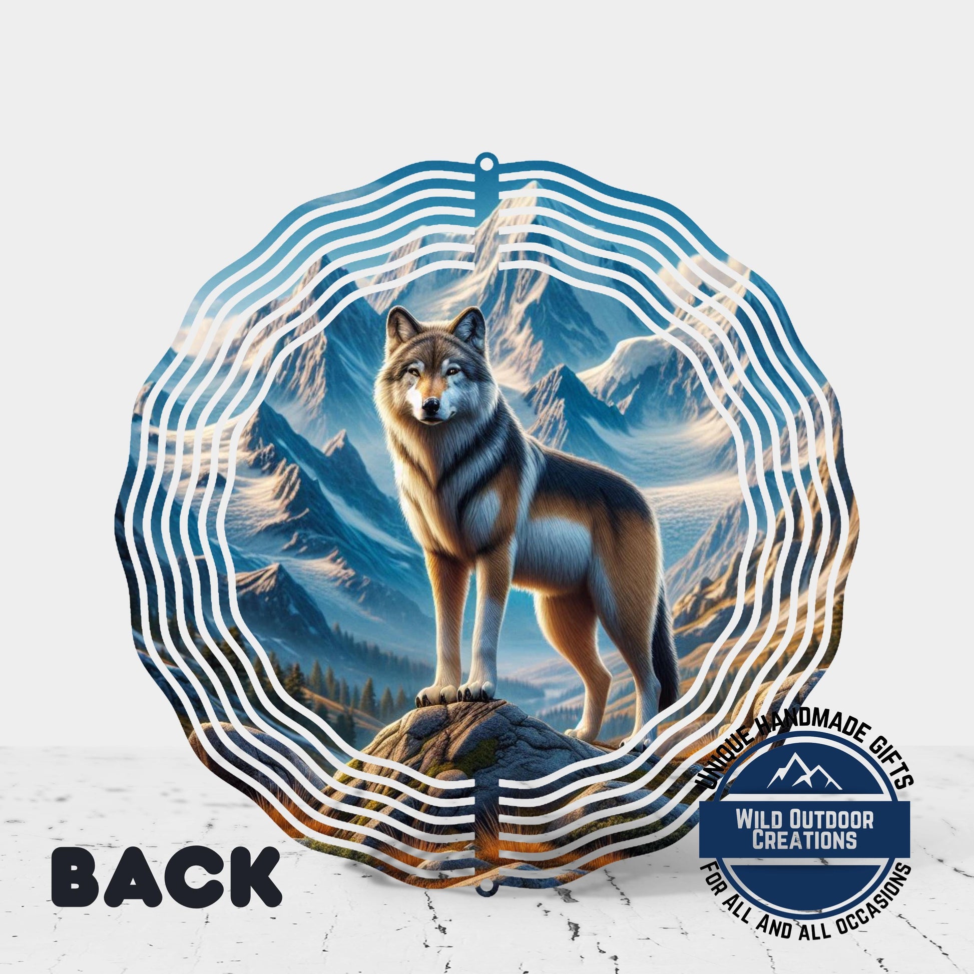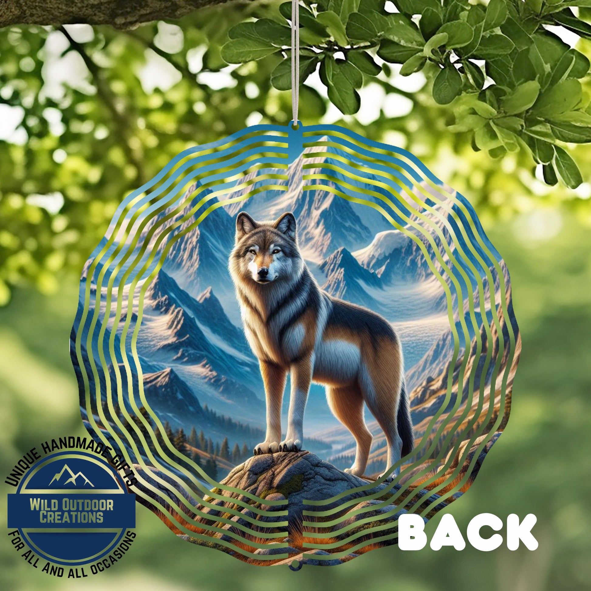 The wolf wind spinner is a stunning 10-inch double sided aluminum outdoor wind spinner designed to bring dynamic motion and vibrant color to your garden, patio, or porch. Crafted for wildlife lovers and nature enthusiasts, this wolf wind spinner adds a captivating element of mountain outdoor art that transforms any space with its graceful spinning movement and vivid wolf garden decor. Featuring UV-protected inks, this aluminum wind spinner maintains its bright colors even under harsh weather conditions, ensuring lasting beauty in your wilderness outdoor decor.