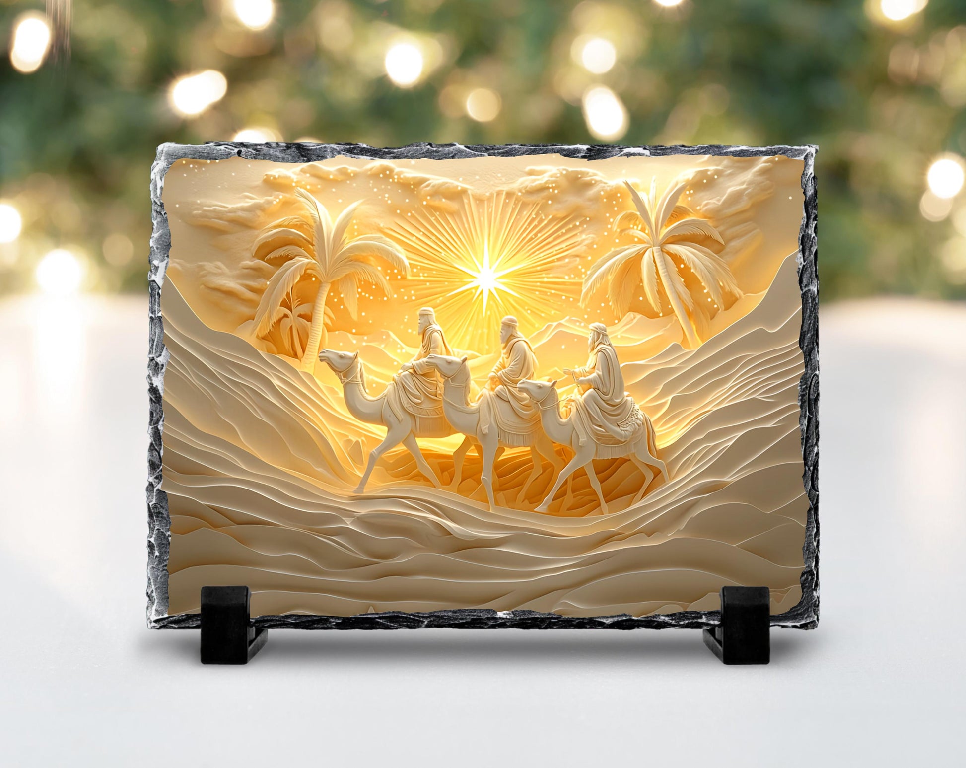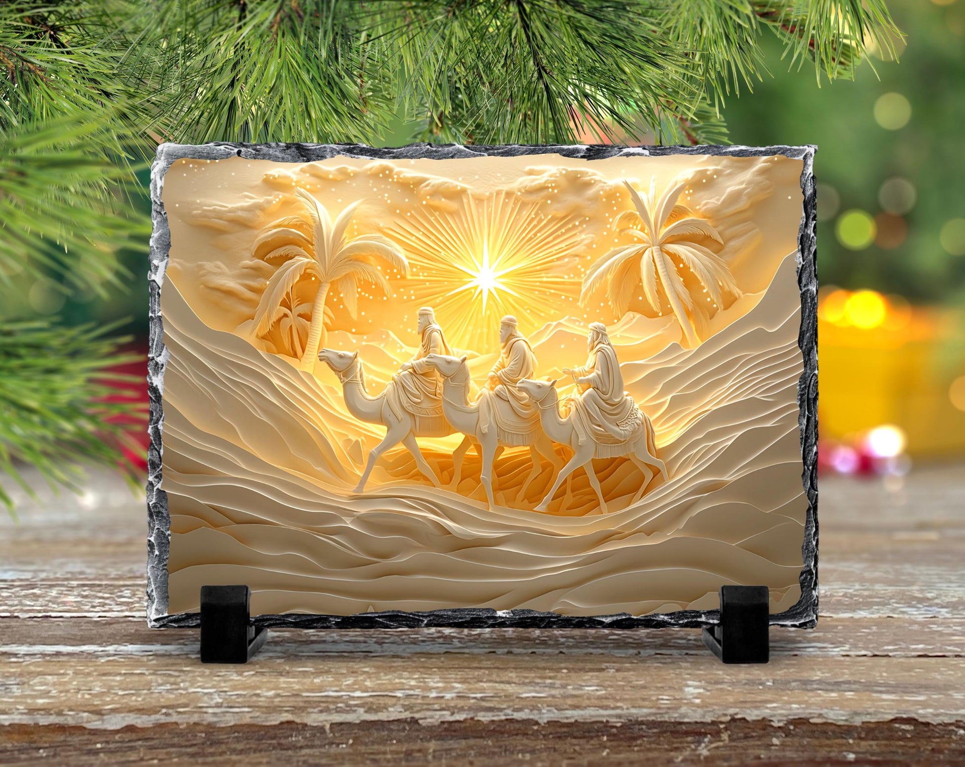 This exquisite nativity slate art features a captivating 3D-inspired depiction of the three wise men journeying on camels, elegantly illustrated in rich gold and white tones. Each piece is crafted from natural slate with unique fractured edges, measuring approximately 5.85 x 7.8 inches, with slight variations of up to 0.4 inches that enhance its handcrafted appeal. Utilizing a sublimation printing technique, this artwork showcases vibrant colors and intricate details that are both durable and resistant to fading.