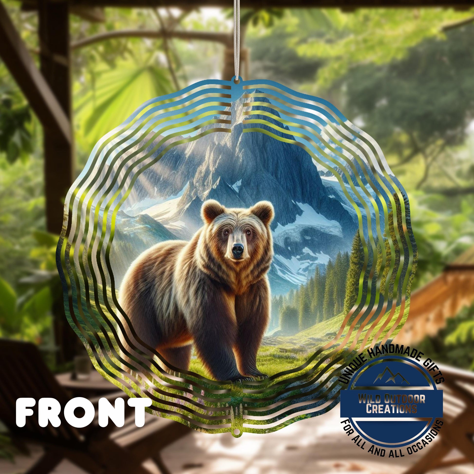 The bear mountain wind spinner is a stunning outdoor wind spinner designed to bring rustic outdoor decor and wildlife garden art to your porch, patio, or cabin yard. This aluminum garden decor piece measures 10 inches in diameter and features a double sided spinner with UV protected print that showcases a vibrant bear set against a mountain valley scene, making it an ideal bear patio decoration and nature inspired gift. Crafted for durability, it includes a 360 degree swivel hook for smooth spinning in any breeze and a durable hanging hook for easy installation, ensuring long-lasting enjoyment both indoors and outdoors.