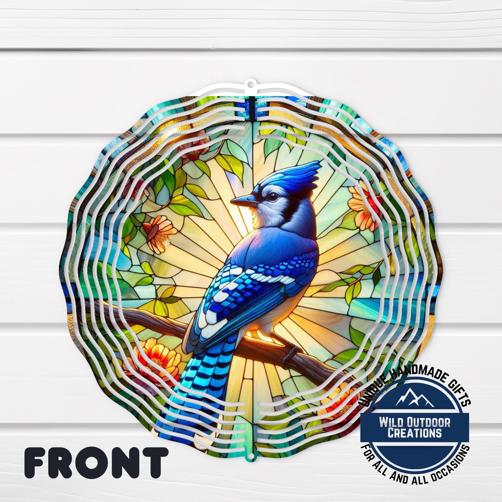 Blue Jay Wind Spinner – 10 Inch Aluminum Garden Spinner with Faux Stained Glass Decor