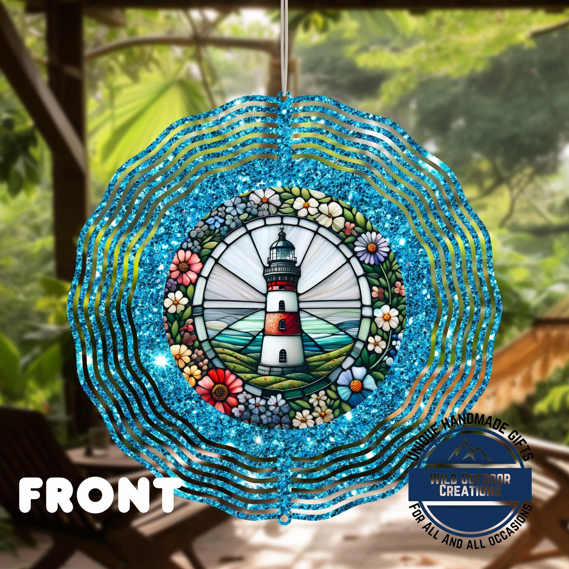 The coastal lighthouse wind spinner is a stunning aluminum outdoor garden decor piece designed to bring vibrant movement and charm to your coastal yard decor. This coastal lighthouse wind spinner features a faux stained glass spinner with a sparkling blue glitter garden spinner background, creating an eye-catching nautical garden art display. Measuring 10 inches in diameter, this aluminum wind spinner is built for durability and lasting beauty in any outdoor setting.