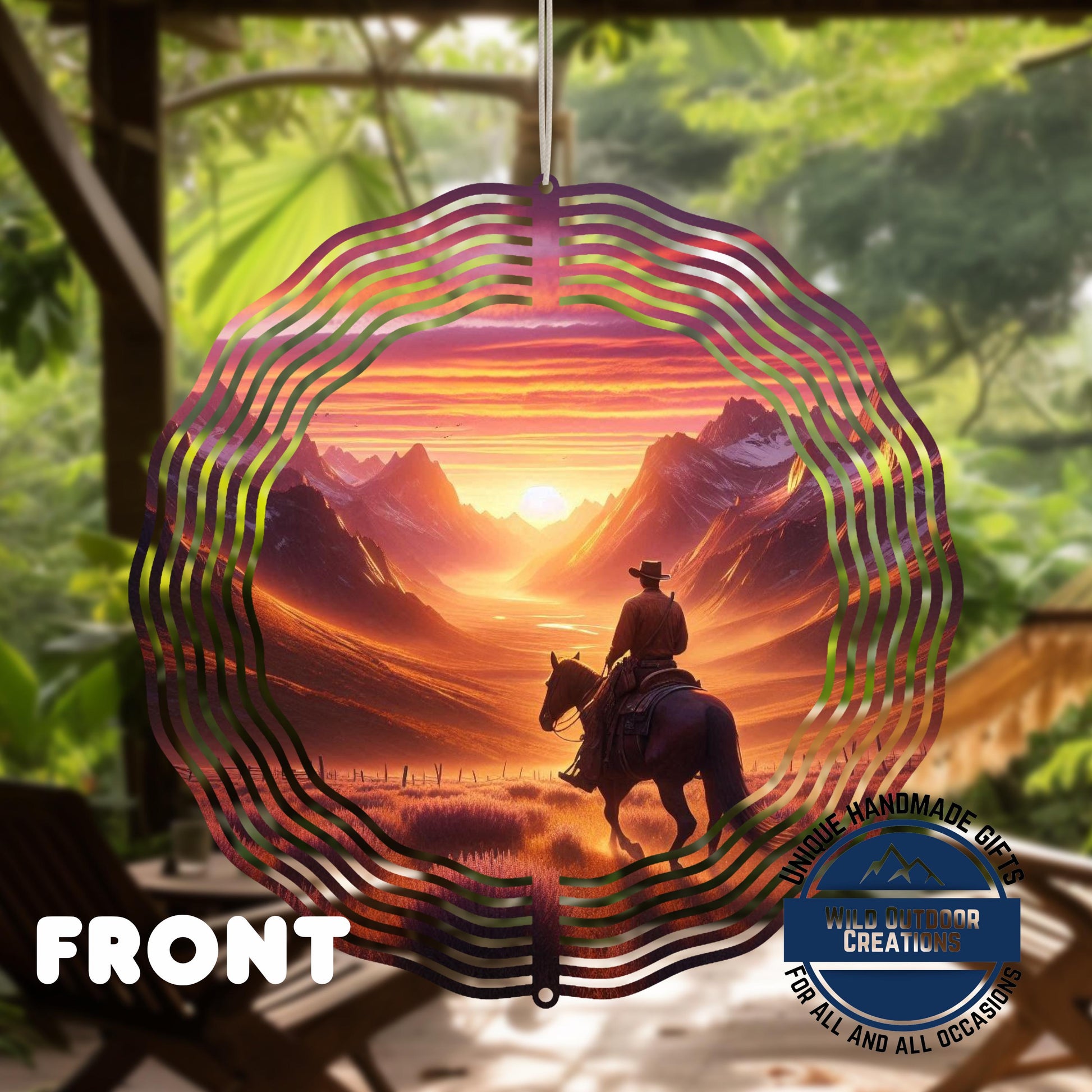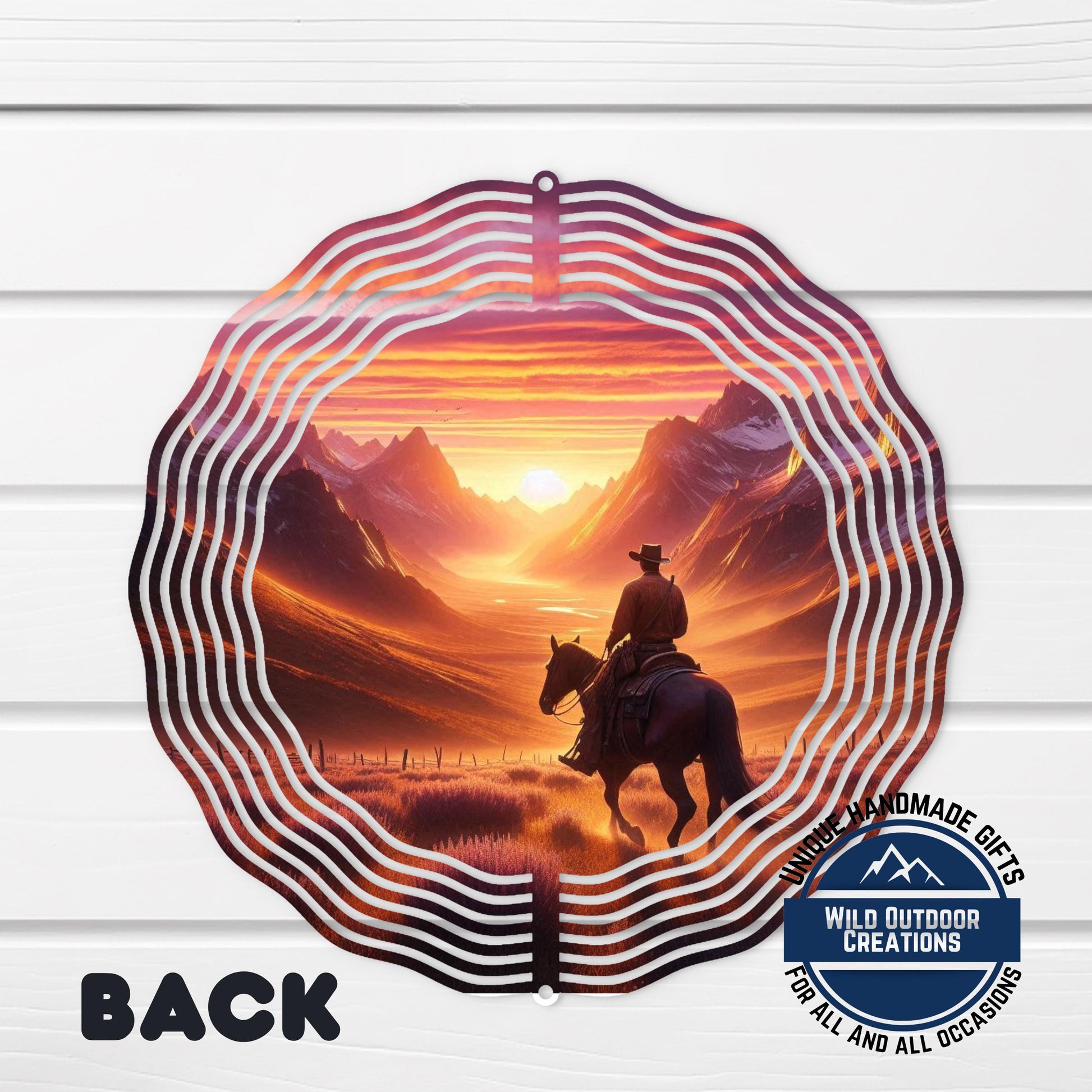 The cowboy wind spinner brings rustic charm and motion to your outdoor space with its stunning horse sunset art scene. This 10-inch outdoor wind spinner features a vivid double sided spinner design that captures the spirit of the open range, making it perfect for western yard decor enthusiasts seeking to enhance their garden or patio with authentic country yard art. Crafted from premium aluminum, this cowboy wind spinner offers durability and beauty that lasts.