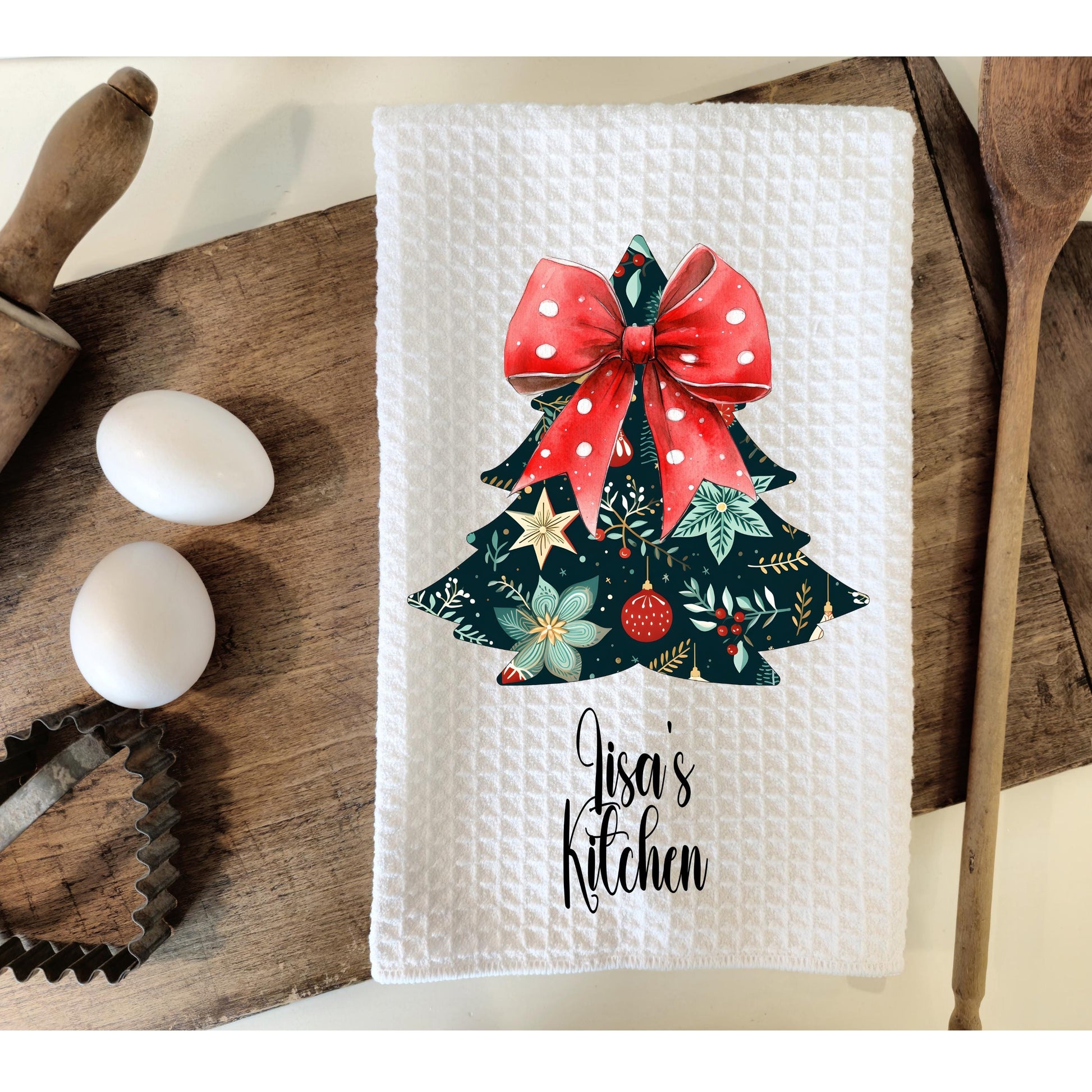 Add a touch of festive charm to your kitchen with our personalized waffle weave microfiber towel, measuring 16"x24". Adorned with a delightful floral Christmas tree design and a playful red and white polka dot bow, this towel seamlessly combines practicality with whimsy. It’s an ideal choice for enhancing your holiday decor or as a thoughtful gift for friends and family.