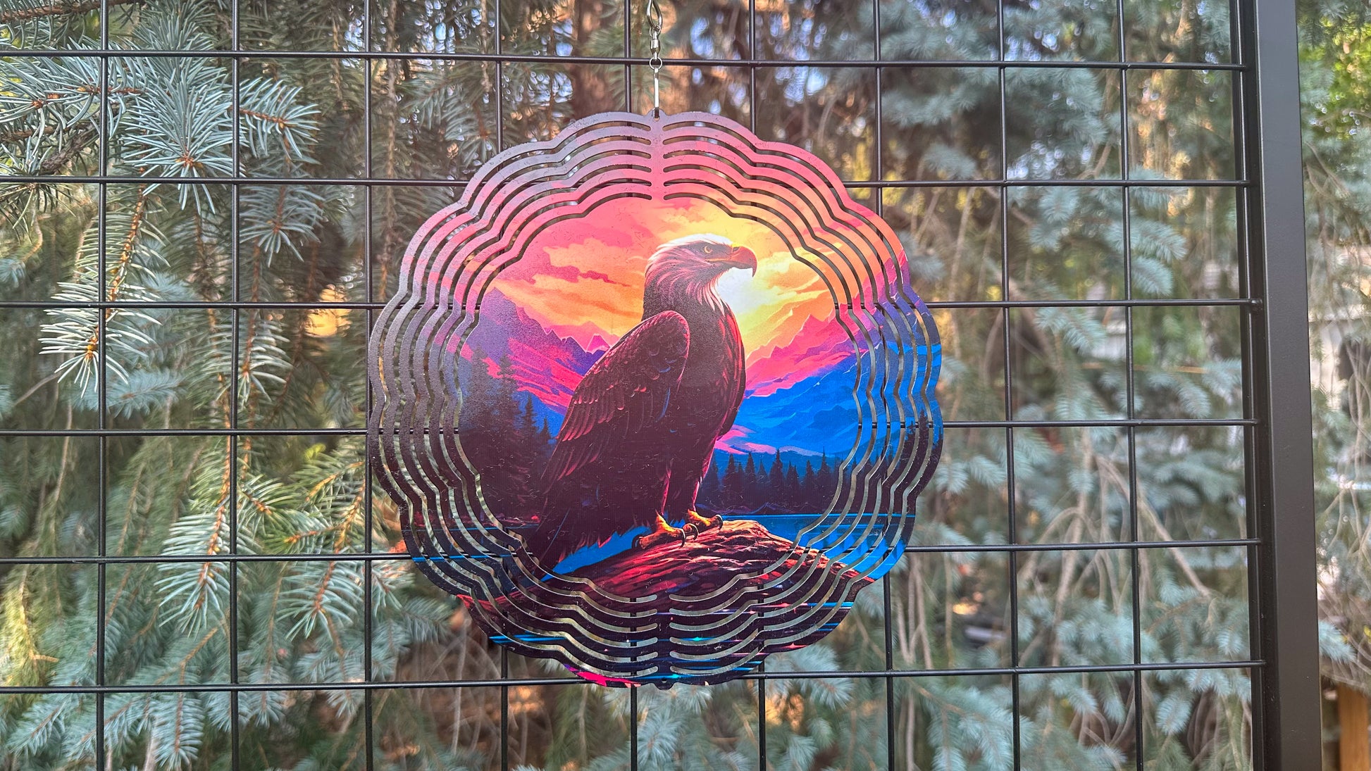 Item Description: Eagle at Sunset with a Colorful background. 10'inch 3D Wind Spinner