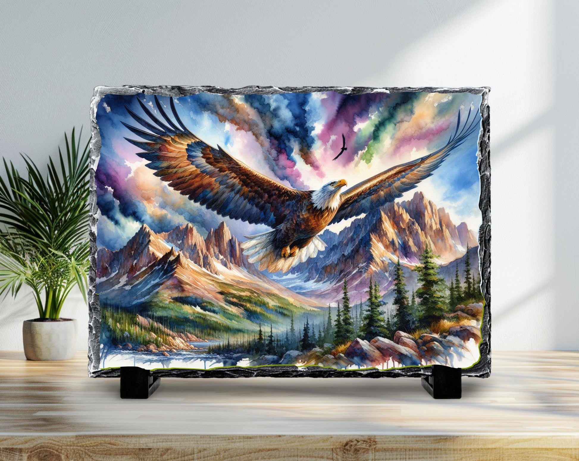 Experience the beauty of nature with this handcrafted slate plaque, showcasing a stunning watercolor depiction of an eagle soaring gracefully over a majestic mountain valley. With its expansive wings and powerful presence, the eagle symbolizes freedom, strength, and the raw splendor of the wilderness, gliding effortlessly above vibrant greenery and rugged peaks.