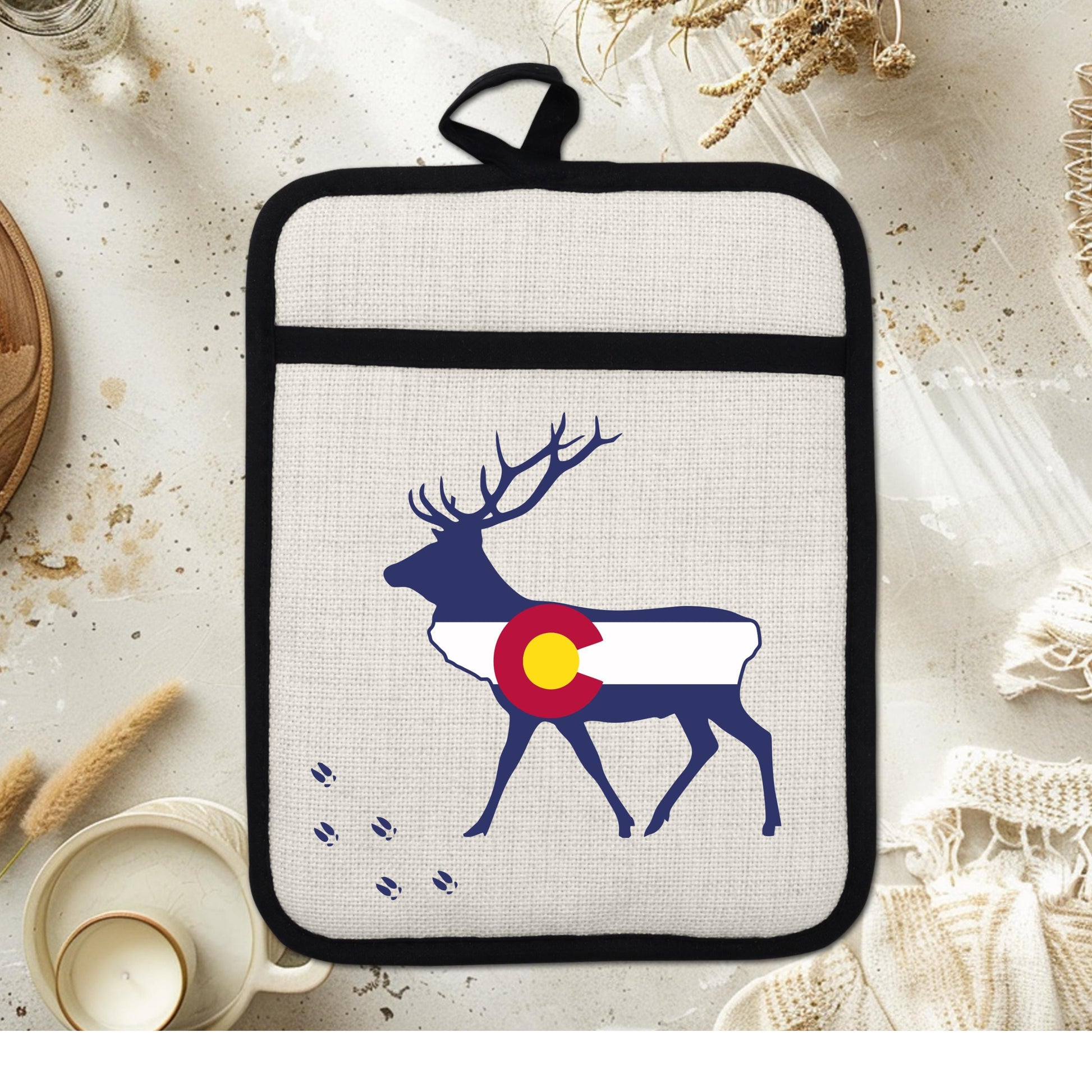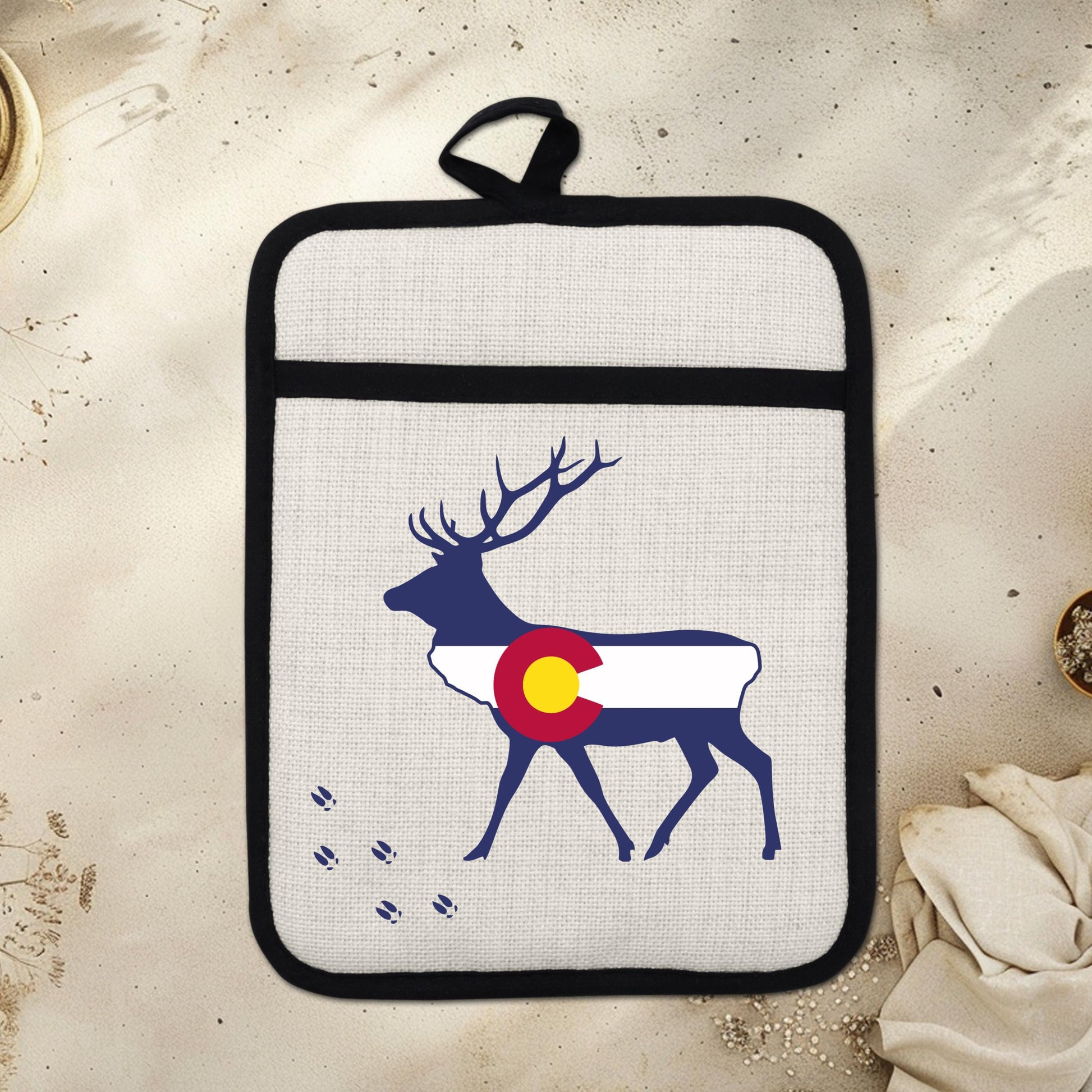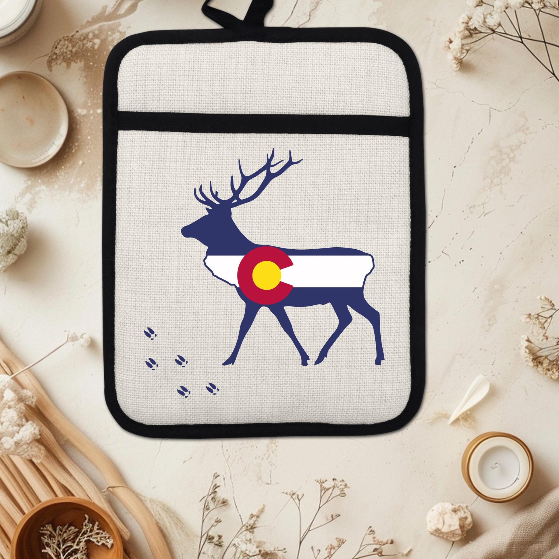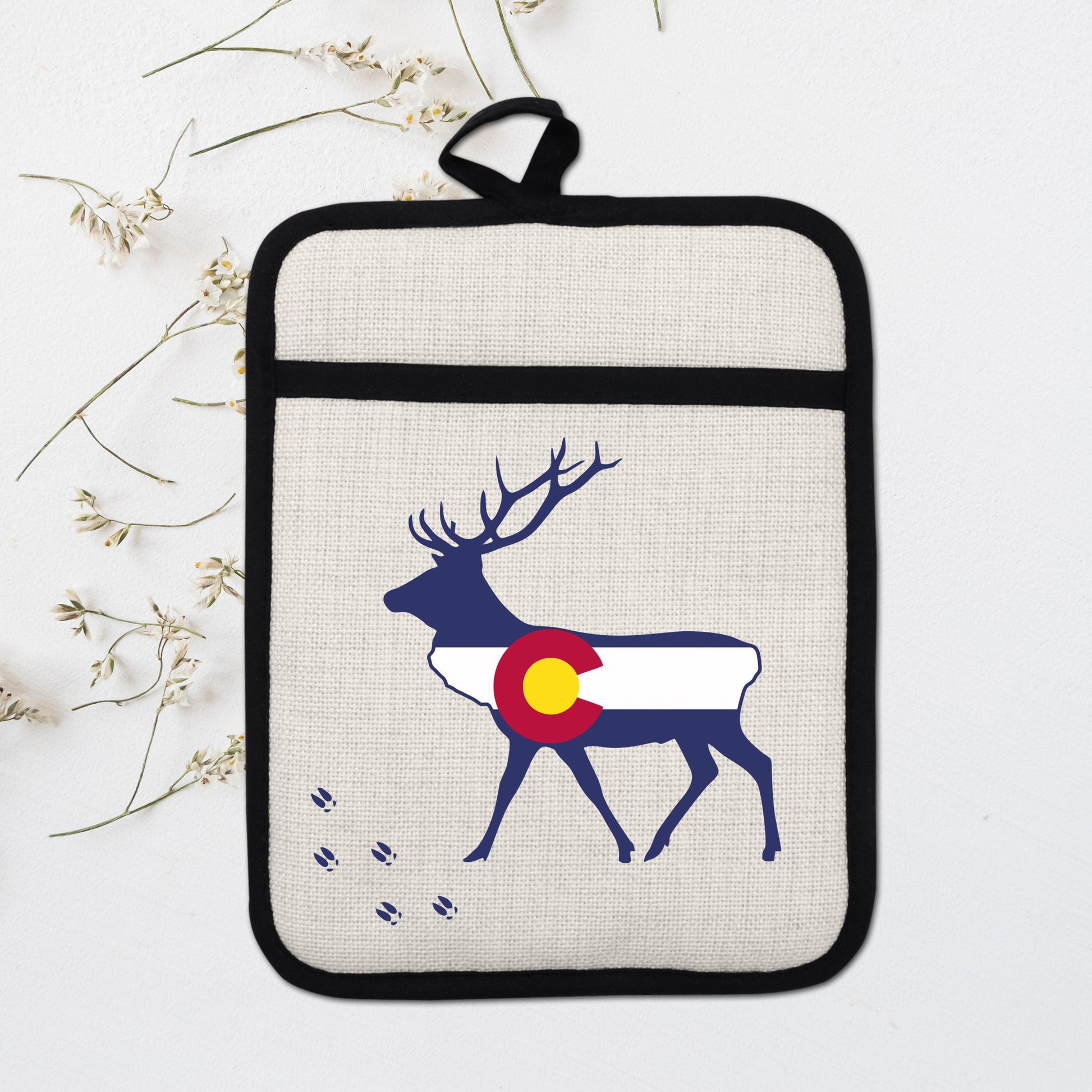 The elk pot holder is a versatile kitchen accessory designed to combine rugged Rocky Mountain style with practical cooking heat protection. Measuring 9 x 7 inches, this Colorado pot holder features a colorful sublimation print of a bold elk silhouette intertwined with the Colorado state flag, making it an ideal choice for rustic kitchen decor lovers. Its linen front offers durability and vibrant color retention, while the silicone back pot holder provides reliable heat resistance and doubles as a trivet to protect your countertops from hot pots and pans.
