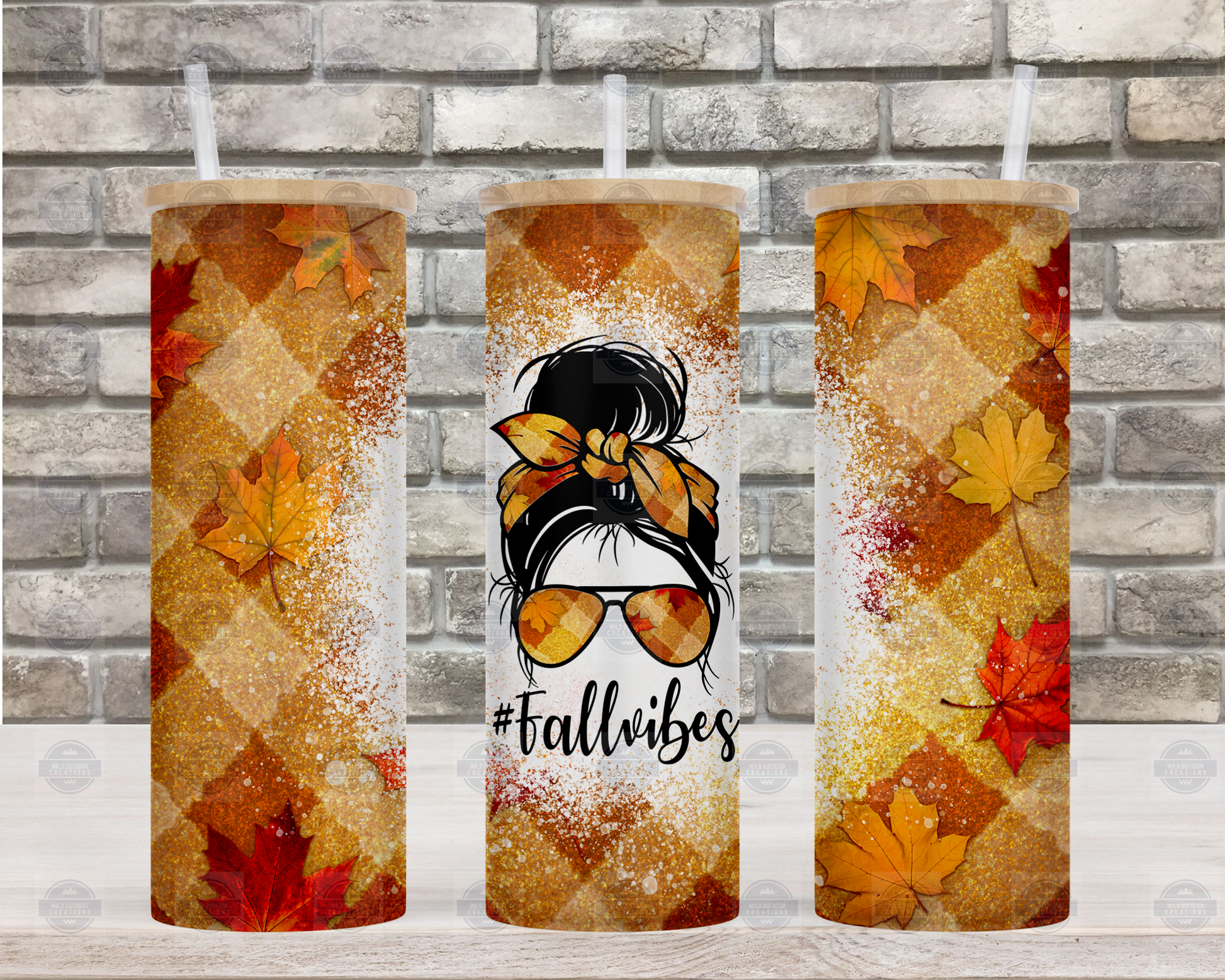 The nights are getting darker earlier which means fall is on the way. This fall vibe glass tumbler features a plaid of fall colors orange and yellow, with a messy bun woman and #Fallvibes.