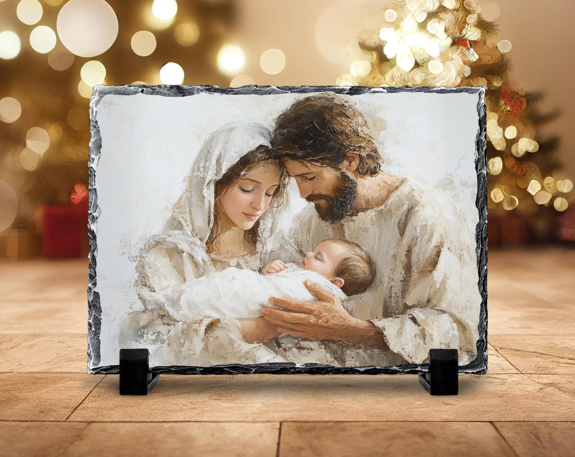 Celebrate the enduring story of faith with our handcrafted watercolor nativity scene, beautifully displayed on a natural slate plaque. Measuring approximately 5.85 x 7.8 inches, each piece features distinctive fractured edges that lend a rustic charm to your sacred space. The image, created using high-quality sublimation printing, depicts Mary holding Jesus, with Joseph lovingly embracing them, rendered in soft watercolor tones that evoke warmth and reverence.
