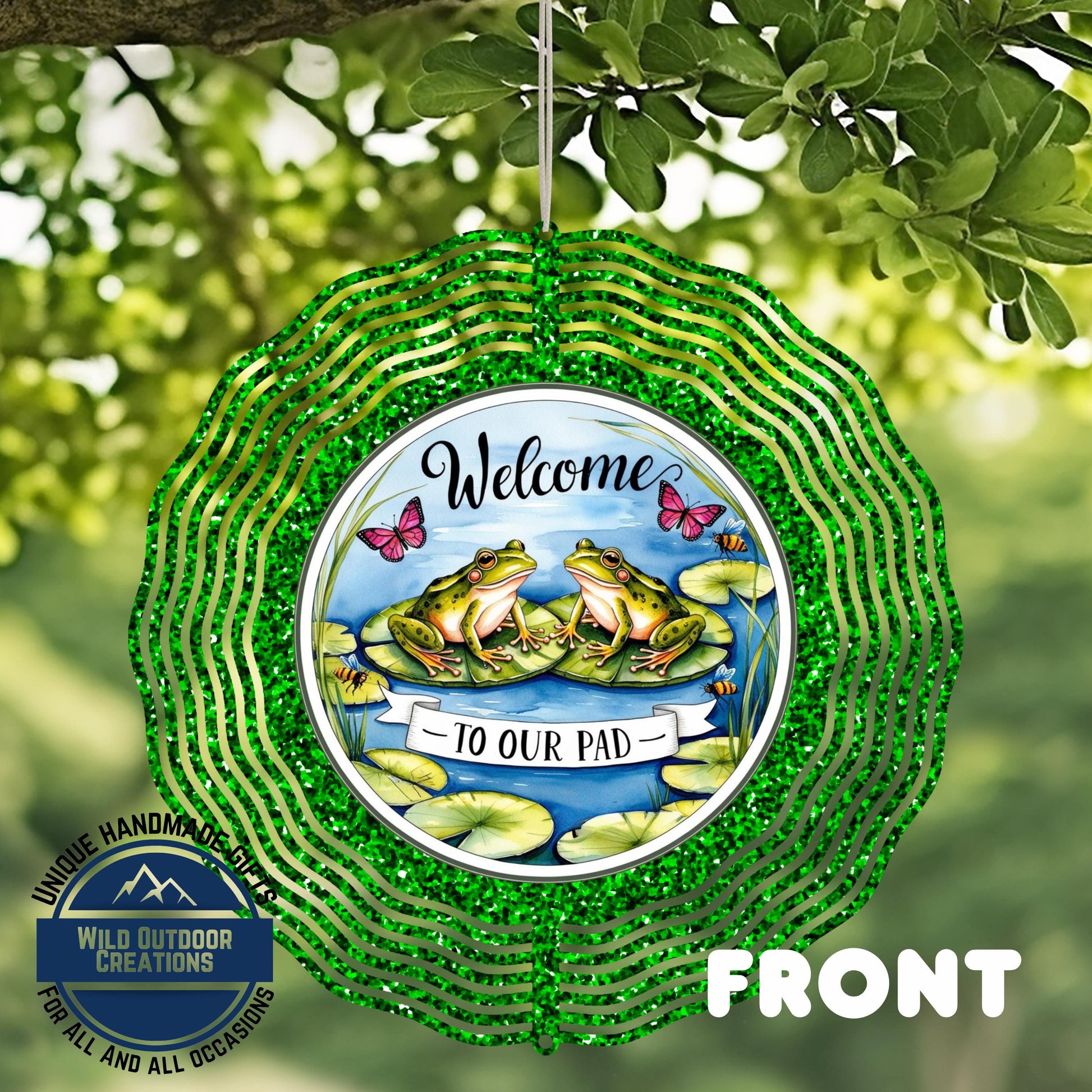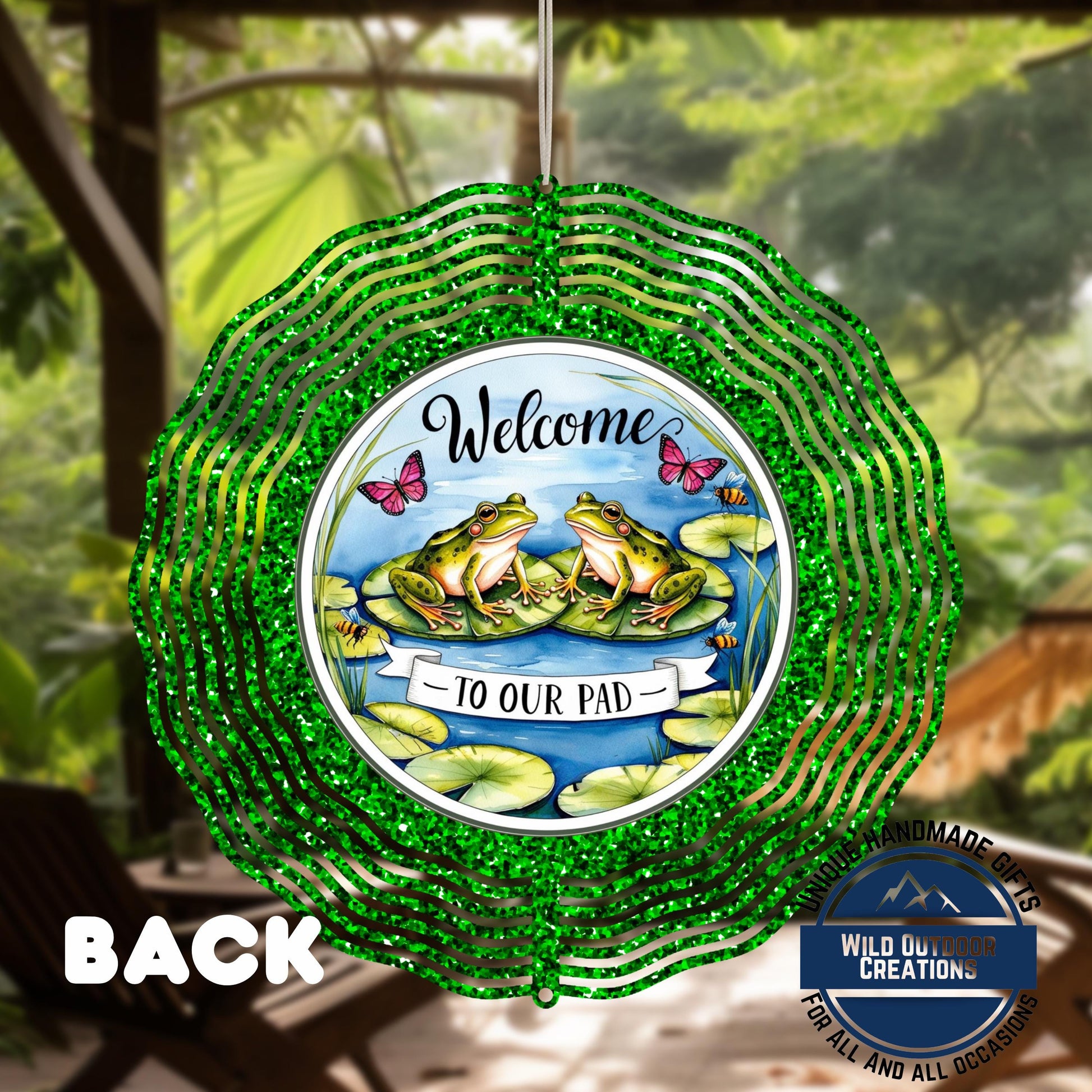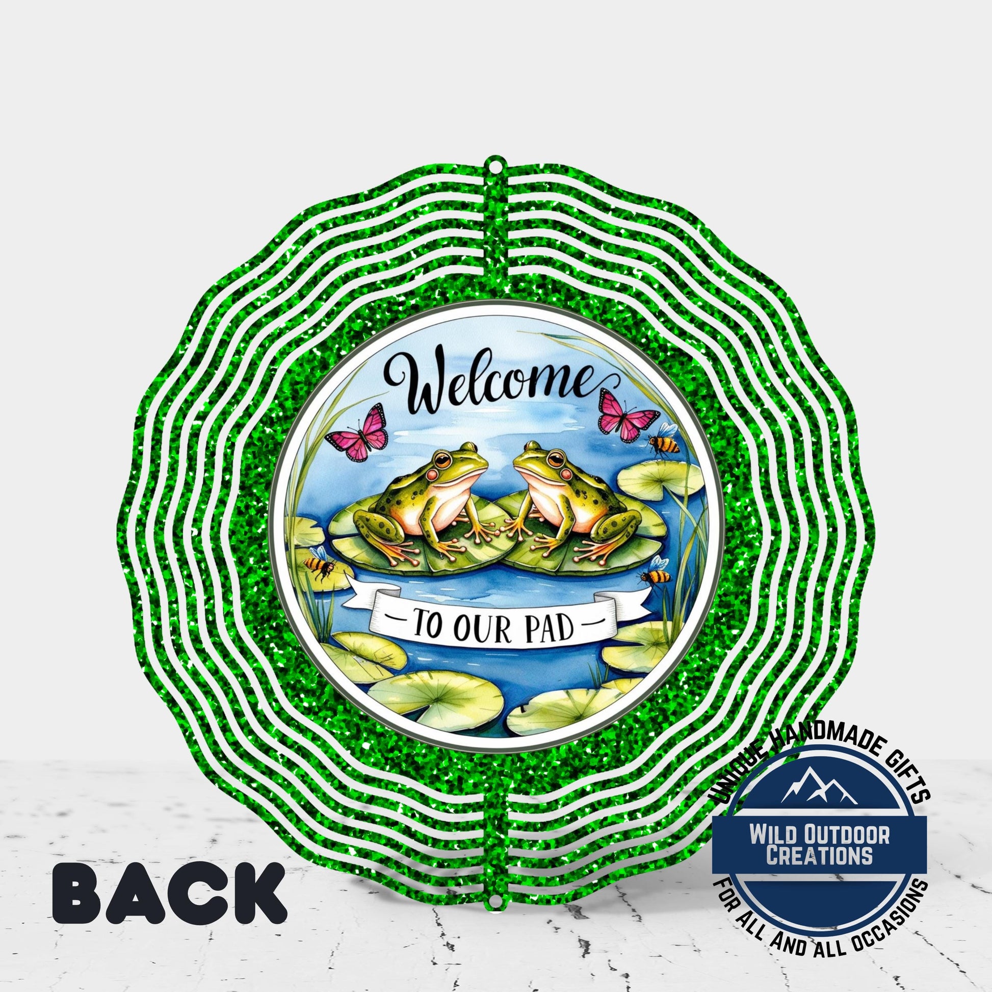 The Frog Garden Spinner is a charming frog wind spinner designed to enhance your outdoor garden decor while providing a cheerful patio decor spinner that delights frog lovers and garden enthusiasts. This whimsical garden ornament features two playful frogs perched on lily pads against a vibrant blue green glitter spinner background, creating a welcome garden sign that adds personality and movement to any outdoor space. Crafted with durable aluminum and UV-protected inks, this frog garden spinner ensures lasting color vibrancy and smooth spinning action even under direct sunlight.
