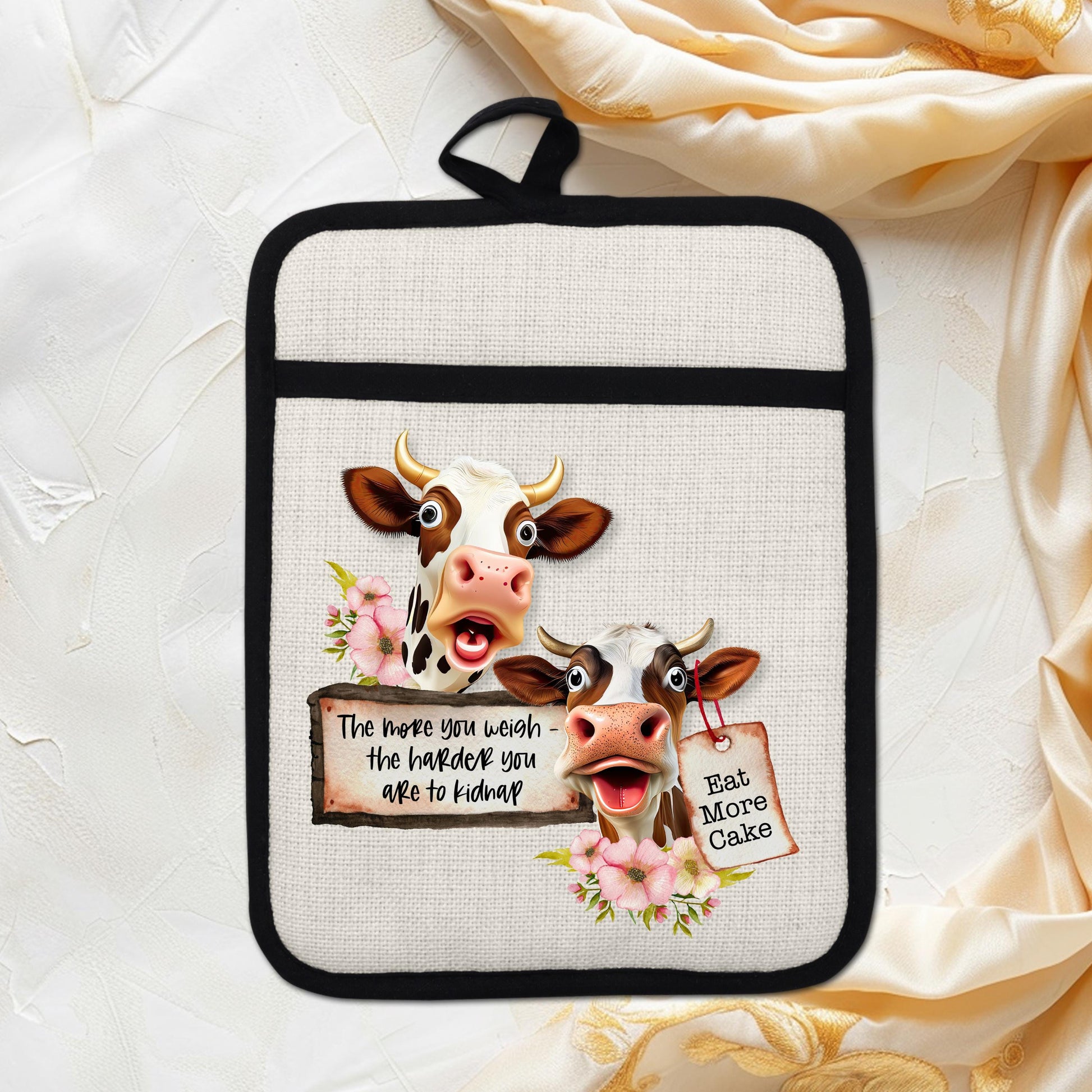 Add a touch of humor to your kitchen with this delightful pot holder featuring two charming cows adorned with floral accents. With cheeky sayings like “The more you weigh, the harder you are to kidnap” and “Eat more cake,” it’s perfect for farmhouse enthusiasts, avid bakers, and anyone who enjoys a good laugh while cooking.