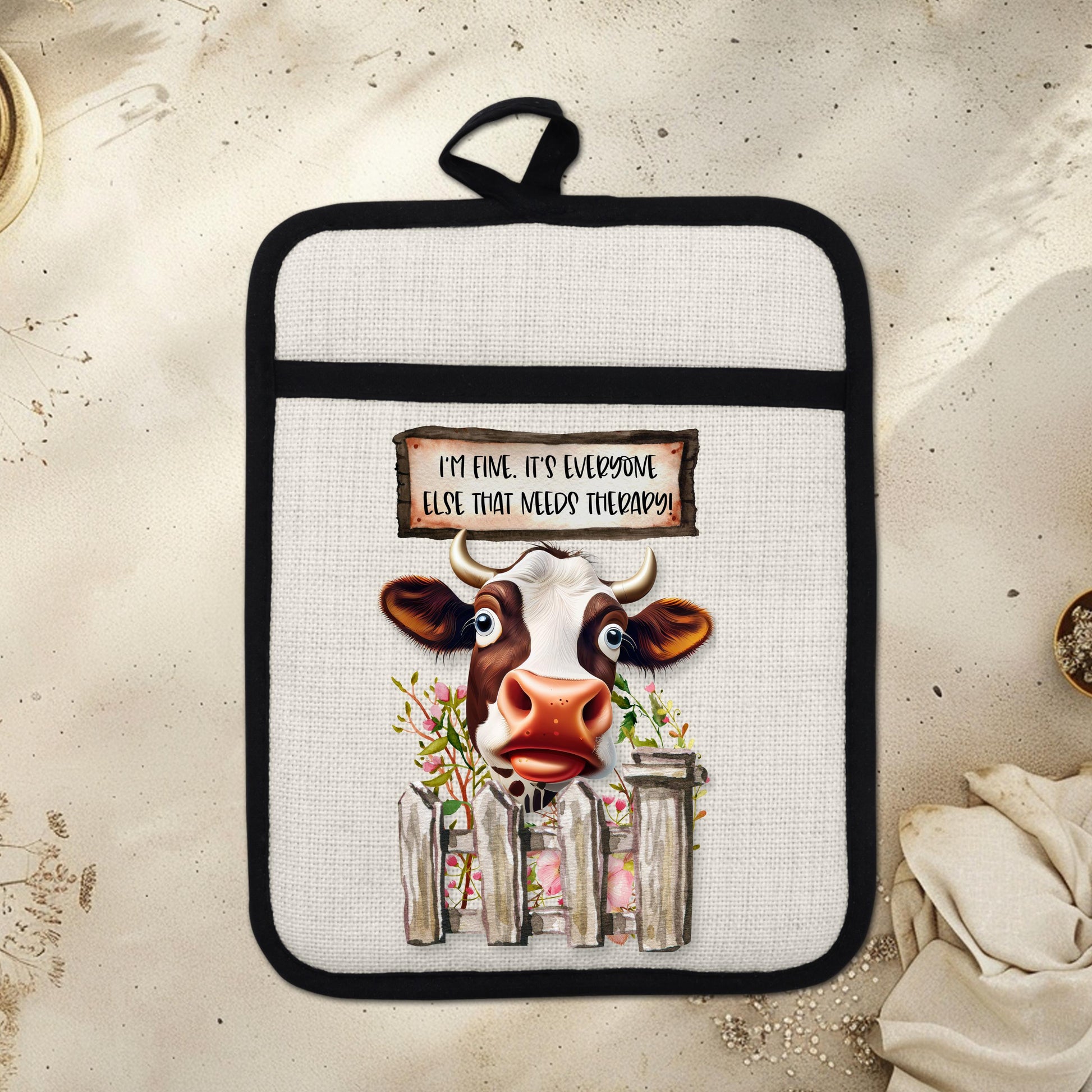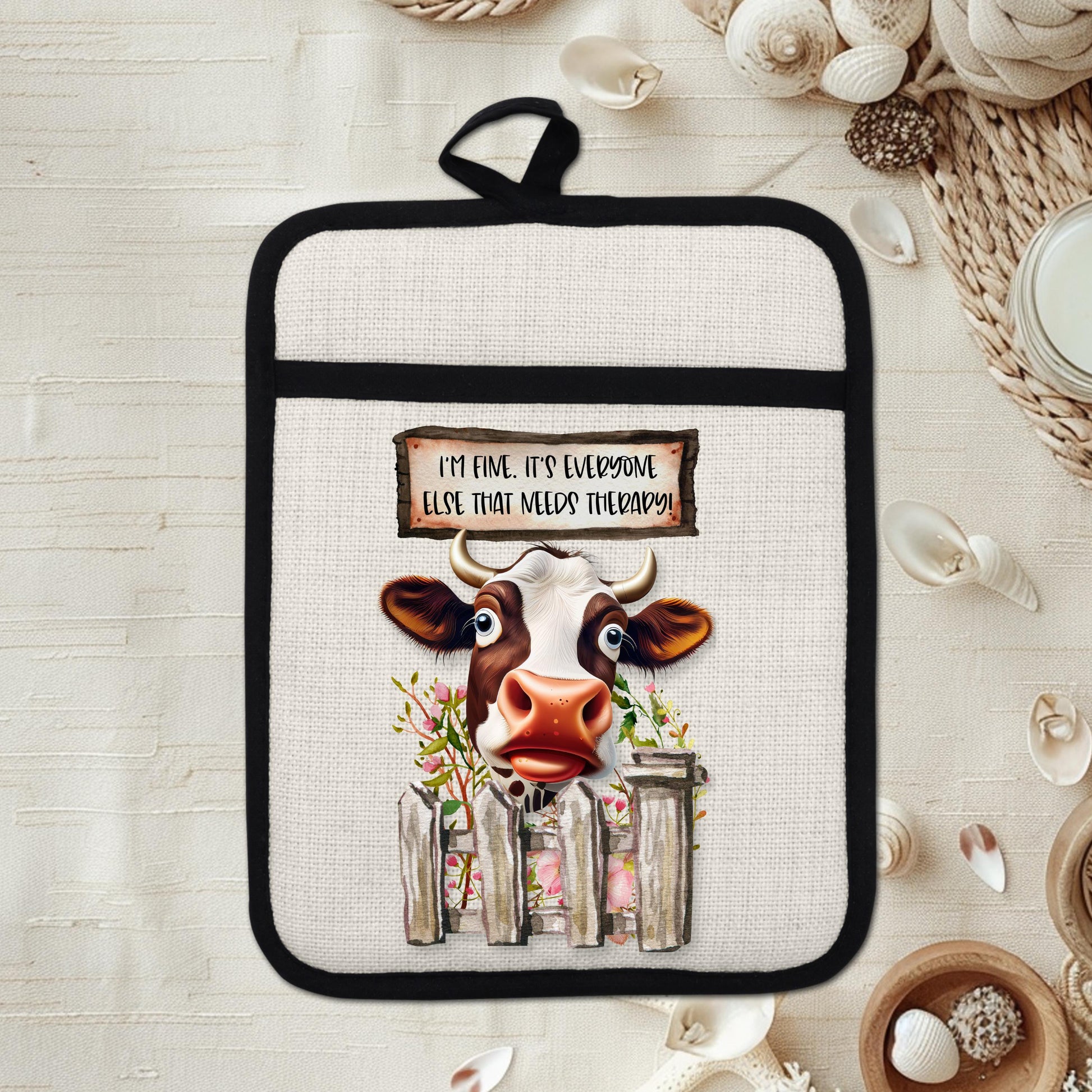 Funny Cow Pot Holder with Quirky Fence Design Flowers - Im Fine Everyone Else Needs Therapy Linen Hot Pad