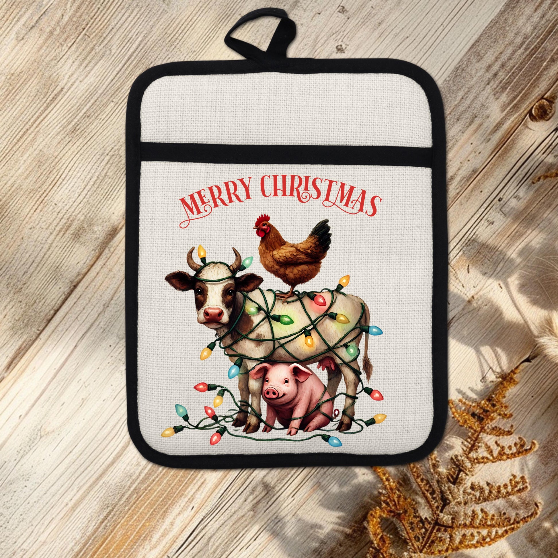 Celebrate the holiday season with this charming linen pot holder featuring a delightful trio of barnyard friends—a cow, a pig, and a chicken—playfully adorned with Santa hats and twinkling Christmas lights. Measuring 9x7 inches, this festive kitchen accessory is perfect for adding a cheerful touch to your holiday decor. The joyful “Merry Christmas” message enhances its charm, making it an ideal gift for animal lovers or a whimsical addition to your seasonal kitchen.