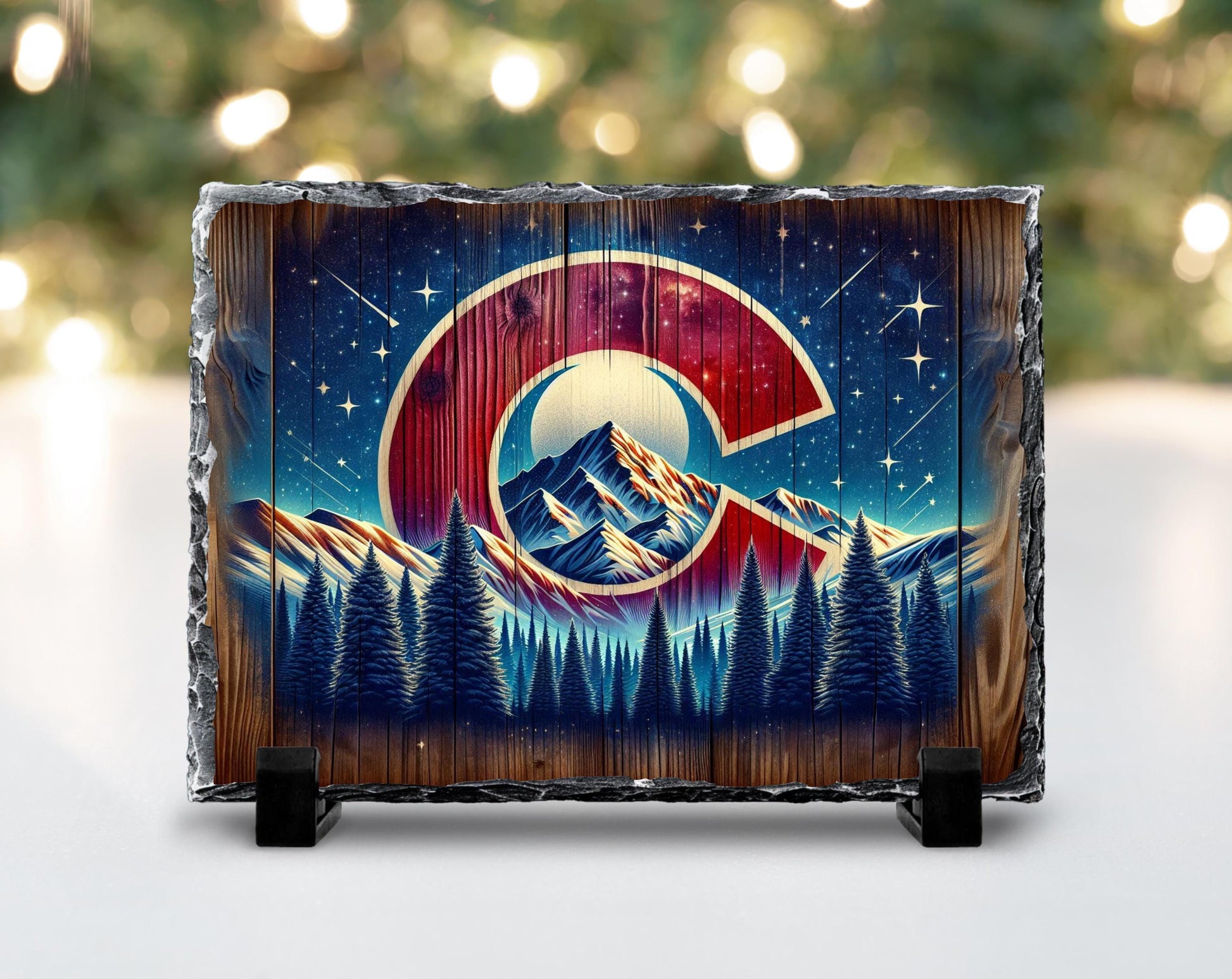 Bring the stunning beauty of Colorado into your home with this handcrafted slate art piece. Measuring 5.85 x 7.8 inches, this natural slate features beautifully fractured edges that enhance its rustic charm. Using a sublimation printing technique, the artwork vividly portrays Colorado’s iconic mountains beneath a starry night sky, complete with a glowing moon, shooting stars, and pine trees, along with the Red Wood C emblem at the center.