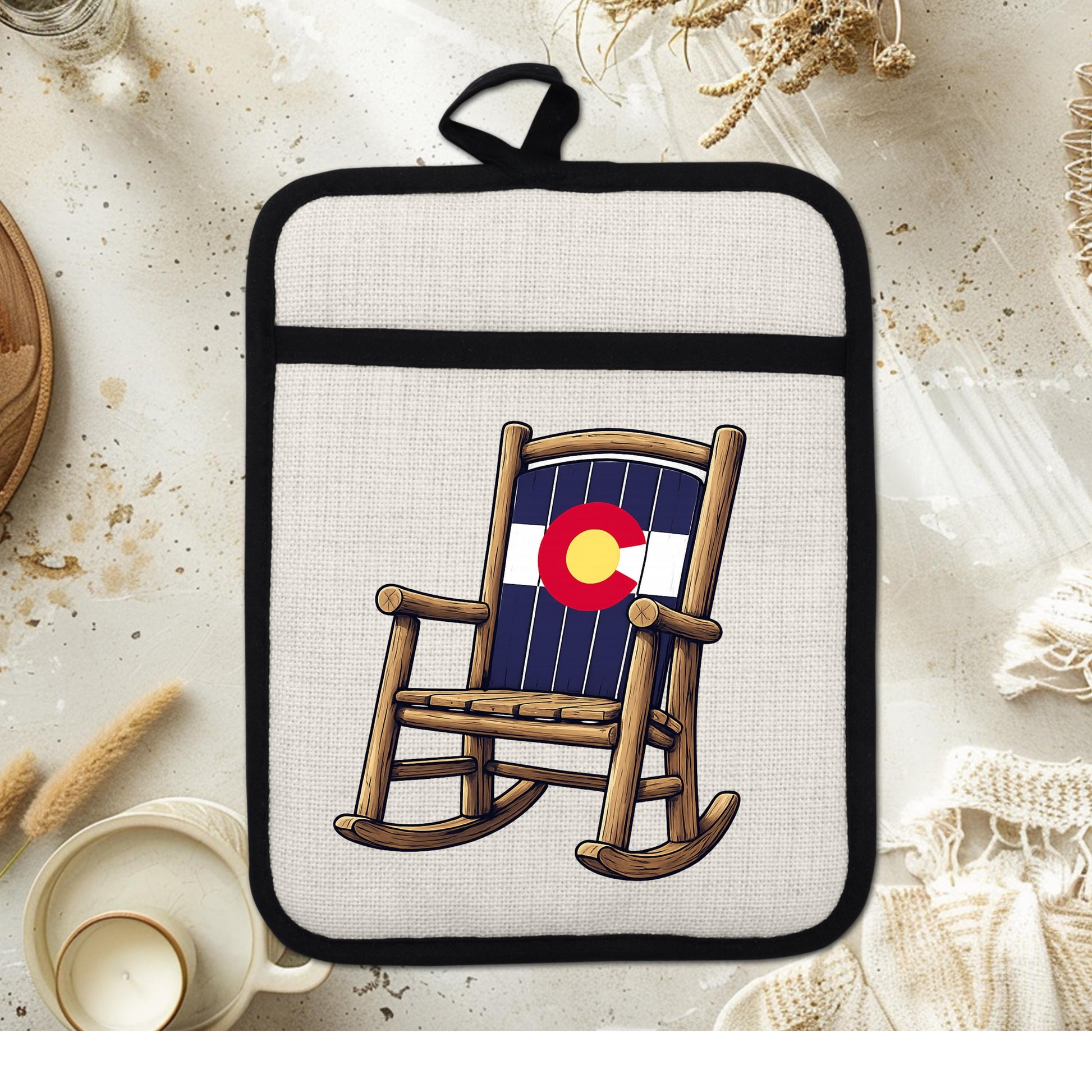 This linen oven mitt is designed to bring both style and function into your home. The heat resistant silicone backing protects surfaces while the pocket grip ensures safe handling, reducing the risk of burns. Featuring a charming rocking chair pot holder motif combined with the iconic Colorado state flag, this piece fits seamlessly into rustic kitchen decor or colorado cabin decor themes. It has been tested for durability and heat resistance, providing peace of mind during everyday cooking.