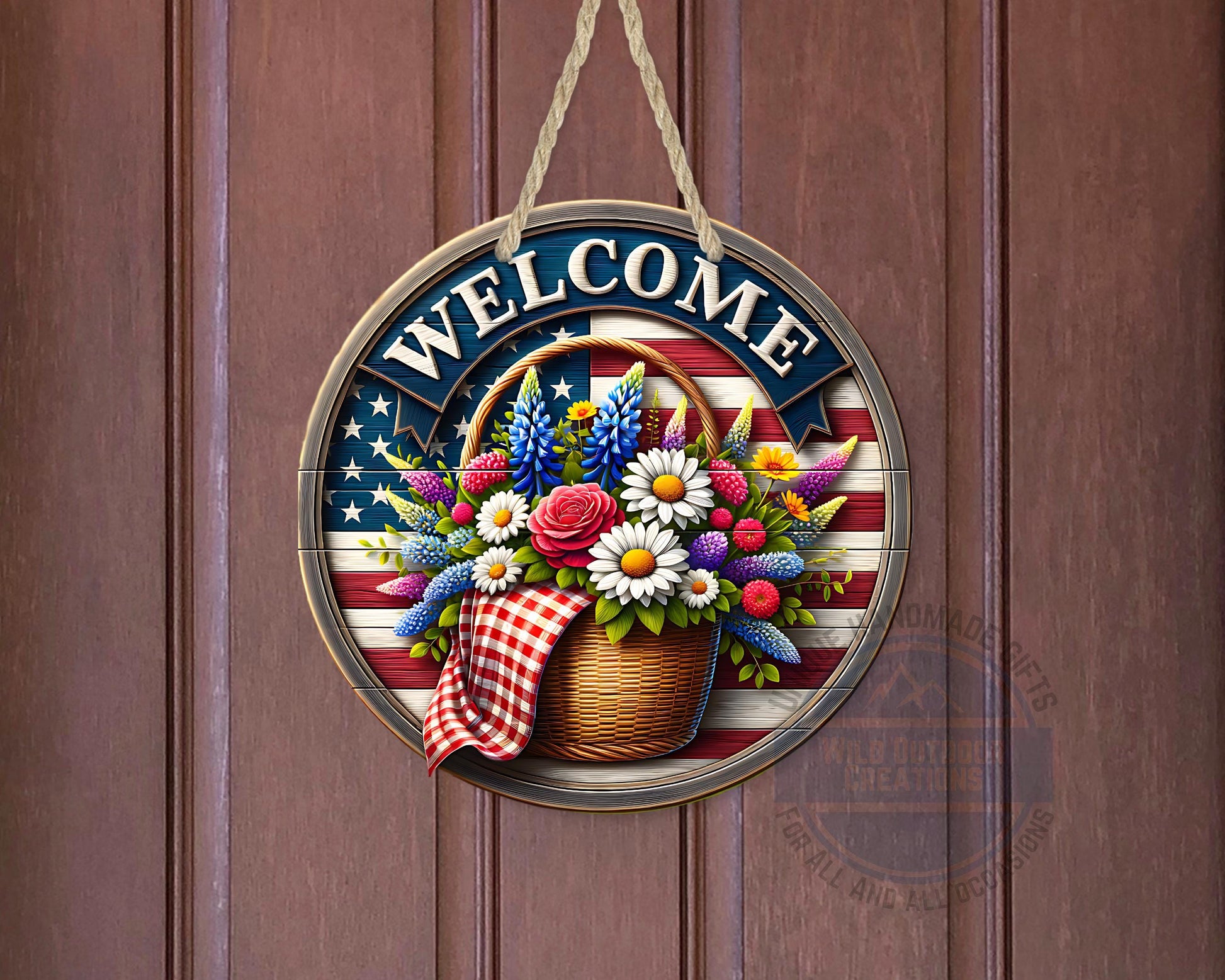 This patriotic door hanger is an aluminum outdoor sign designed to showcase your USA pride while adding charm and color to your front porch welcome. Measuring 10 inches by 10 inches with a slim 0.025-inch thickness, this durable outdoor hanger features a vibrant American flag sign combined with a patriotic floral basket, making it the perfect summer porch sign or 4th of July decoration that lasts season after season. Crafted from premium lightweight aluminum, the sign uses durable sublimation printing to ensure vivid colors that resist peeling, cracking, and fading even with extended outdoor exposure.