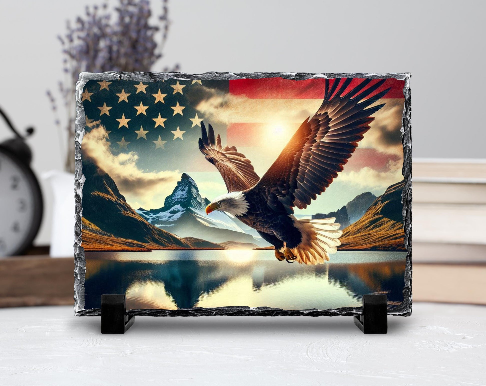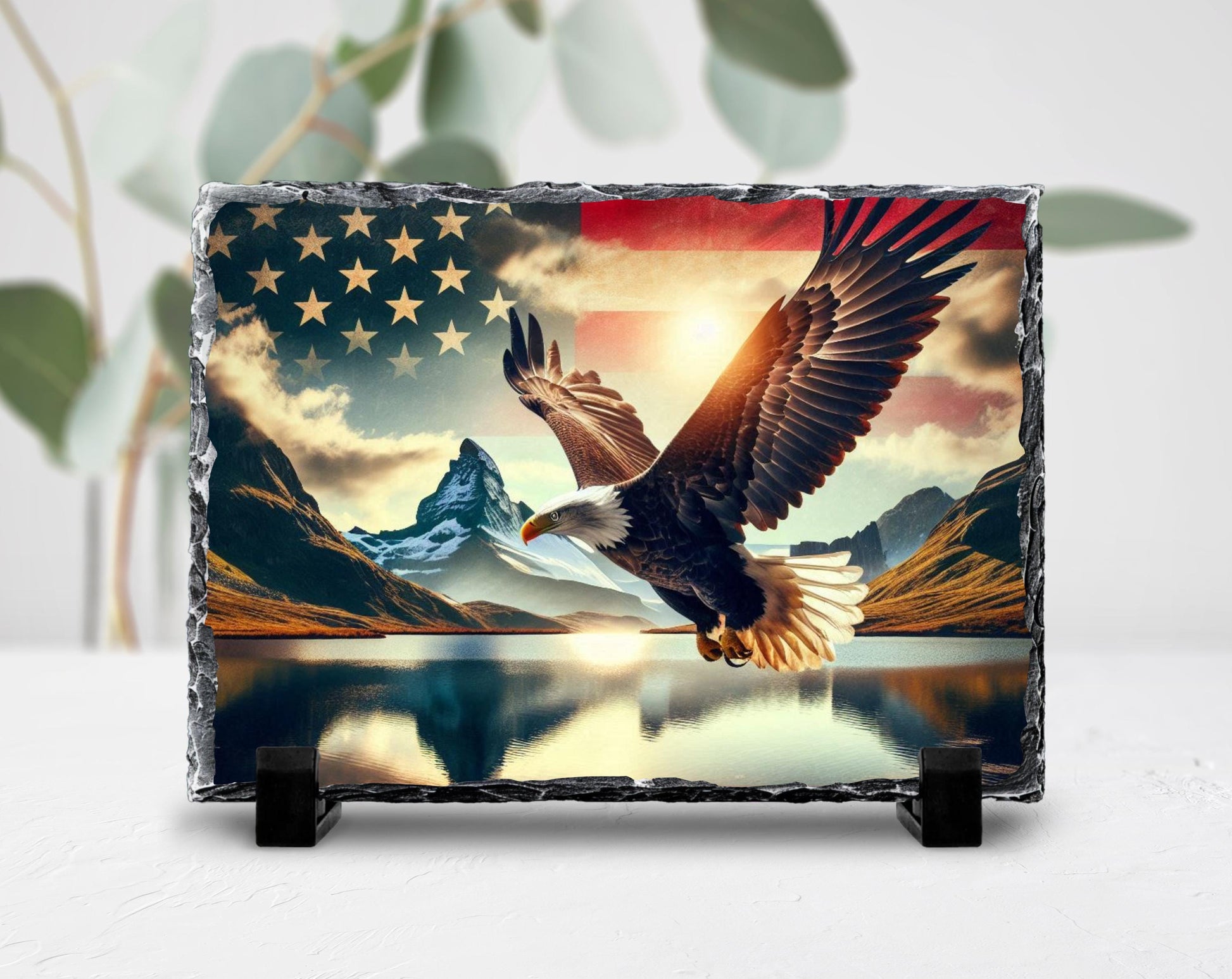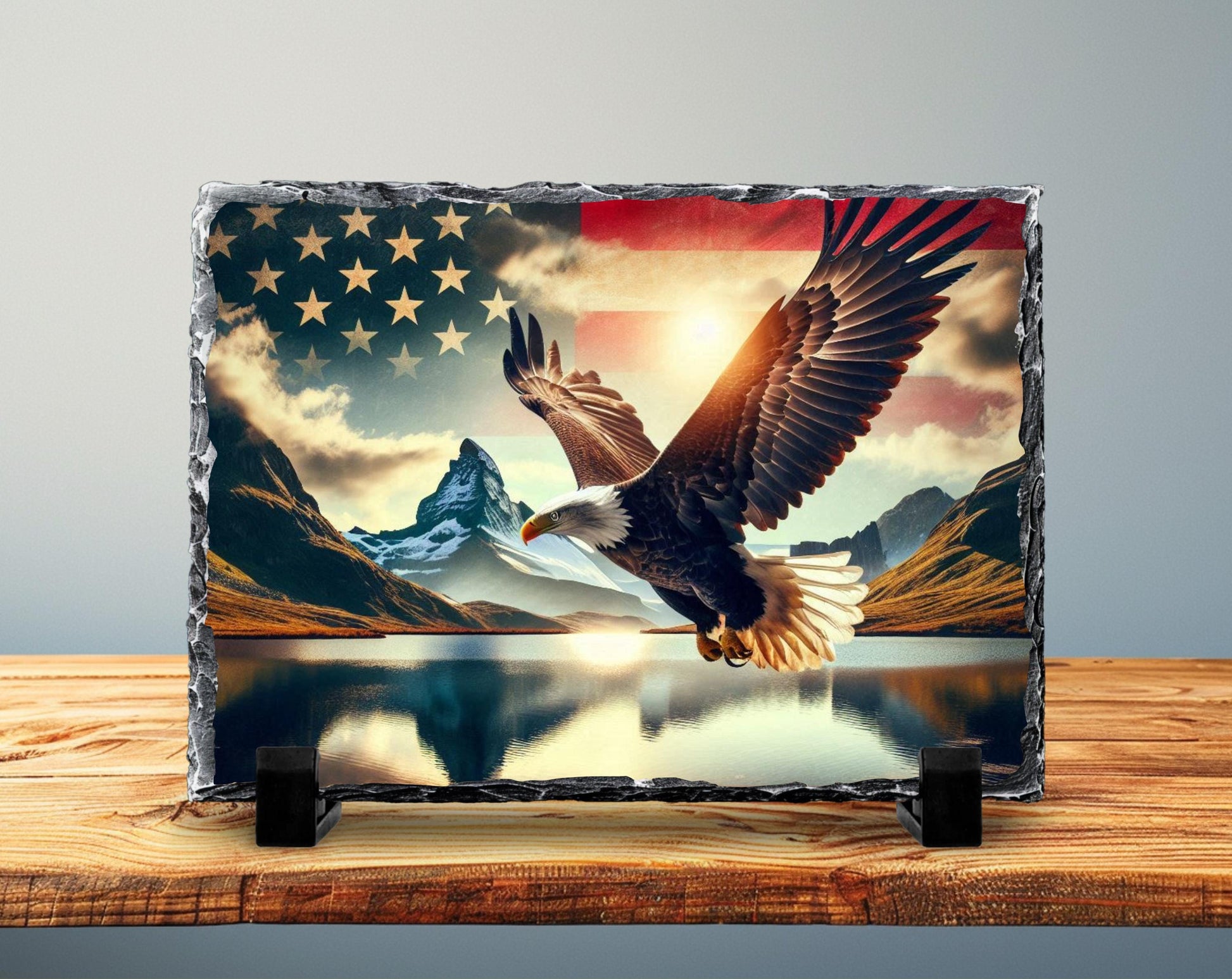 Patriotic Slate Sign - Bald Eagle Decor With American Flag Art & Mountain Lake
