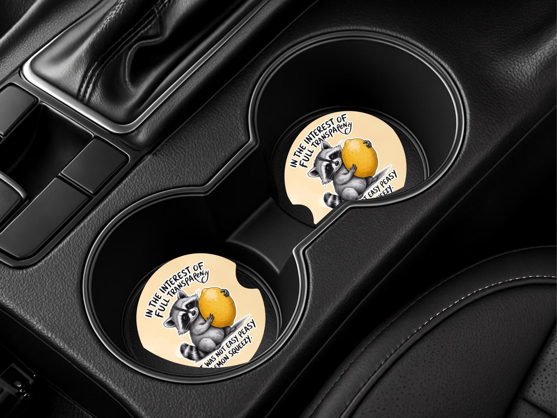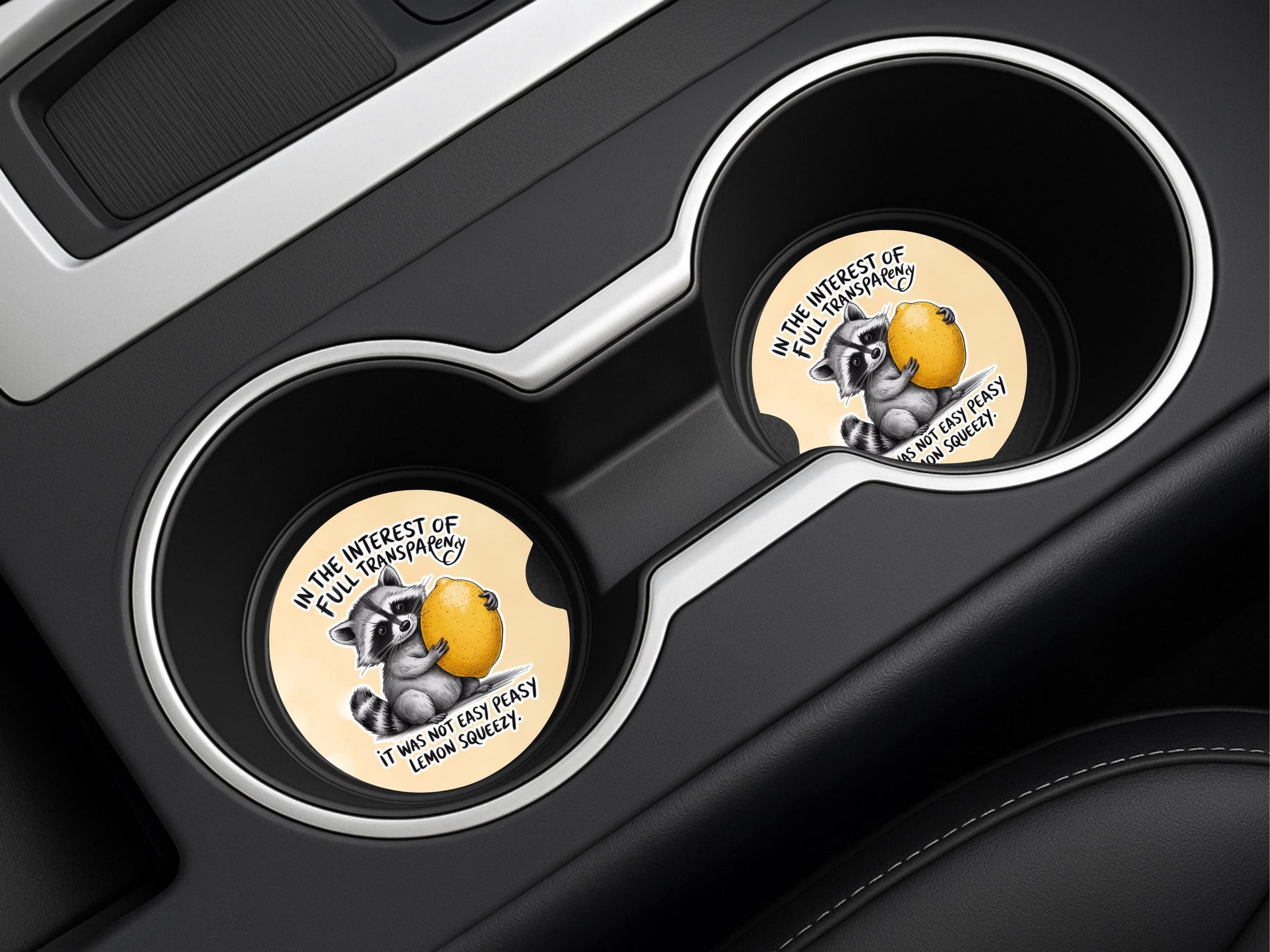 Add a playful touch to your vehicle with this delightful set of two sandstone car coasters, each adorned with a charming raccoon design and a whimsical lemon quote. Measuring 2.56 inches in diameter and 0.30 inches thick, these coasters are ideal for keeping your cup holders clean and dry. The quote reads, "In the interest of full transparency, it was not easy peasy lemon squeezy."