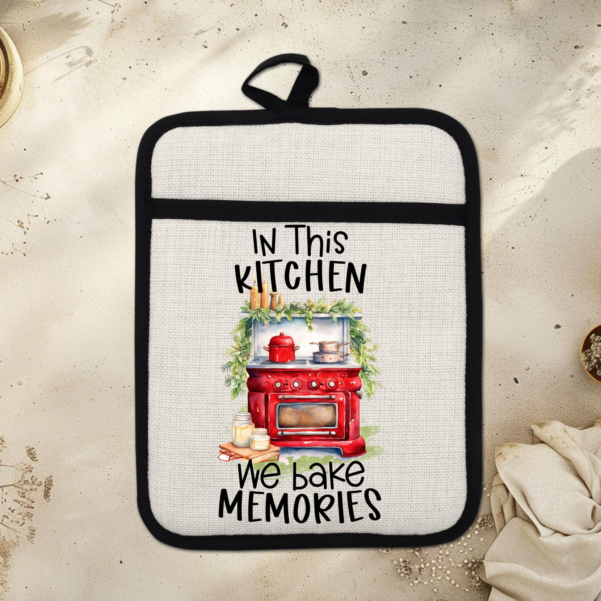 Red Farmhouse Oven Pot Holder - We Bake Memories Quote Rustic Linen Hot Pad for Christmas Kitchen Decor Holiday Gifts