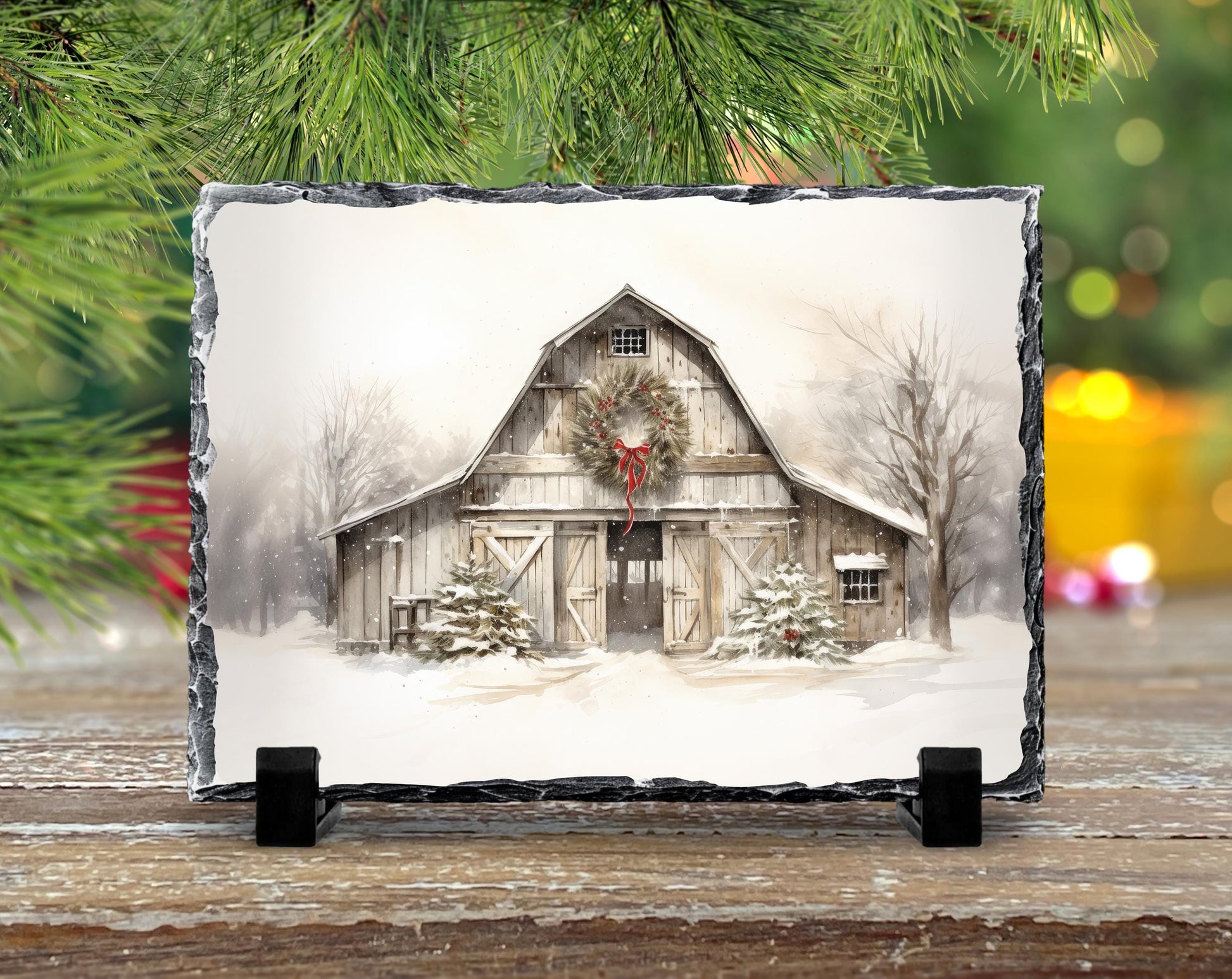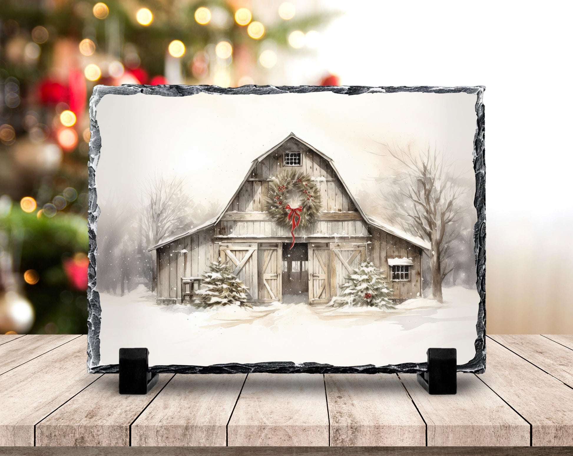 Rustic Christmas Slate Plaque with Barn Scene Wreath Snow Perfect Holiday Decor Gift