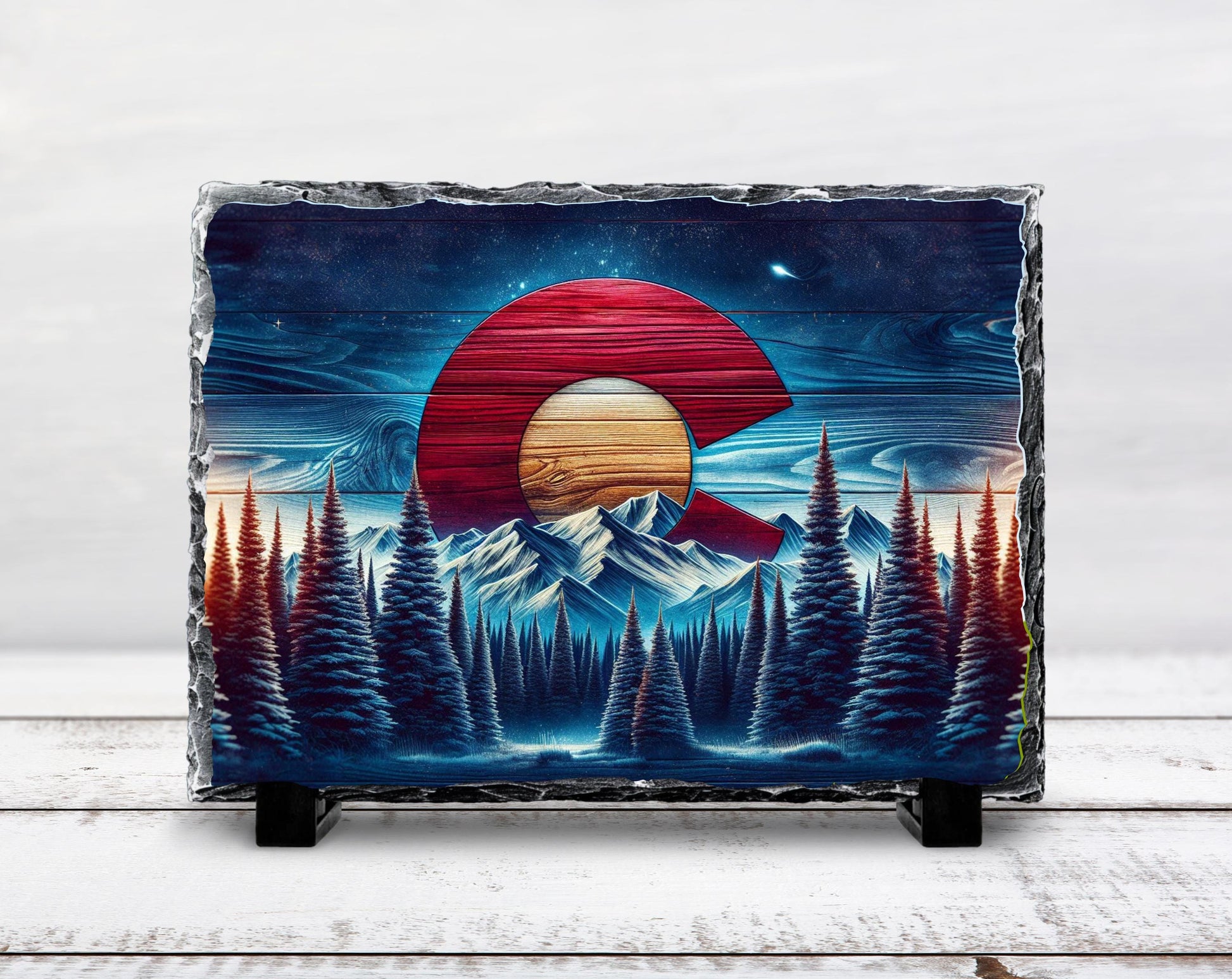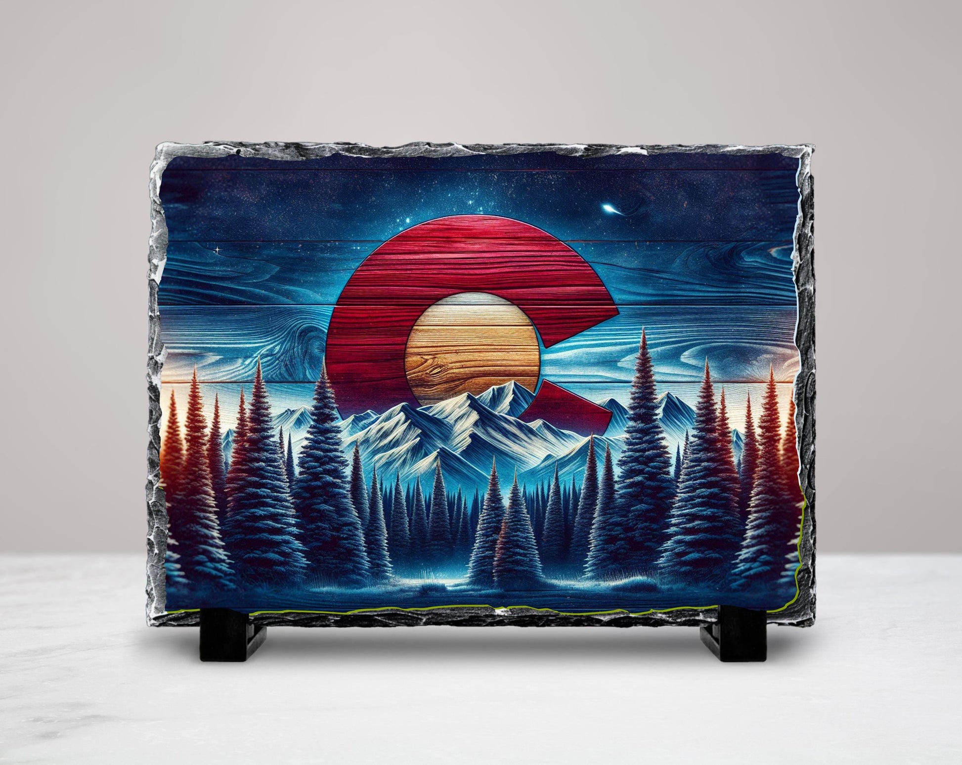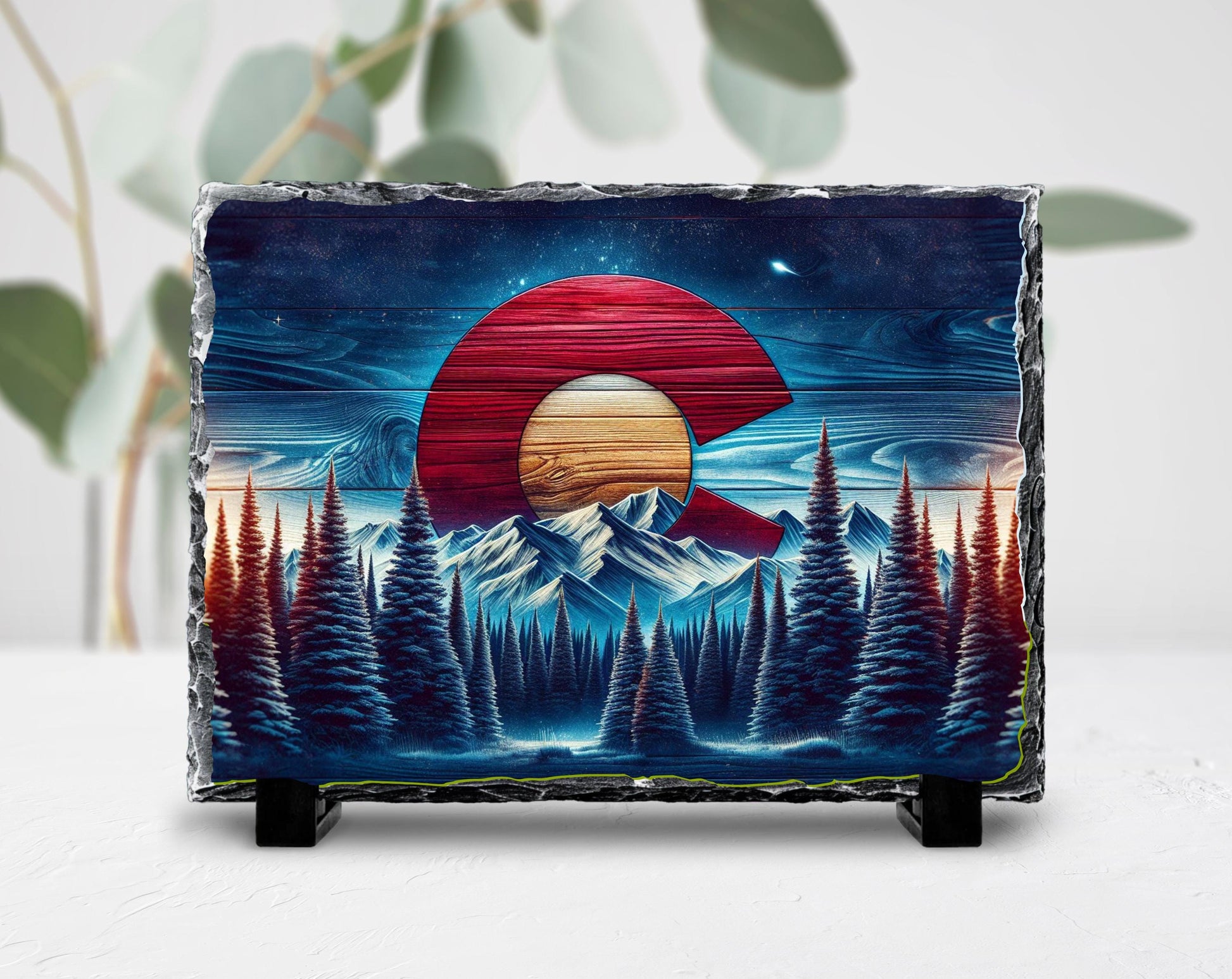 This rustic slate plaque is a perfect piece of Colorado mountain decor that brings the rugged beauty of the outdoors into your home. Measuring 5.8 x 7.8 inches, this handcrafted slate wall art features a bold Colorado “C” emblem layered over an alpine landscape art design, capturing the essence of natural slate stone and evergreen forest art. Designed as a tabletop display decor, it offers a unique mountain home gift that adds rustic cabin plaque charm to any space.
