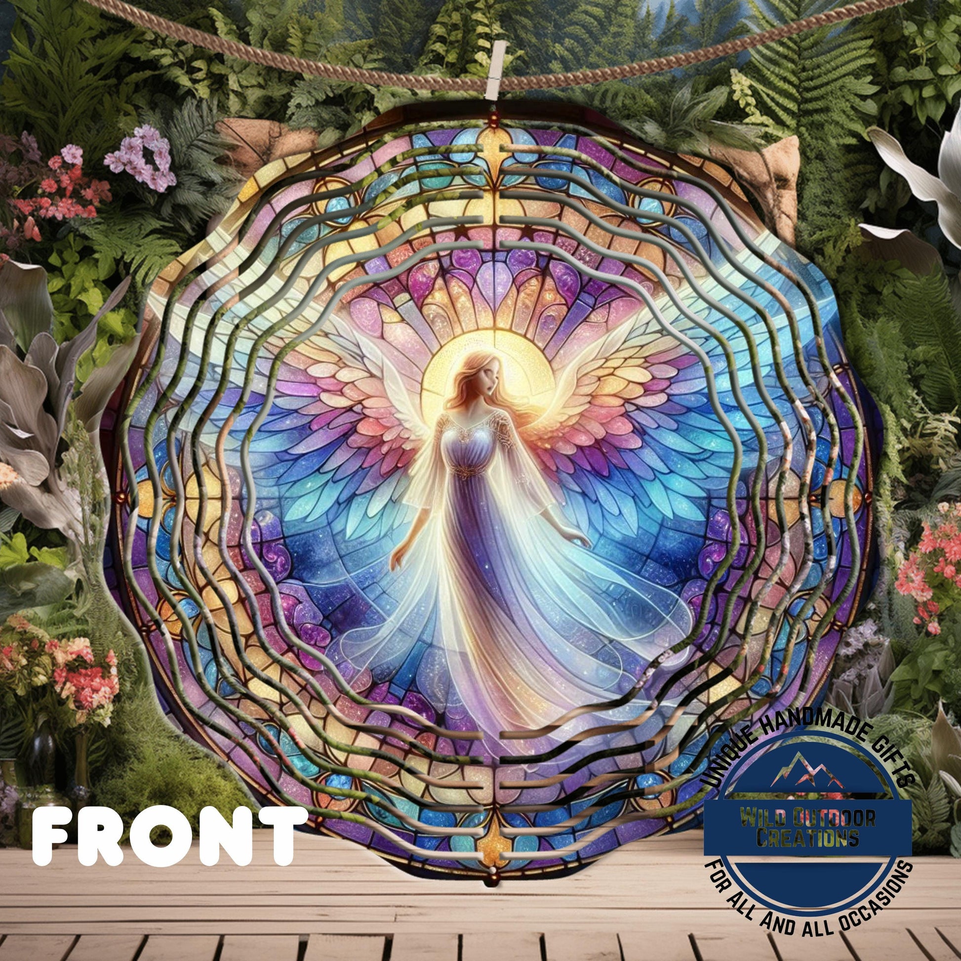 This angel wind spinner ships flat in bubble wrap with easy instructions on how to fan out the spinner for display. Whether placed in your garden, on your patio, or inside your home, this piece adds a heavenly touch wherever it spins. Explore additional designs in our shop or contact us for custom creations tailored to your vision.