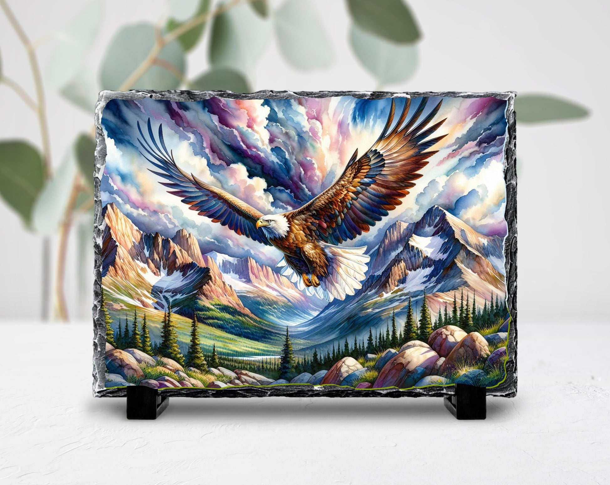 Embrace the spirit of freedom and the beauty of the wilderness with this handcrafted slate plaque, showcasing a stunning watercolor depiction of an eagle soaring gracefully over a majestic mountain valley. This artwork captures the essence of strength and serenity, making it an ideal addition to cabins, lodges, or any space that celebrates the great outdoors.