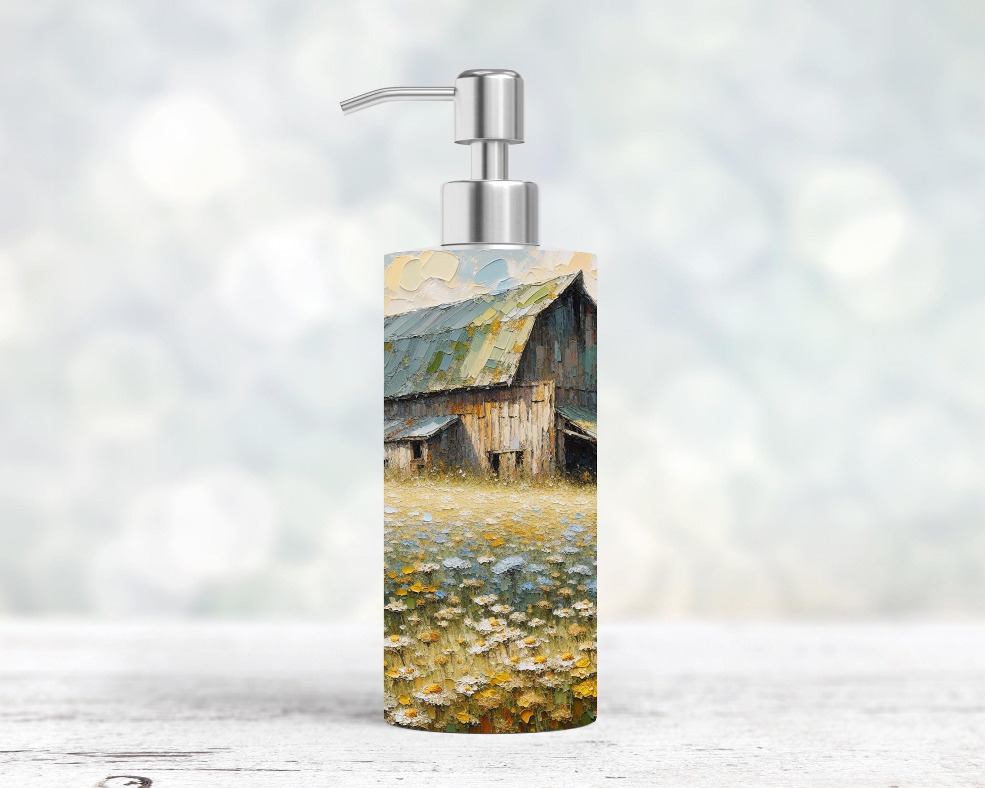 Bring the warmth of the countryside into your home with this charming 18oz stainless steel barrel soap and lotion dispenser. Adorned with a lovely watercolor illustration of a yellow and white wildflower meadow, complemented by a rustic old barn in the background, this piece seamlessly combines functionality with farmhouse-inspired artistry. Ideal for kitchen sinks, bathrooms, or laundry rooms, this versatile dispenser is suitable for liquid soap, hand sanitizer, or lotion.